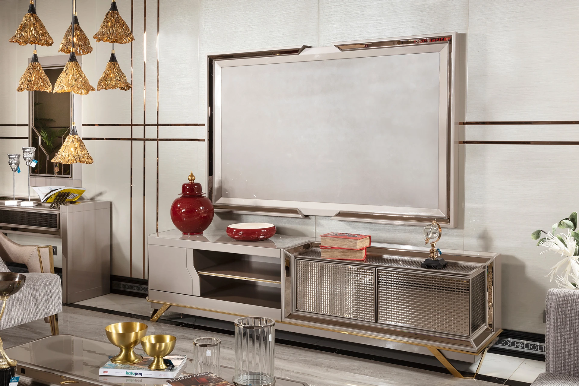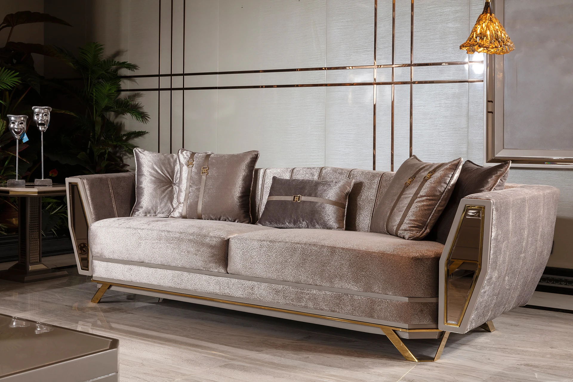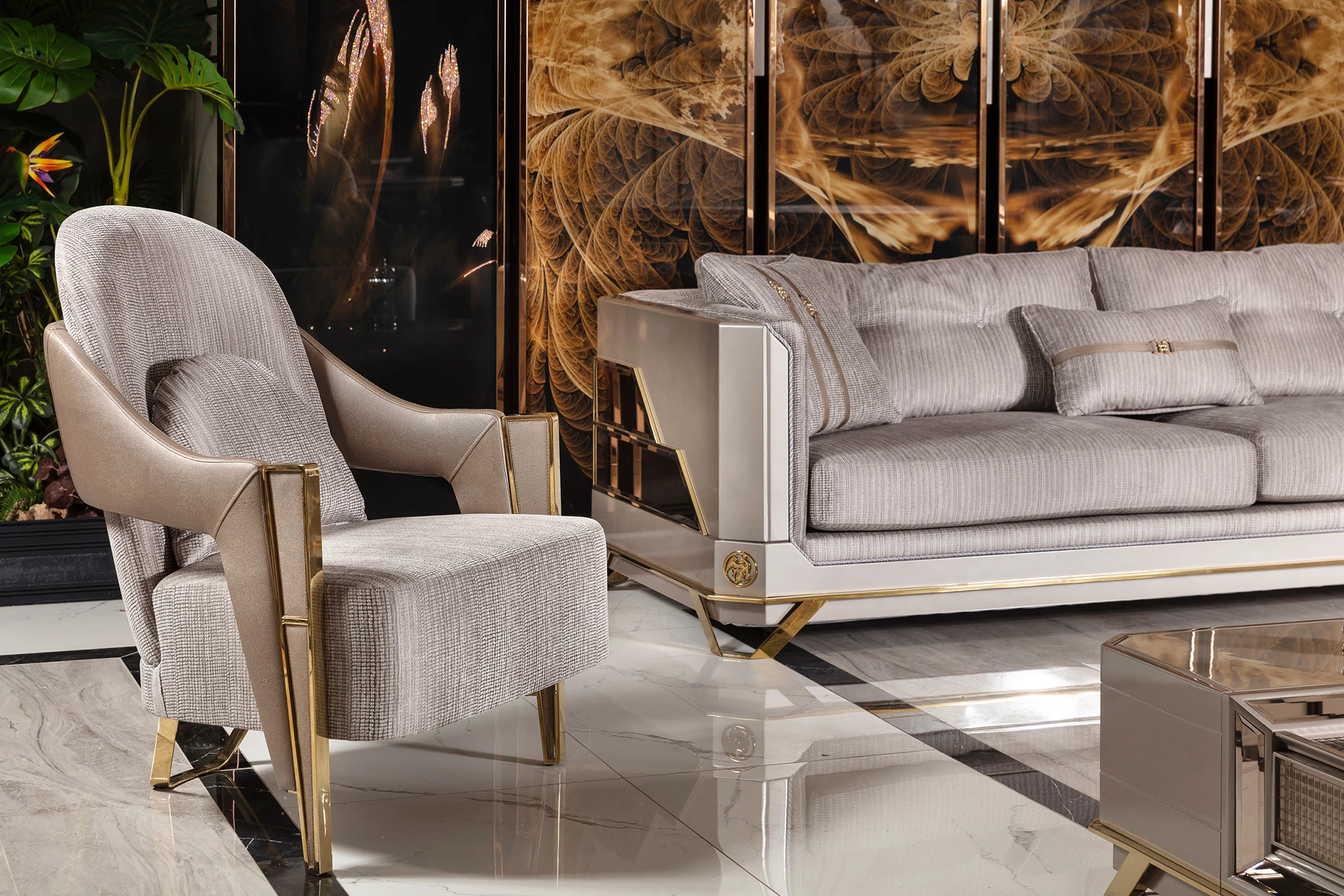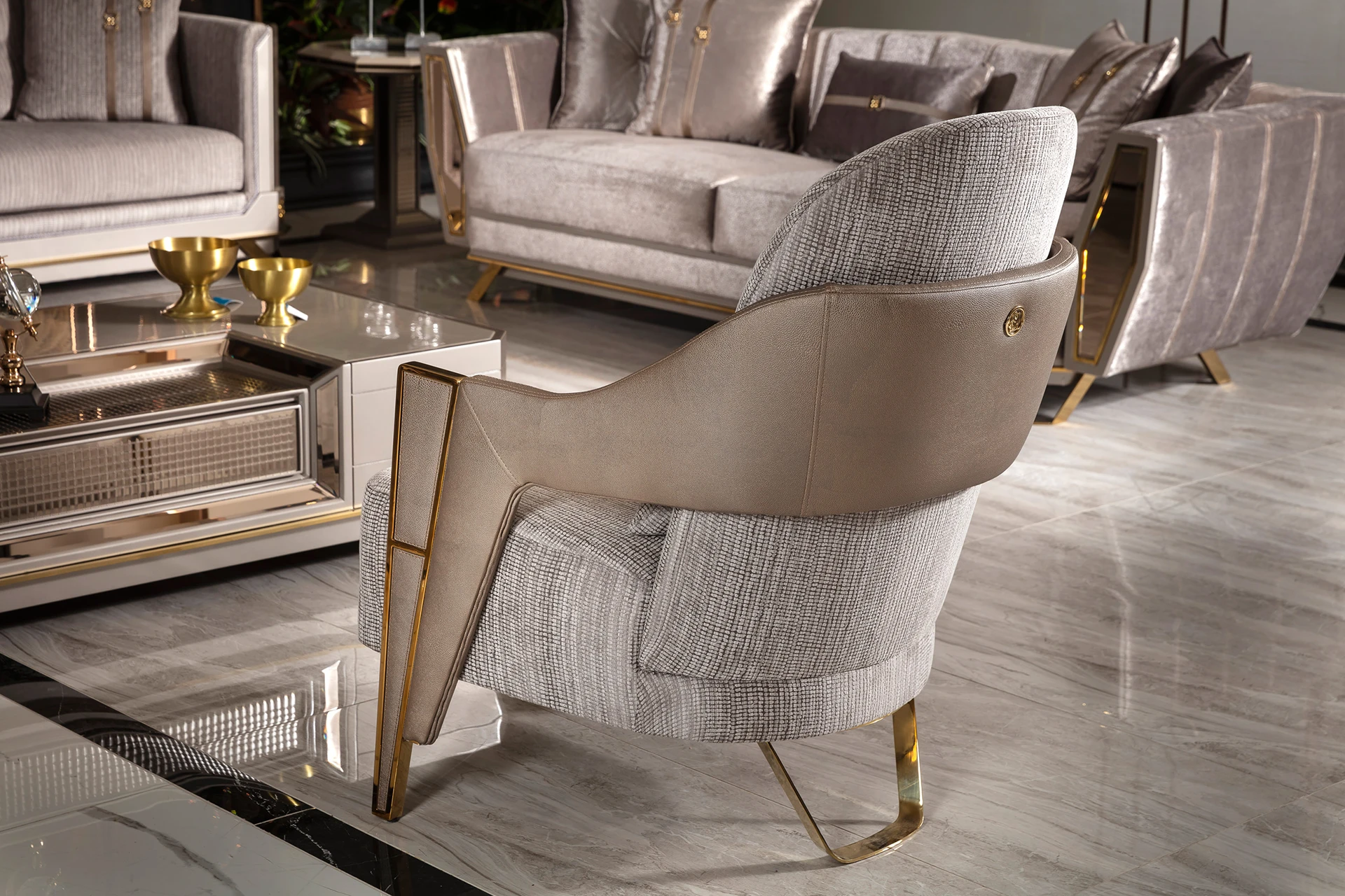 The Ares sofa set is a masterpiece of contemporary luxury, designed to elevate any living space. Its sleek lines and plush upholstery offer a sophisticated yet inviting ambiance. The sofas are crafted with a blend of high-quality fabrics and polished metal accents, adding a touch of modern elegance. The armchairs boast a unique design, providing both style and comfort. A matching coffee table with a glossy finish completes the set, offering a seamless blend of function and style. Transform your living room into a haven of comfort and class with the Ares sofa set.