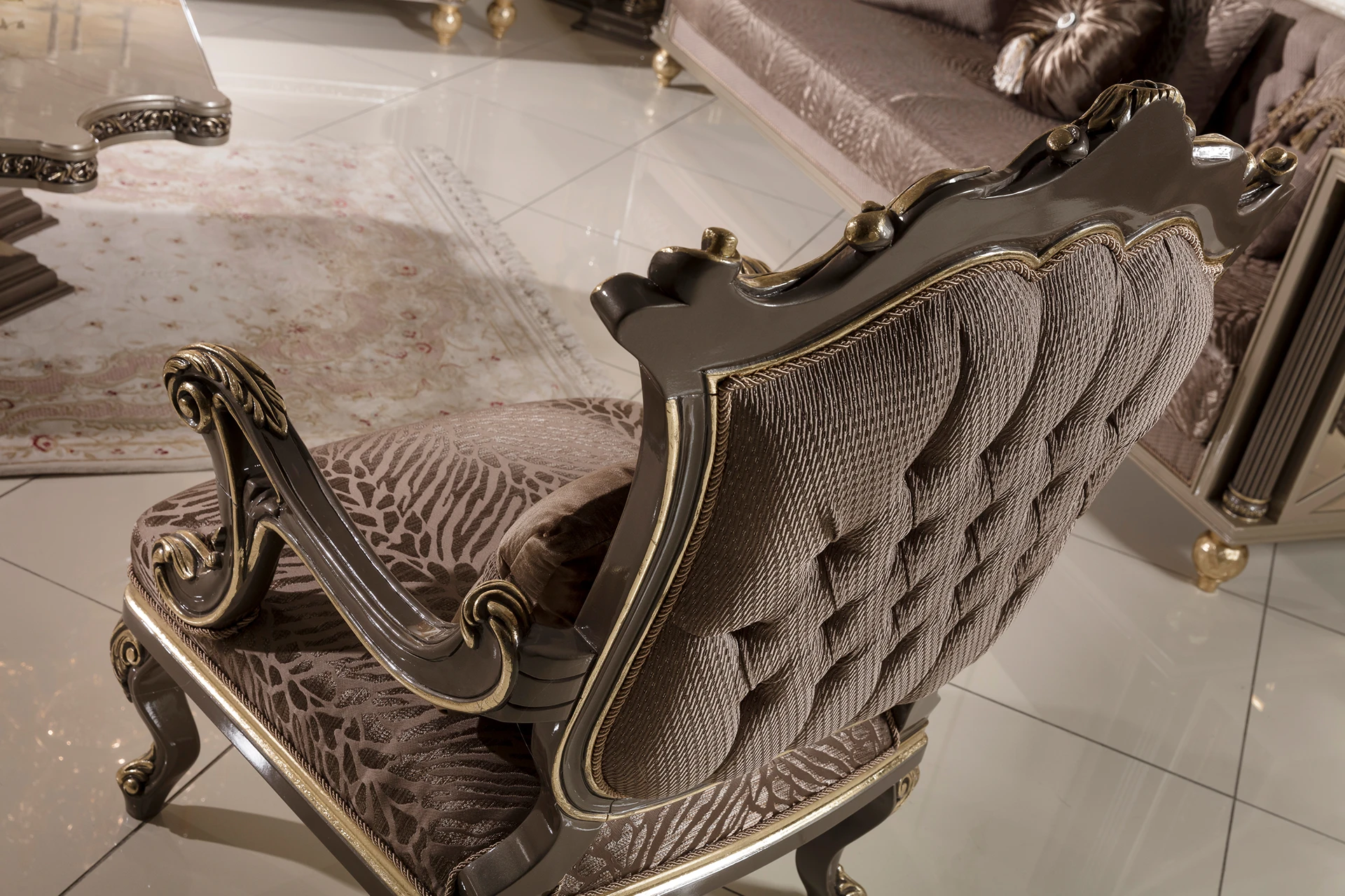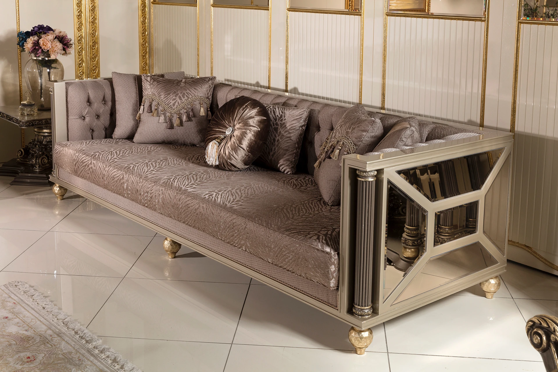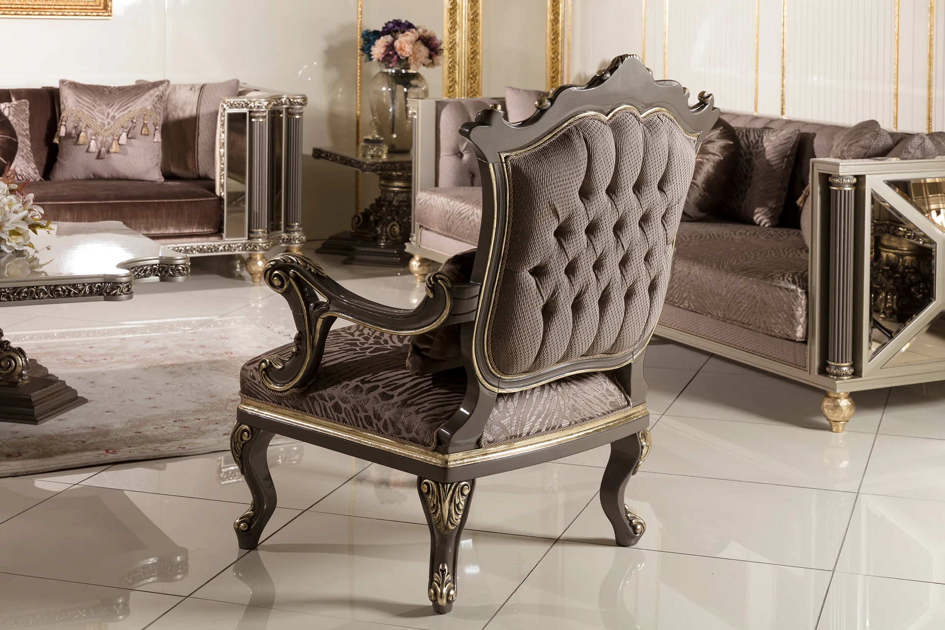 The Asera sofa set showcases a blend of modern elegance and timeless luxury. The sofas, with their deep seats and plush cushions, are designed for comfort while featuring intricate detailing on the armrests and frames that add an element of grandeur. The accompanying armchairs perfectly complement the set, offering a regal seating option. The central coffee table, with its polished top and ornate base, serves as a sophisticated focal point. This set is perfect for creating a luxurious yet inviting living space.