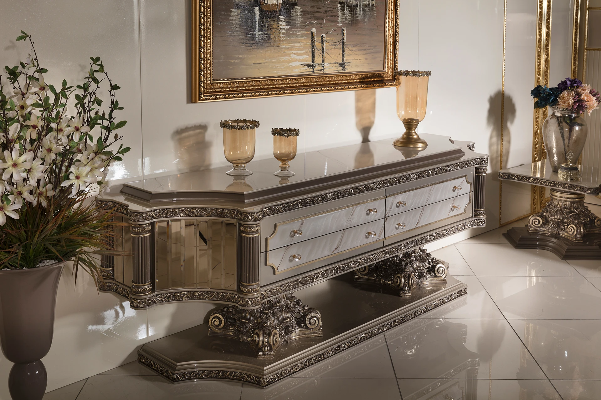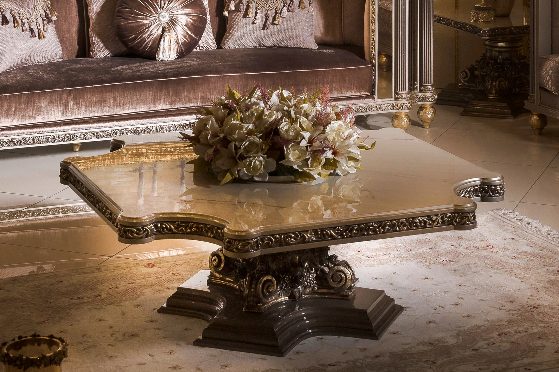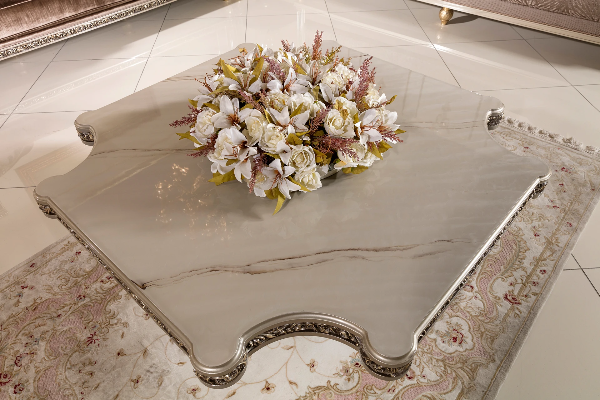 The Asera sofa set showcases a blend of modern elegance and timeless luxury. The sofas, with their deep seats and plush cushions, are designed for comfort while featuring intricate detailing on the armrests and frames that add an element of grandeur. The accompanying armchairs perfectly complement the set, offering a regal seating option. The central coffee table, with its polished top and ornate base, serves as a sophisticated focal point. This set is perfect for creating a luxurious yet inviting living space.