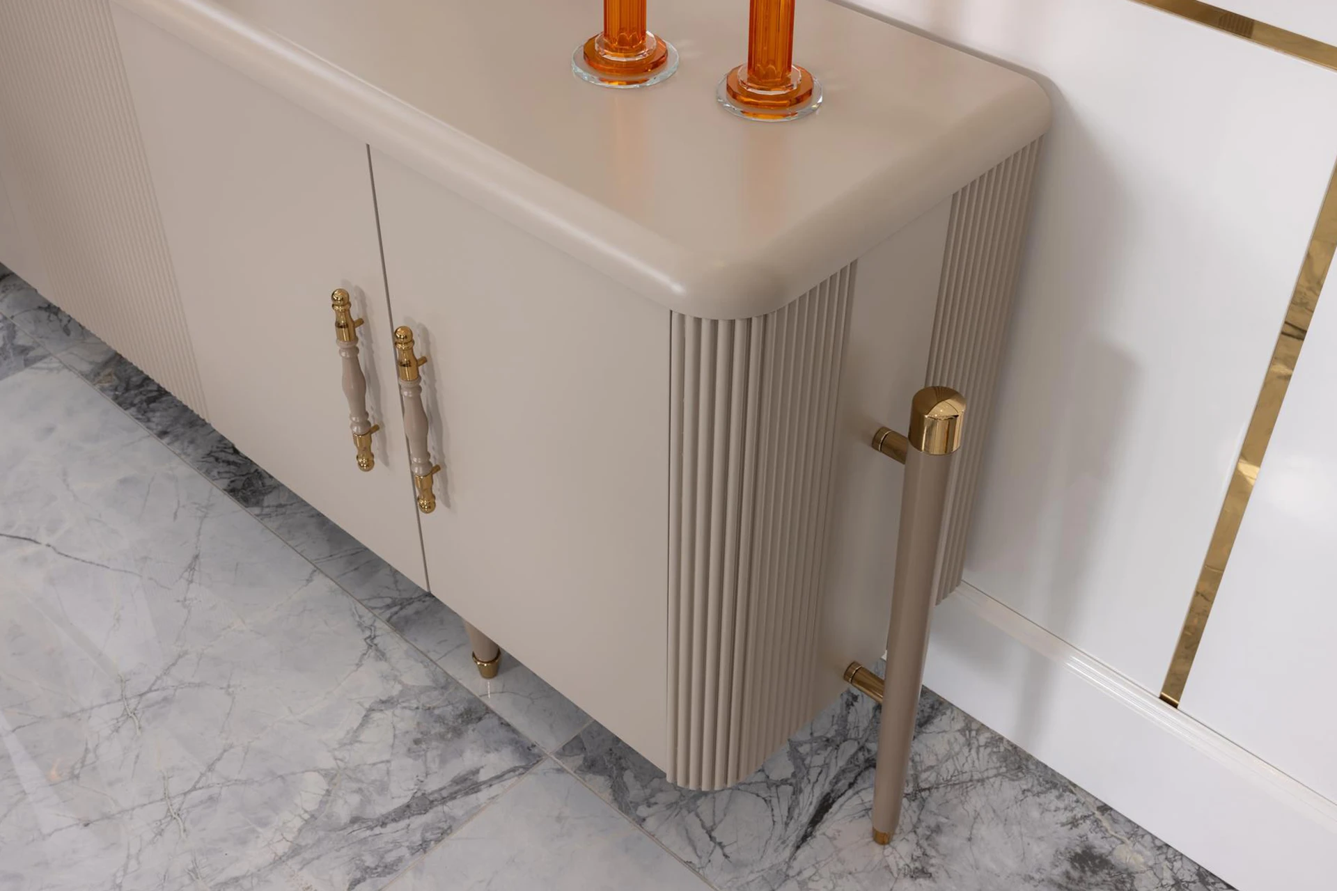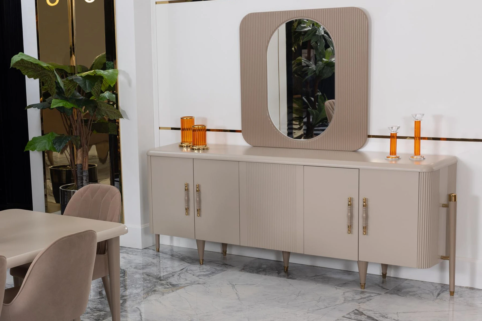 The Asos dining room set showcases a refined blend of contemporary design and subtle elegance. The table features a smooth, seamless surface supported by sleek, tapered legs, adding a modern touch to the space. Its accompanying chairs are ergonomically designed, with plush upholstery that ensures comfort during extended gatherings. The muted, neutral tones of the set harmonize effortlessly with a variety of interior styles, while the buffet offers ample storage space, accentuated by its minimalist hardware and curved mirror. This dining set is perfect for those who seek a chic yet understated dining atmosphere.