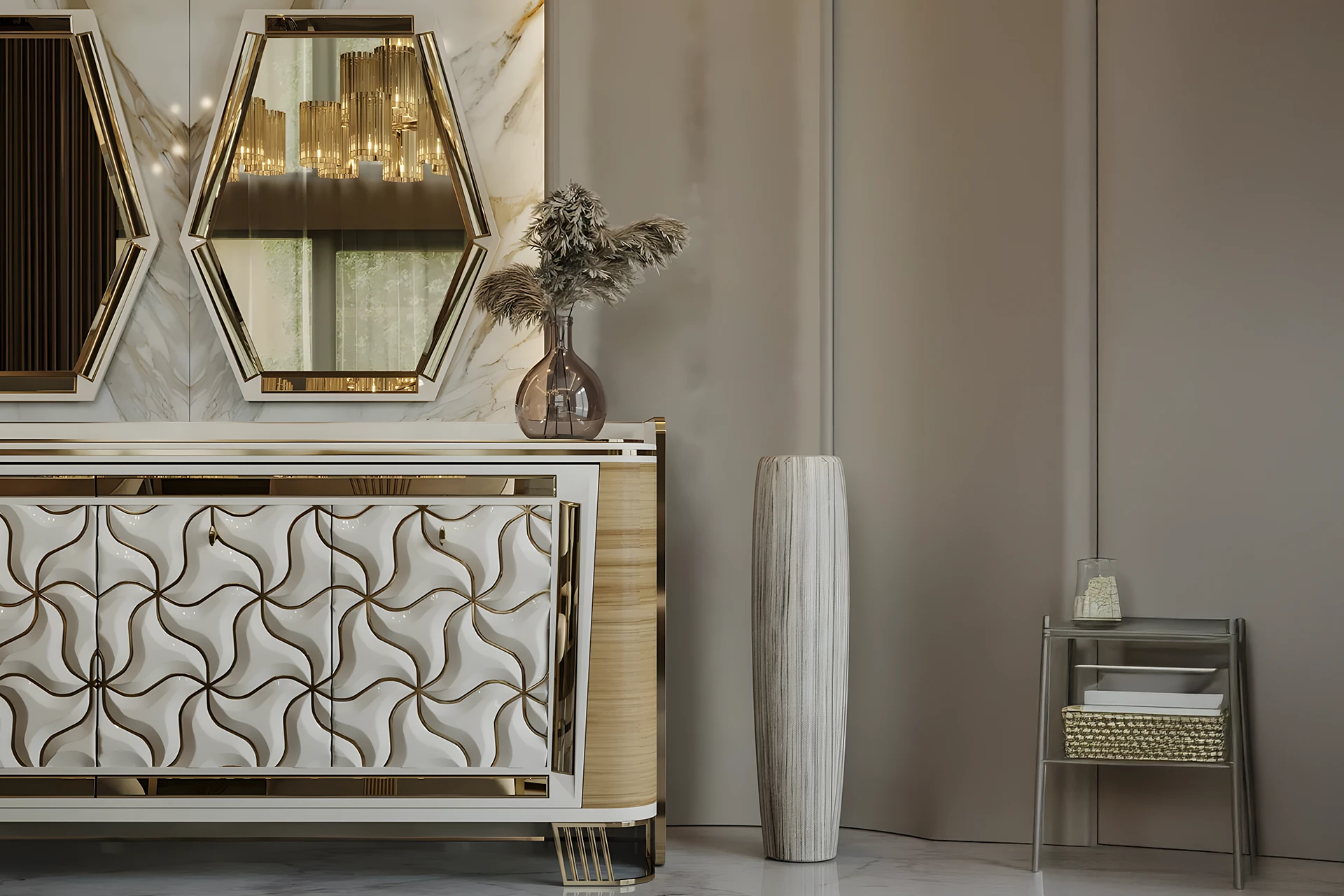 The Aston dining room set is a masterpiece of modern luxury, showcasing an exquisite combination of elegance and sophistication. The dining table, with its polished marble top and intricate gold detailing, exudes a timeless charm. The surrounding chairs, designed with sleek lines and upholstered in soft, plush fabric, provide a comfortable yet stylish seating experience. Highlighted by a stunning chandelier above, the entire set is framed by mirrors and shelving, adding depth and creating a sense of grandeur. Perfect for those who appreciate refined aesthetics in their dining space.