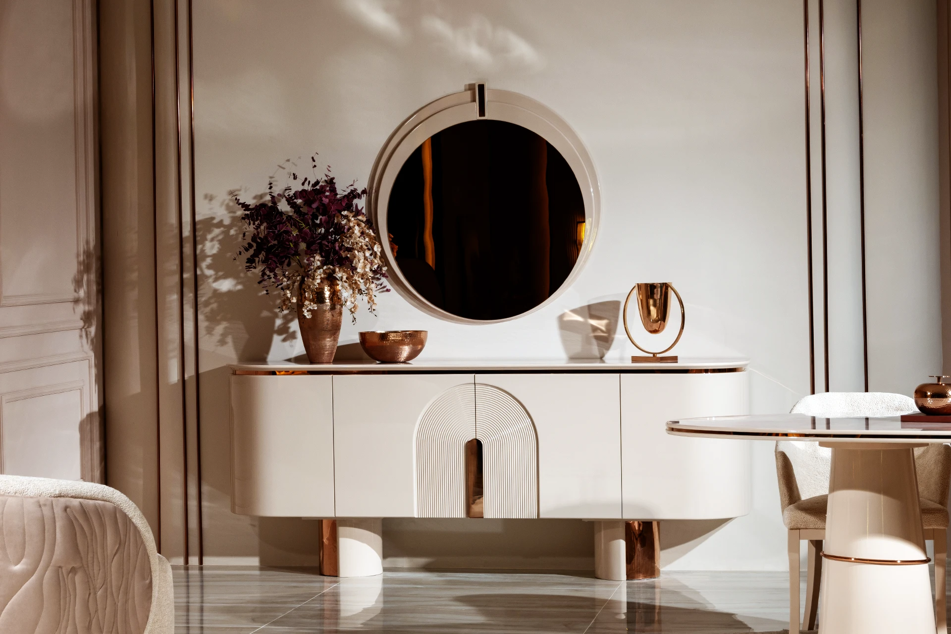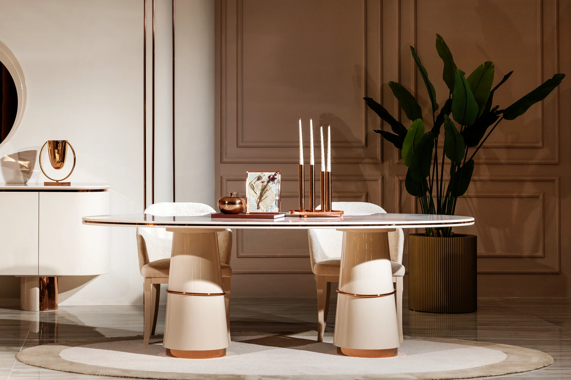 The Aura dining room set blends contemporary elegance with artistic flair, making it the perfect centerpiece for any modern home. Featuring a stunning marble-patterned tabletop, this dining set offers both sophistication and durability. The sleek, rounded edges of the table and chairs add a soft yet polished aesthetic, while the subtle gold accents provide a touch of luxury without overpowering the design. Ideal for intimate dinners or entertaining guests, the aura dining room set combines form and function seamlessly, elevating your dining experience to a whole new level.