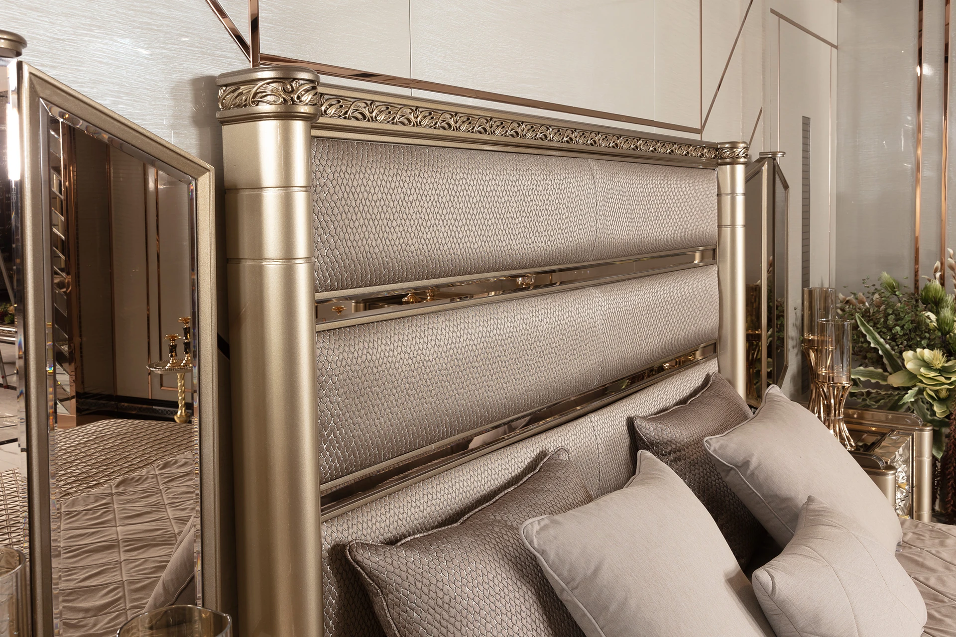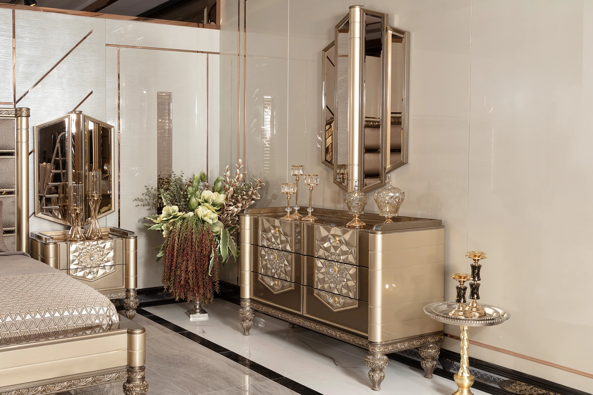 The Bacarat bedroom set is the epitome of luxury and timeless elegance. Crafted with a stunning golden finish, it radiates opulence and sophistication. The grand headboard, adorned with exquisite detailing, becomes the focal point of the room, while the intricately designed nightstands and dresser add a sense of harmony and balance. The plush textures and reflective surfaces create a serene yet lavish atmosphere, perfect for unwinding in style. With its meticulous craftsmanship and luxurious materials, the Bacarat bedroom set transforms any space into a refined sanctuary, making it a masterpiece for those who appreciate classic luxury.