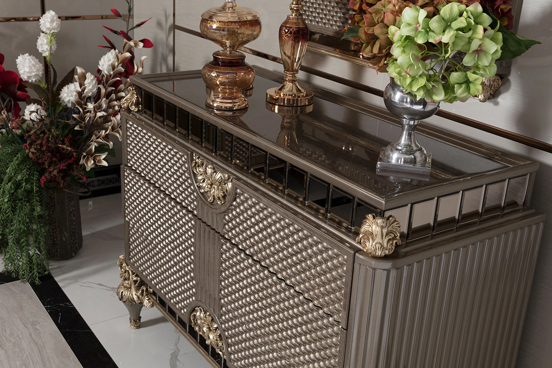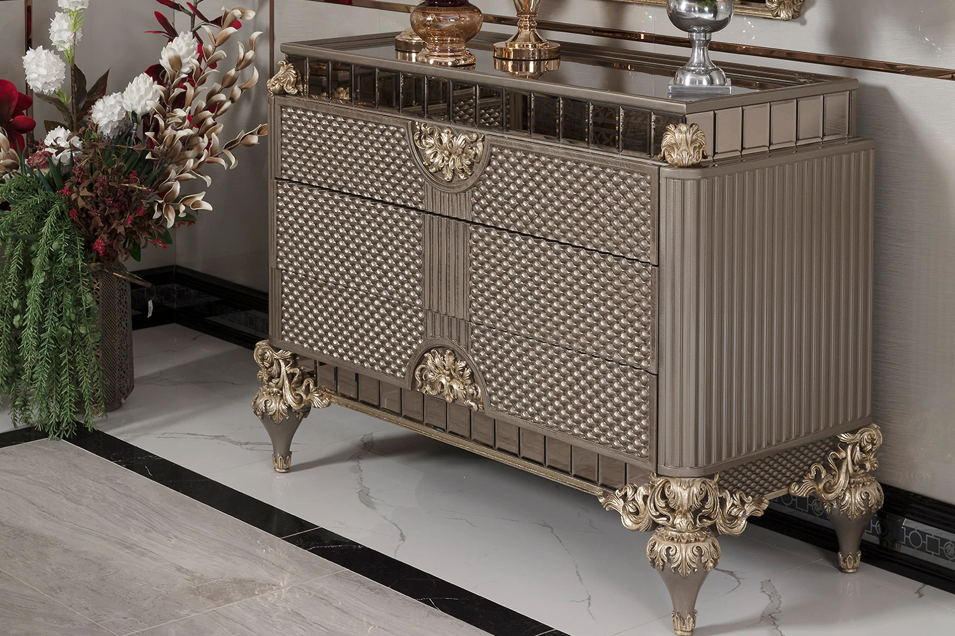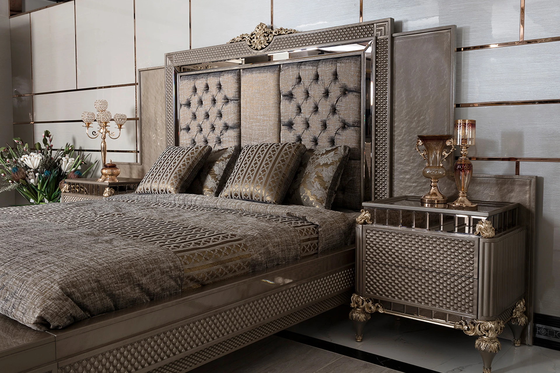 The Bella bedroom set from the classic collection exudes an aura of grandeur and refinement. Its elegantly tufted headboard, framed with intricate carvings, serves as a striking focal point, adding a sense of luxury to the room. The rich textures and metallic accents enhance its timeless appeal, while the complementary nightstands and dresser offer both functionality and style. Crafted with meticulous attention to detail, this set transforms your bedroom into a sophisticated sanctuary. The Bella bedroom set is an ideal choice for those who seek a harmonious blend of comfort, elegance, and classic luxury in their space.