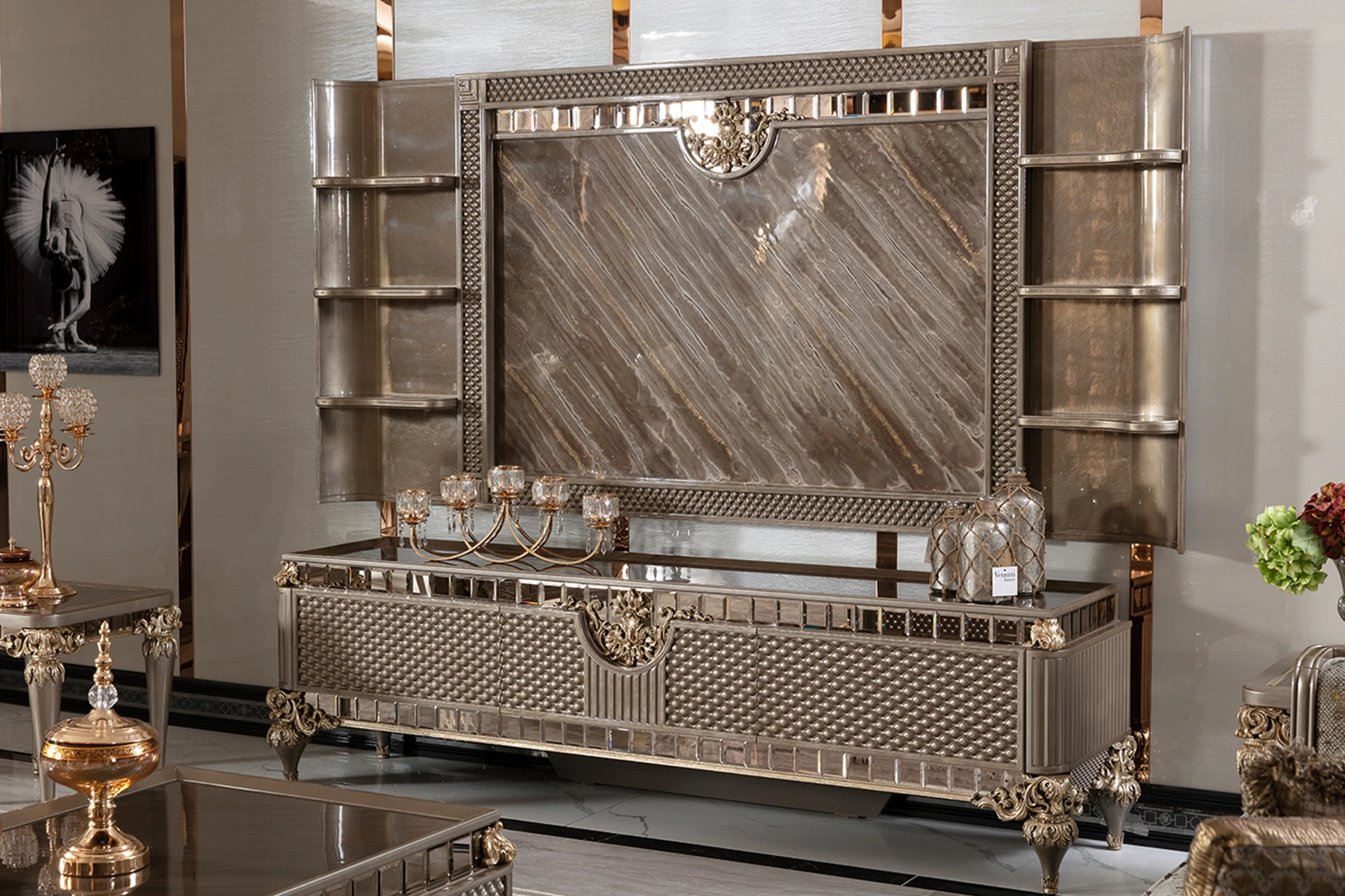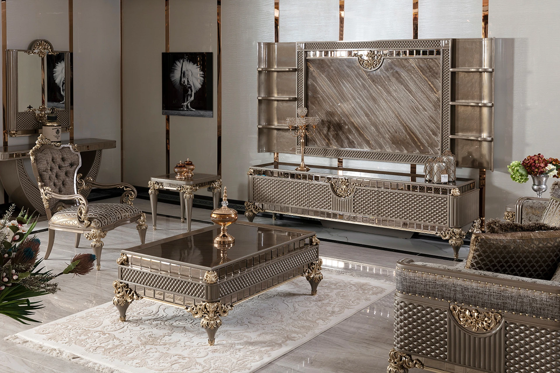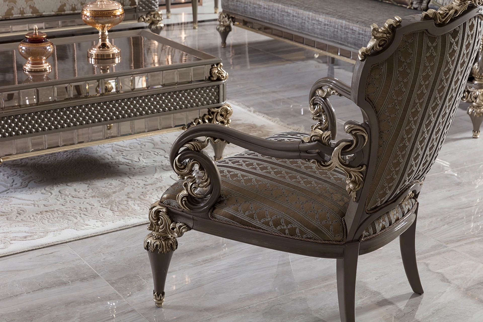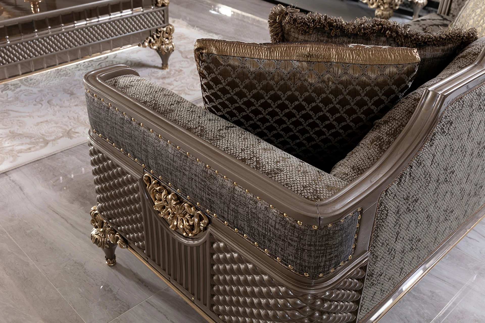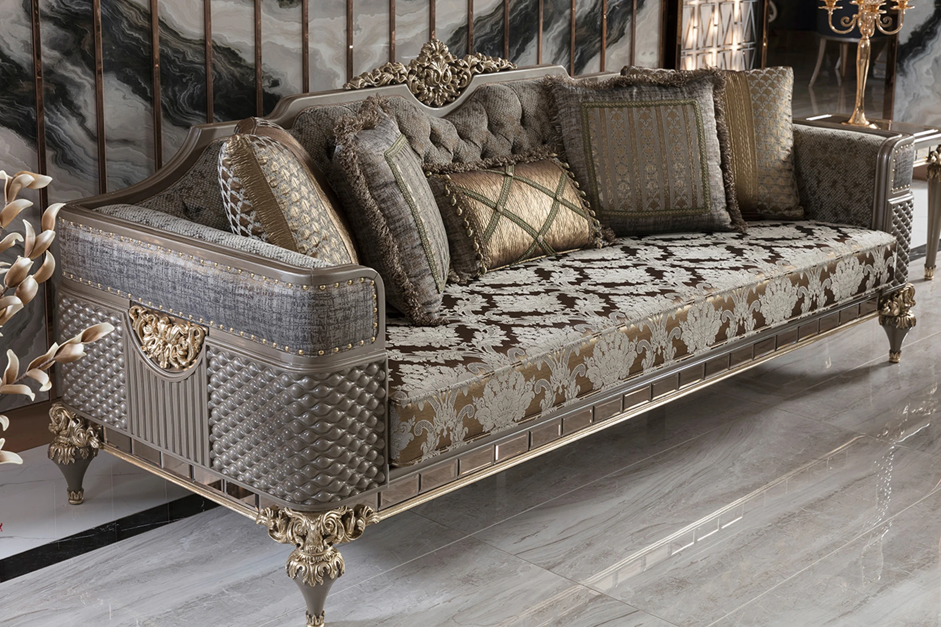 The Bella sofa set from the classic collection exudes regal elegance and timeless beauty. With its intricately carved frames and plush upholstery, it creates a luxurious ambiance in any living space. The deep-buttoned tufting and ornate detailing on the arms and legs showcase the set’s meticulous craftsmanship. Complemented by richly patterned cushions, this sofa set provides both comfort and sophistication. Its polished finish adds a touch of grandeur, making it perfect for both formal gatherings and relaxed lounging. The Bella sofa set stands as a testament to classic luxury, bringing an air of refinement to your home.