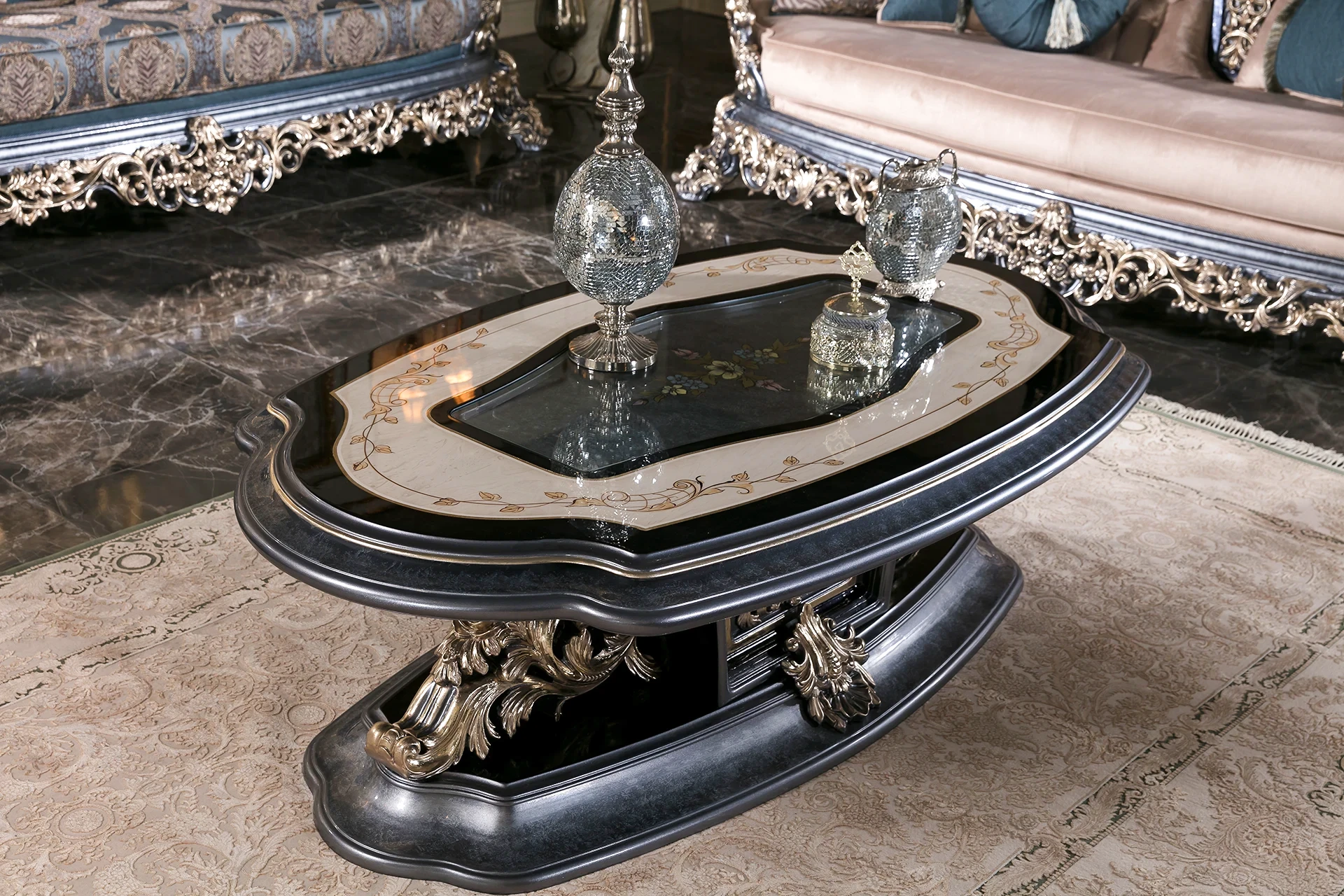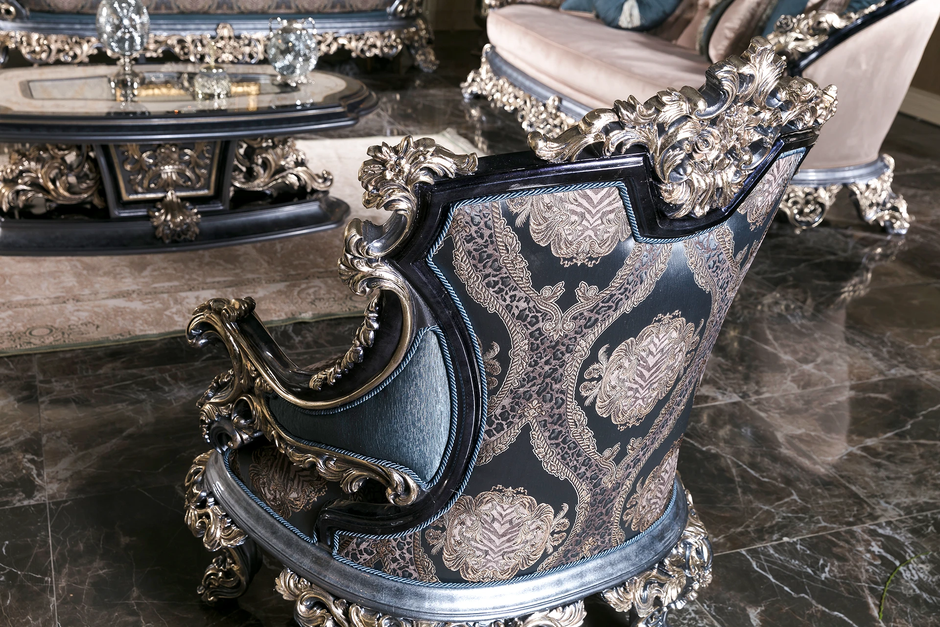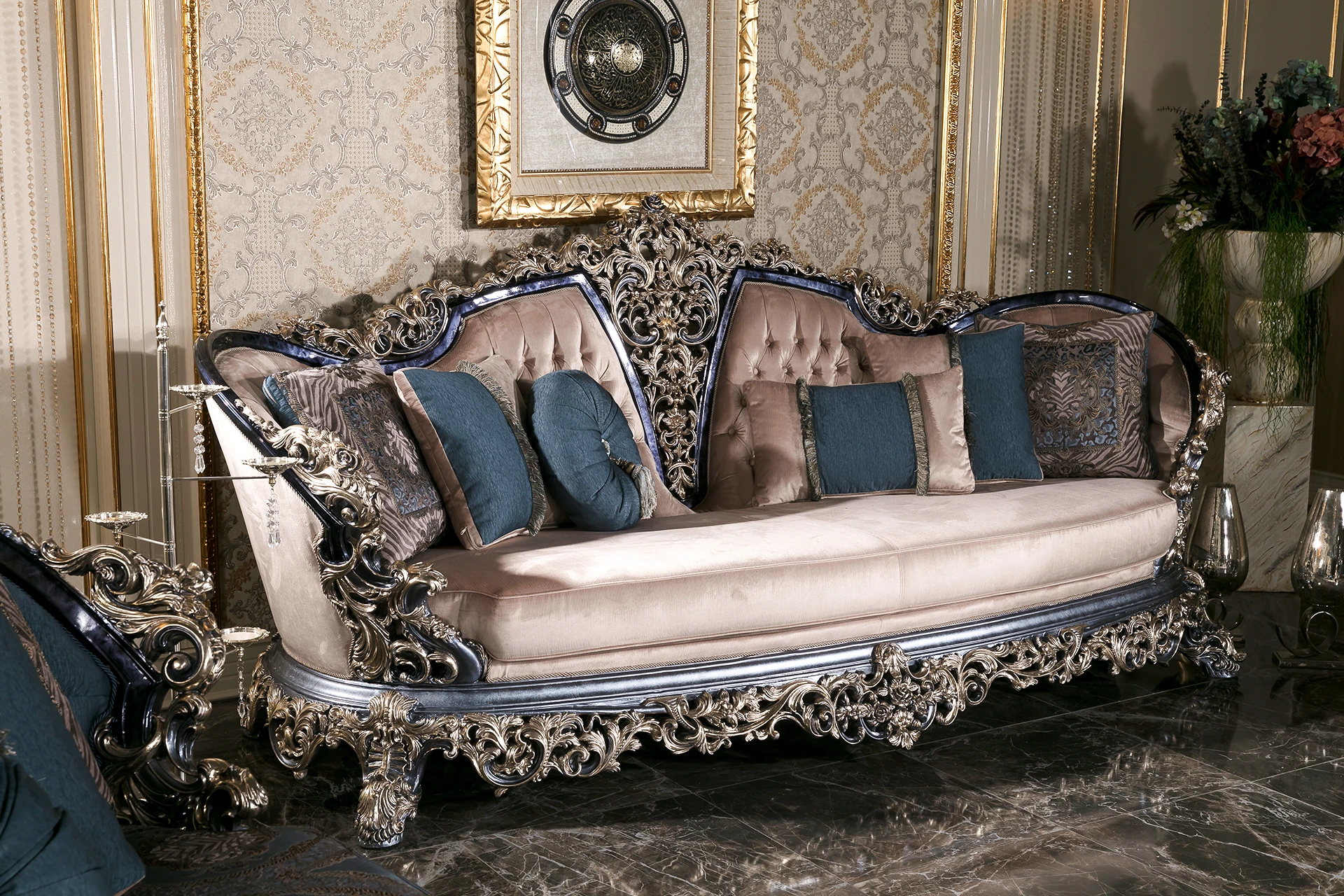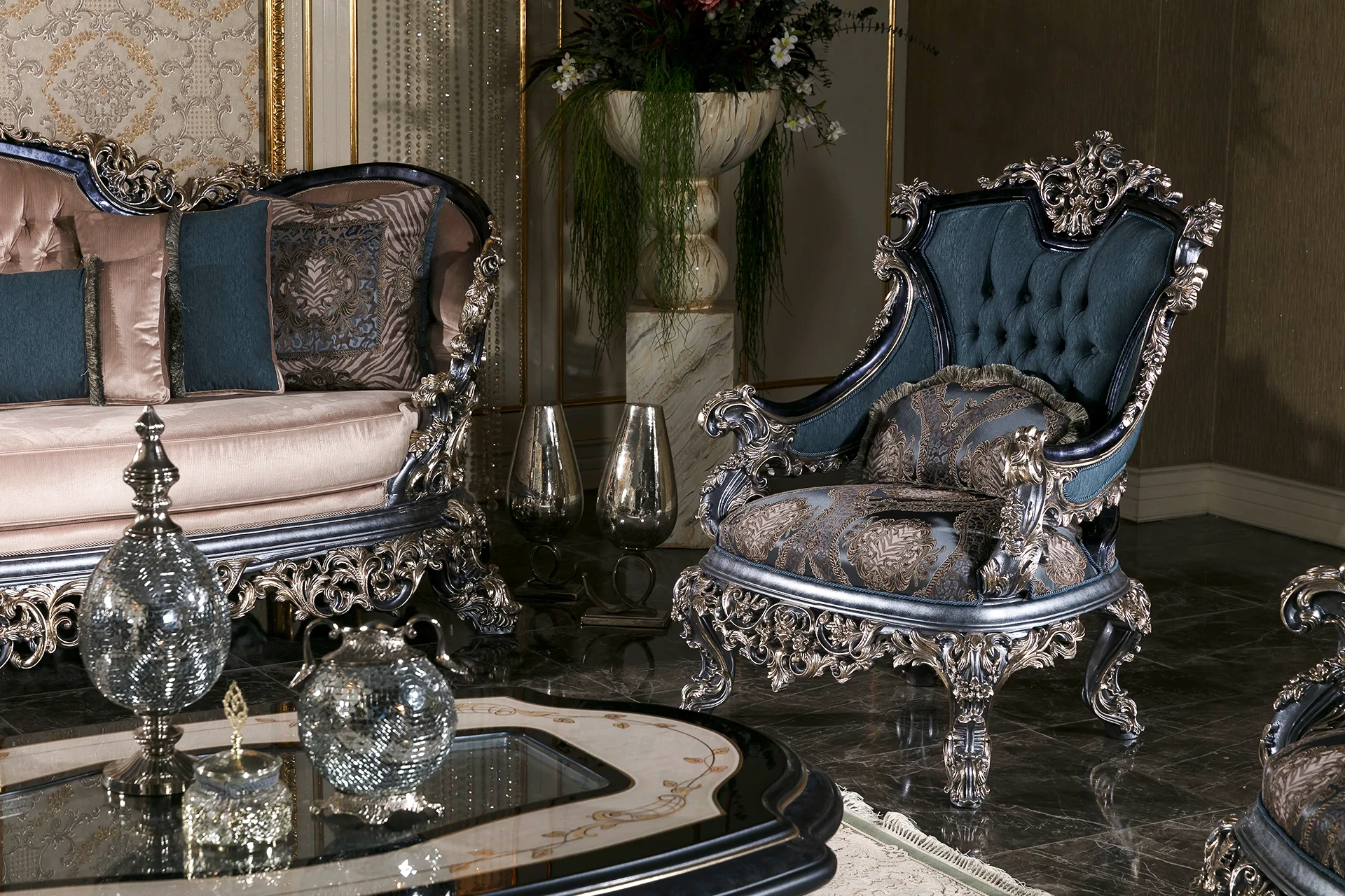 The Blue Cavalli sofa set is a masterpiece of elegance and luxury. With its striking blue upholstery, this set exudes a regal charm that is further enhanced by intricate silver carvings adorning its frame. The plush cushioning, combined with ornate detailing, offers both comfort and sophistication. This set includes a grand sofa, accompanied by equally exquisite armchairs that embody the classic opulence of traditional furniture design. Ideal for creating a lavish ambiance in your living room, the Blue Cavalli sofa set is perfect for those seeking to make a bold statement.