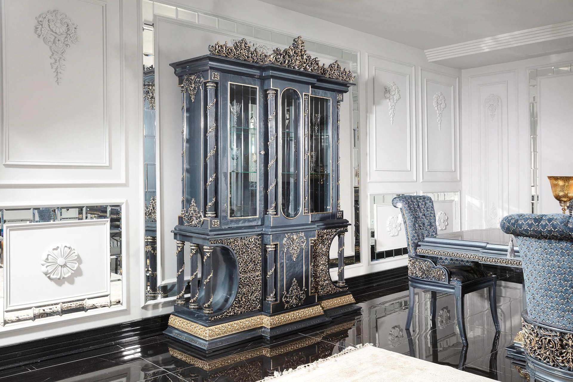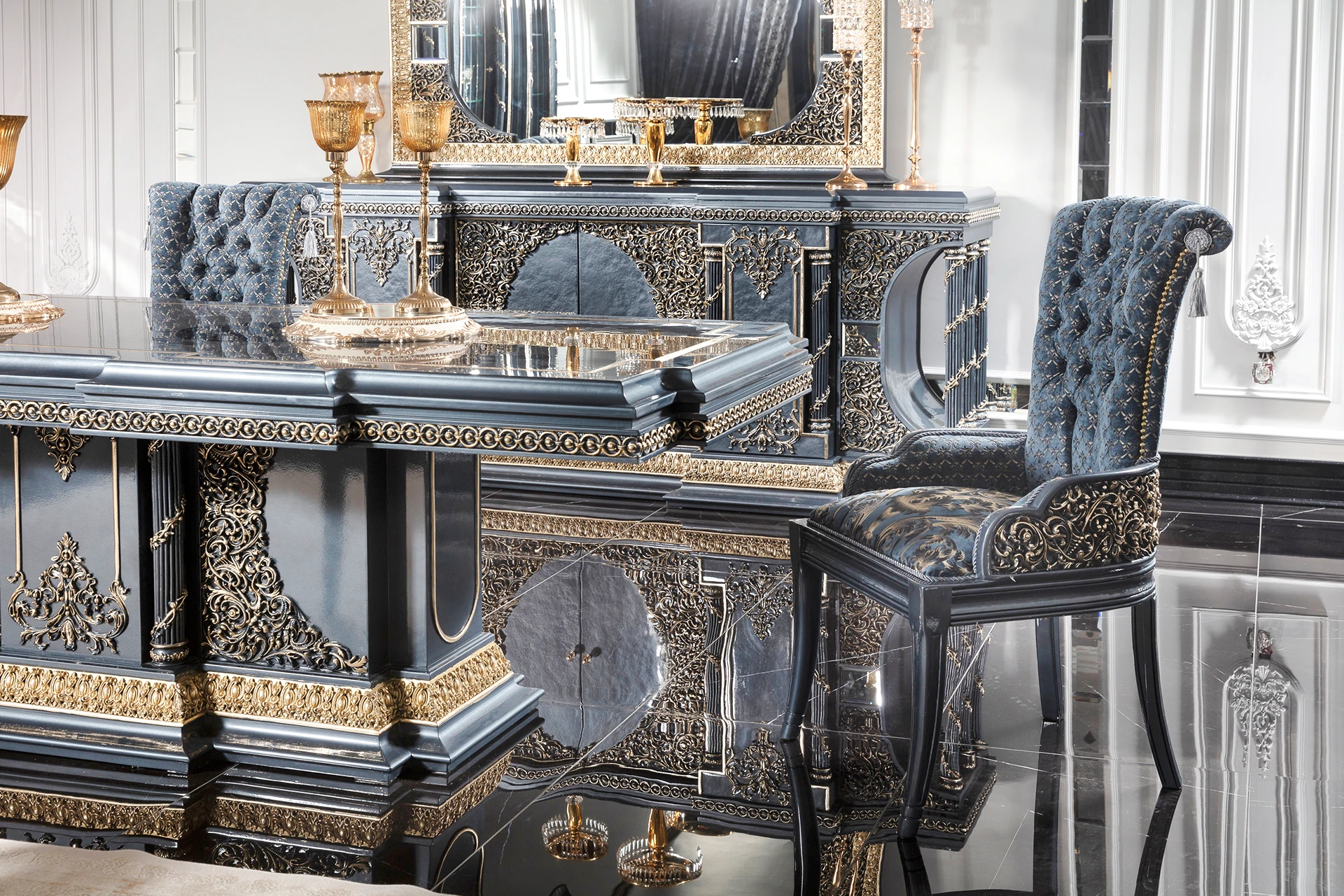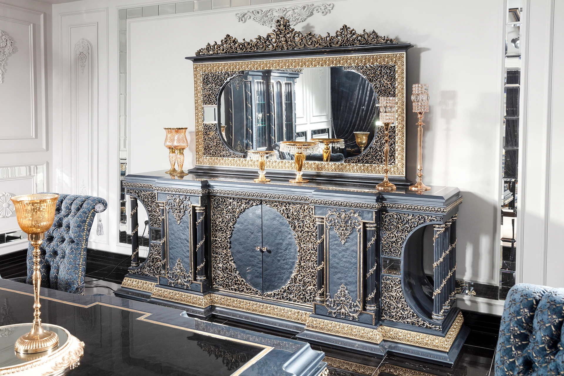 The Blue Hanzade dining room set exudes an air of regal elegance. The striking blue hue is complemented by intricate gold embellishments, adding a touch of luxury to the ensemble. The dining table features a robust design with a glossy surface, making it both functional and aesthetically pleasing. Each chair is upholstered with plush fabric, offering comfort while echoing the set’s ornate theme through detailed carvings on the backrests and legs. The accompanying buffet and glass-fronted cabinet provide ample storage, adorned with matching gold accents. This set is ideal for creating a sophisticated dining experience.
