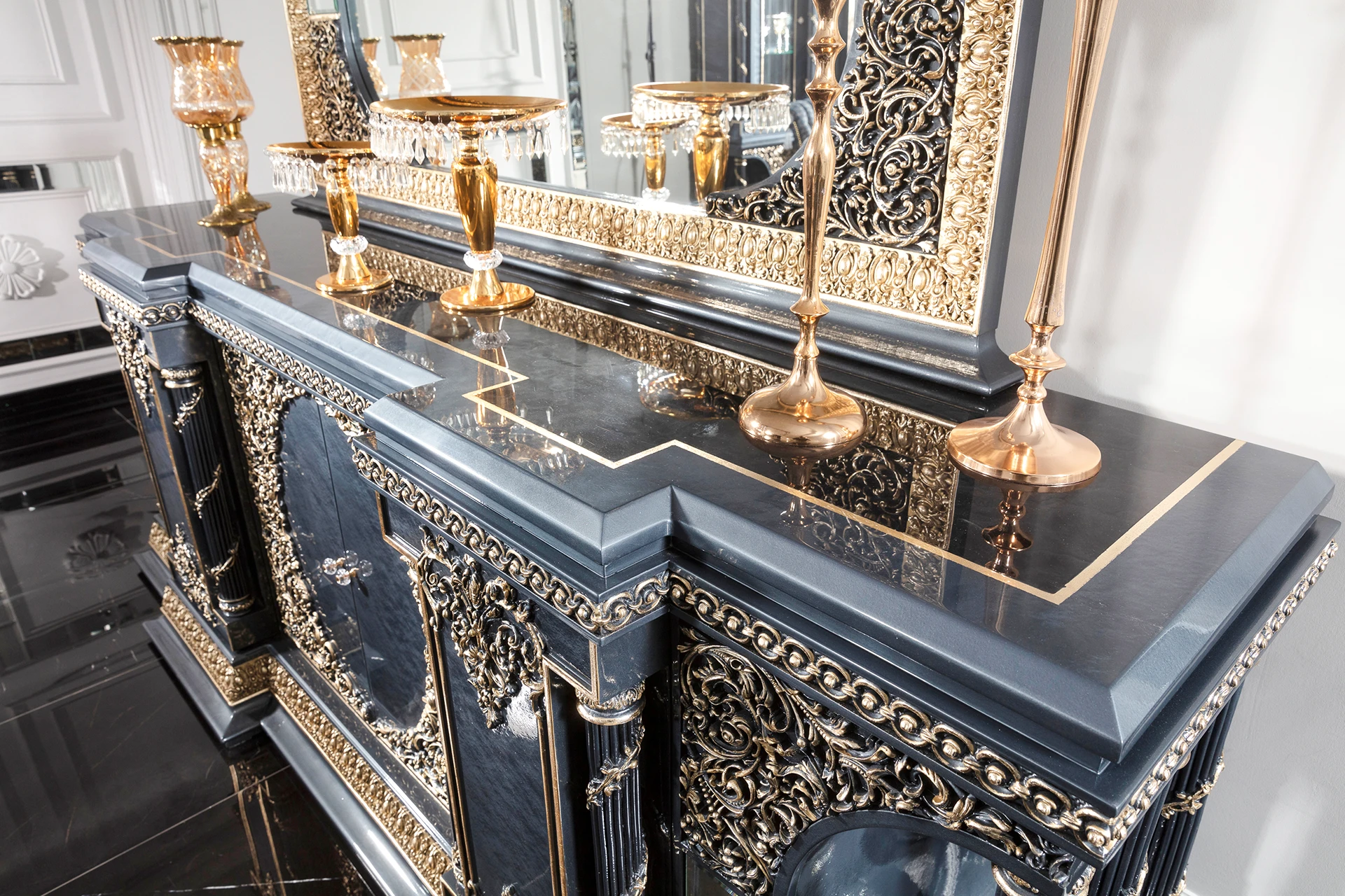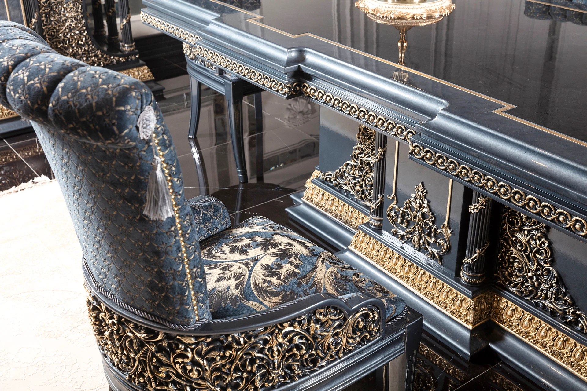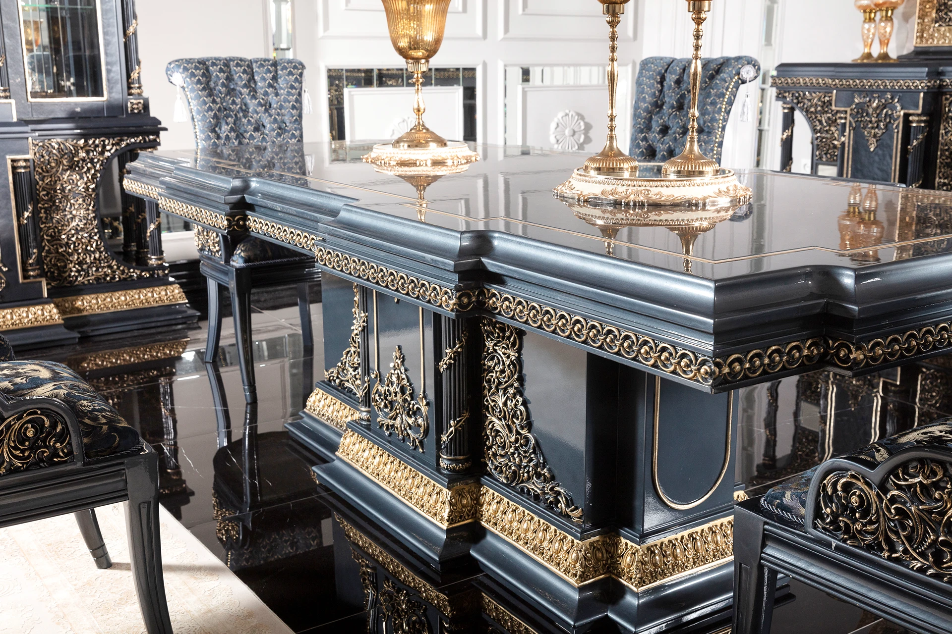 The Blue Hanzade dining room set exudes an air of regal elegance. The striking blue hue is complemented by intricate gold embellishments, adding a touch of luxury to the ensemble. The dining table features a robust design with a glossy surface, making it both functional and aesthetically pleasing. Each chair is upholstered with plush fabric, offering comfort while echoing the set’s ornate theme through detailed carvings on the backrests and legs. The accompanying buffet and glass-fronted cabinet provide ample storage, adorned with matching gold accents. This set is ideal for creating a sophisticated dining experience.