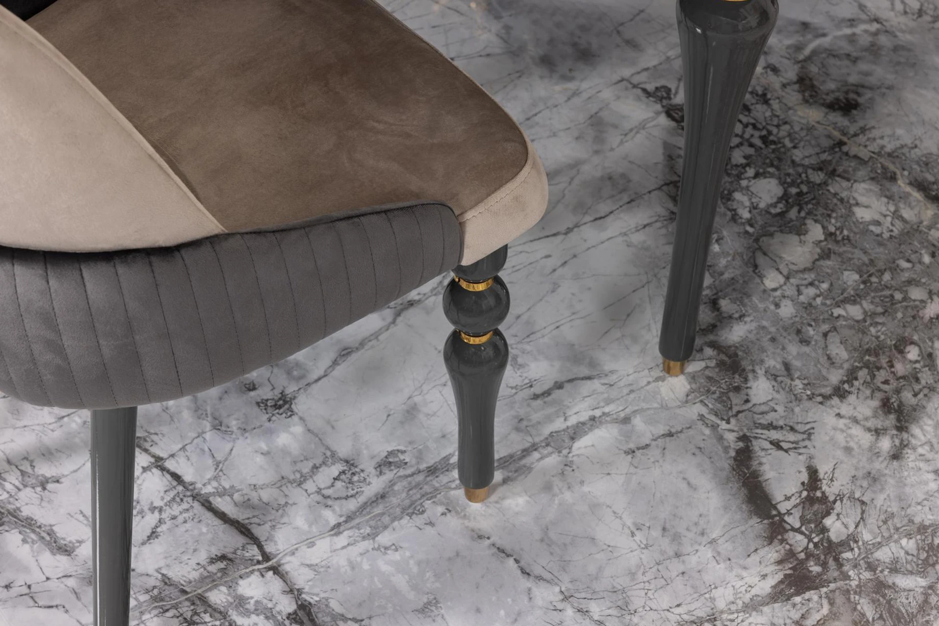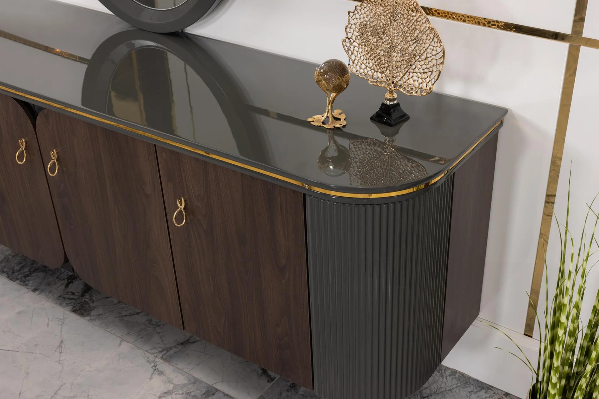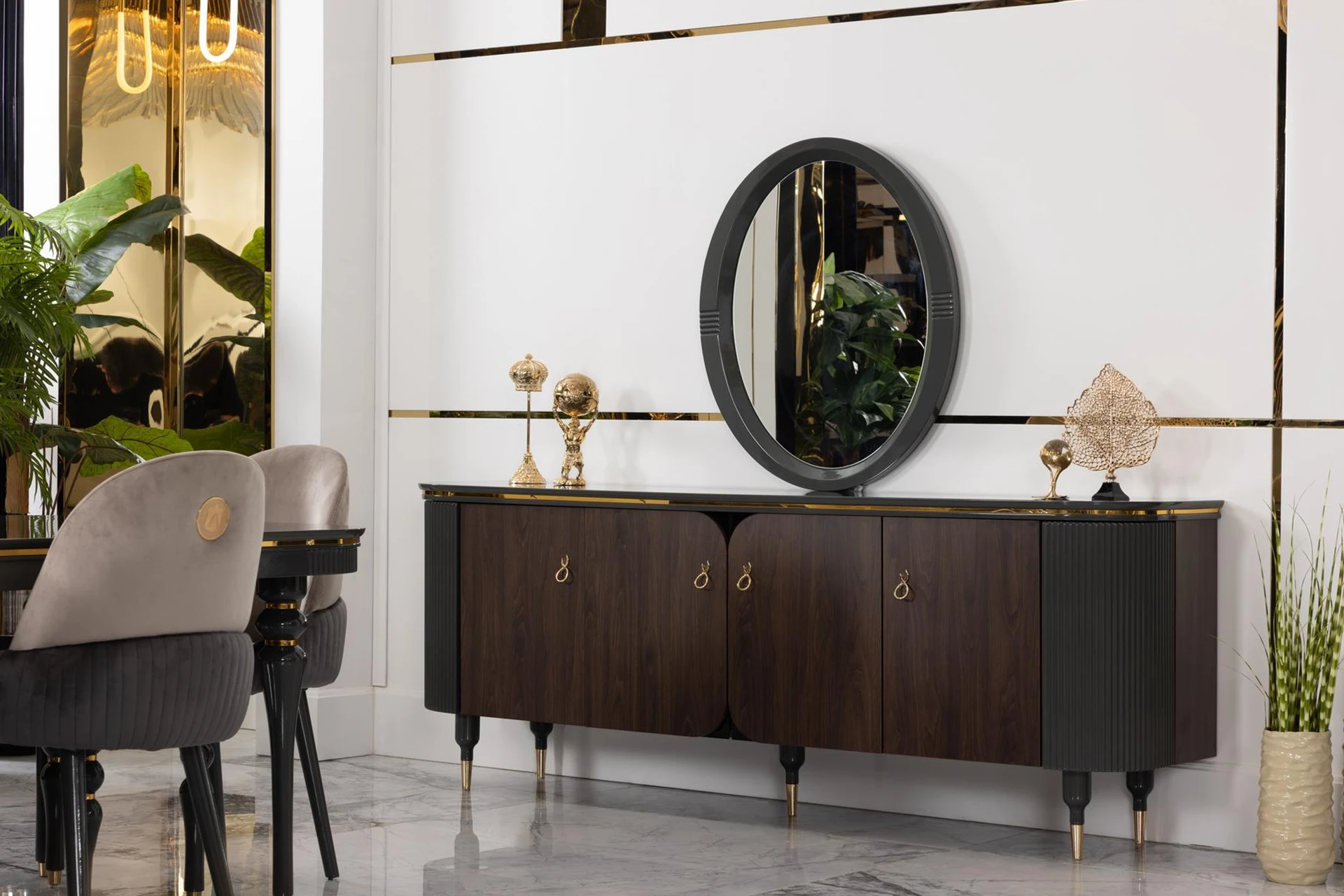 The Capella dining room set blends classic elegance with contemporary design. Featuring a sleek, dark wood table with gracefully turned legs, it radiates sophistication. The velvet-upholstered chairs add a touch of luxury with their soft, cushioned seats and curved backs, ensuring a comfortable dining experience. Accented with golden details on both the table and chairs, this set brings a sense of timeless charm to your dining space. The matching buffet, with its dark wood finish and circular mirror, completes the look, creating a refined and inviting atmosphere.