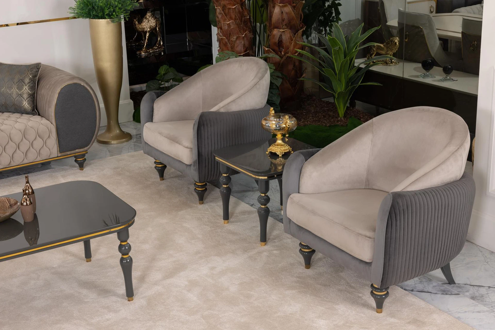 The Capella sofa set exudes a sense of timeless luxury with its unique blend of modern design and classic elegance. The set features plush, rounded arms and intricately quilted upholstery, providing both comfort and visual appeal. The sophisticated beige and gray color scheme complements any interior, while the gold accents on the legs add a touch of opulence. Paired with matching armchairs, the set creates a harmonious seating arrangement, ideal for both formal and casual living spaces.