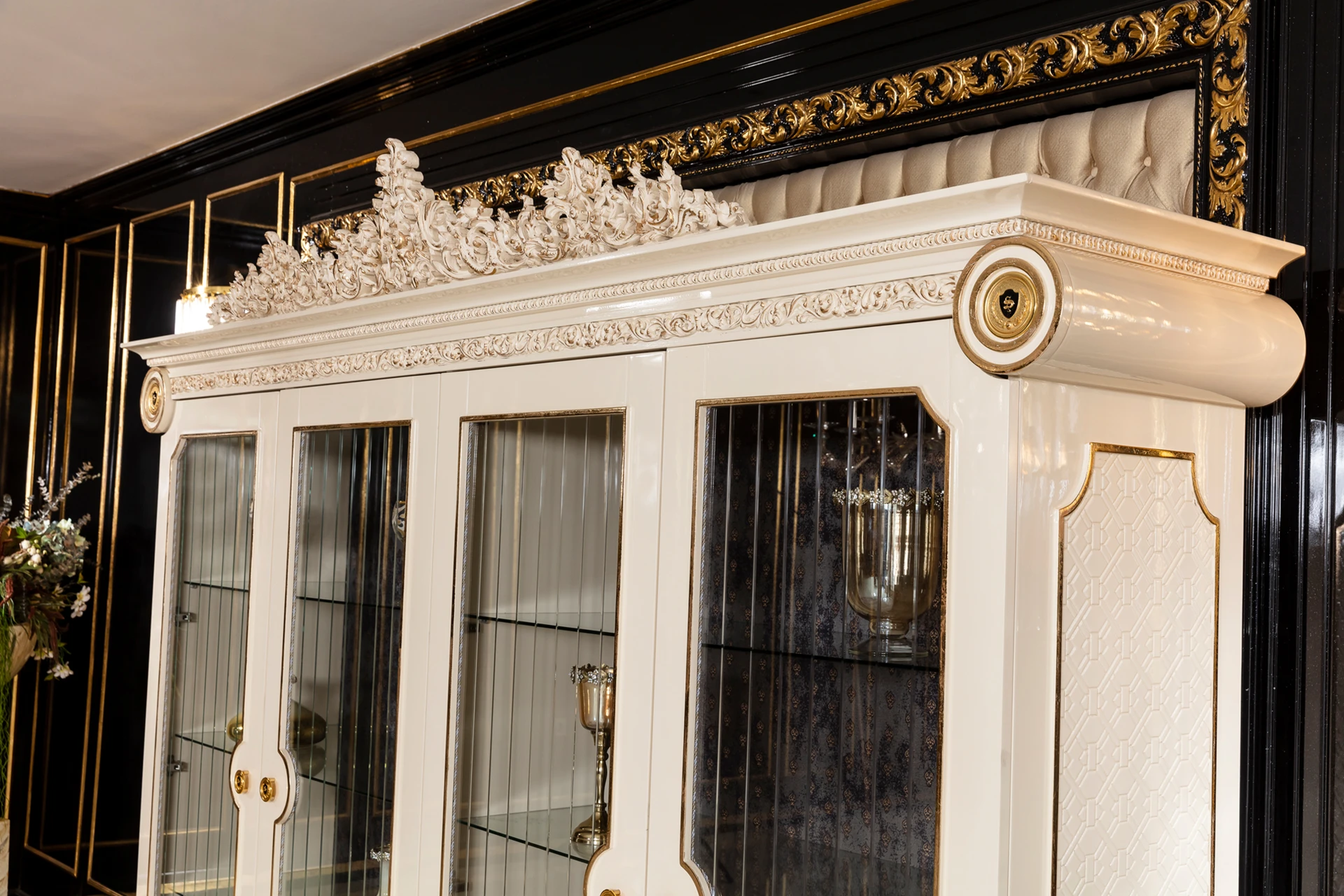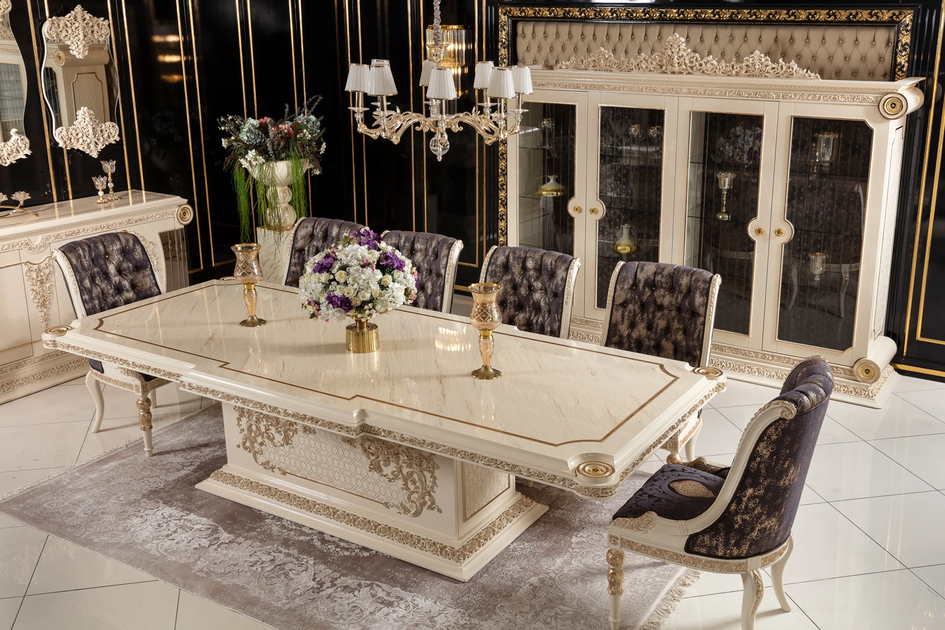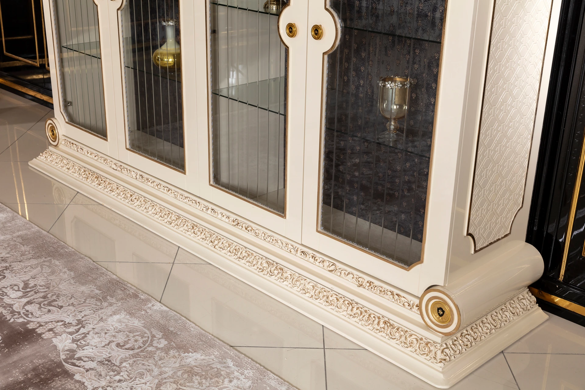 The Cream Lyon dining room set embodies refined luxury with its cream finish and exquisite detailing. The dining table features an ornate base adorned with intricate carvings, providing a sturdy yet elegant foundation for the glossy tabletop. The high-back chairs are upholstered in a plush fabric with rich patterns, perfectly complementing the set’s classic aesthetic. The accompanying cabinet showcases glass-paneled doors, allowing for a beautiful display of fine dinnerware. Mirrored accents and a sleek buffet complete the ensemble, adding depth and grandeur to any dining space.
