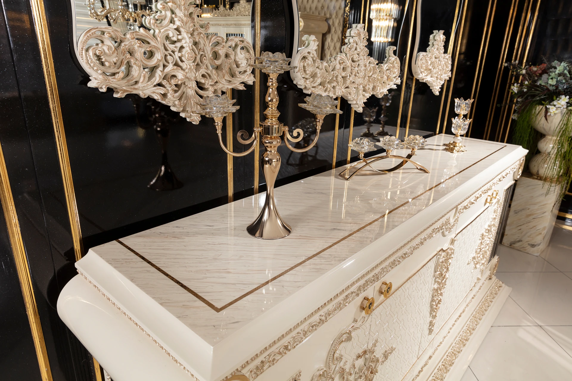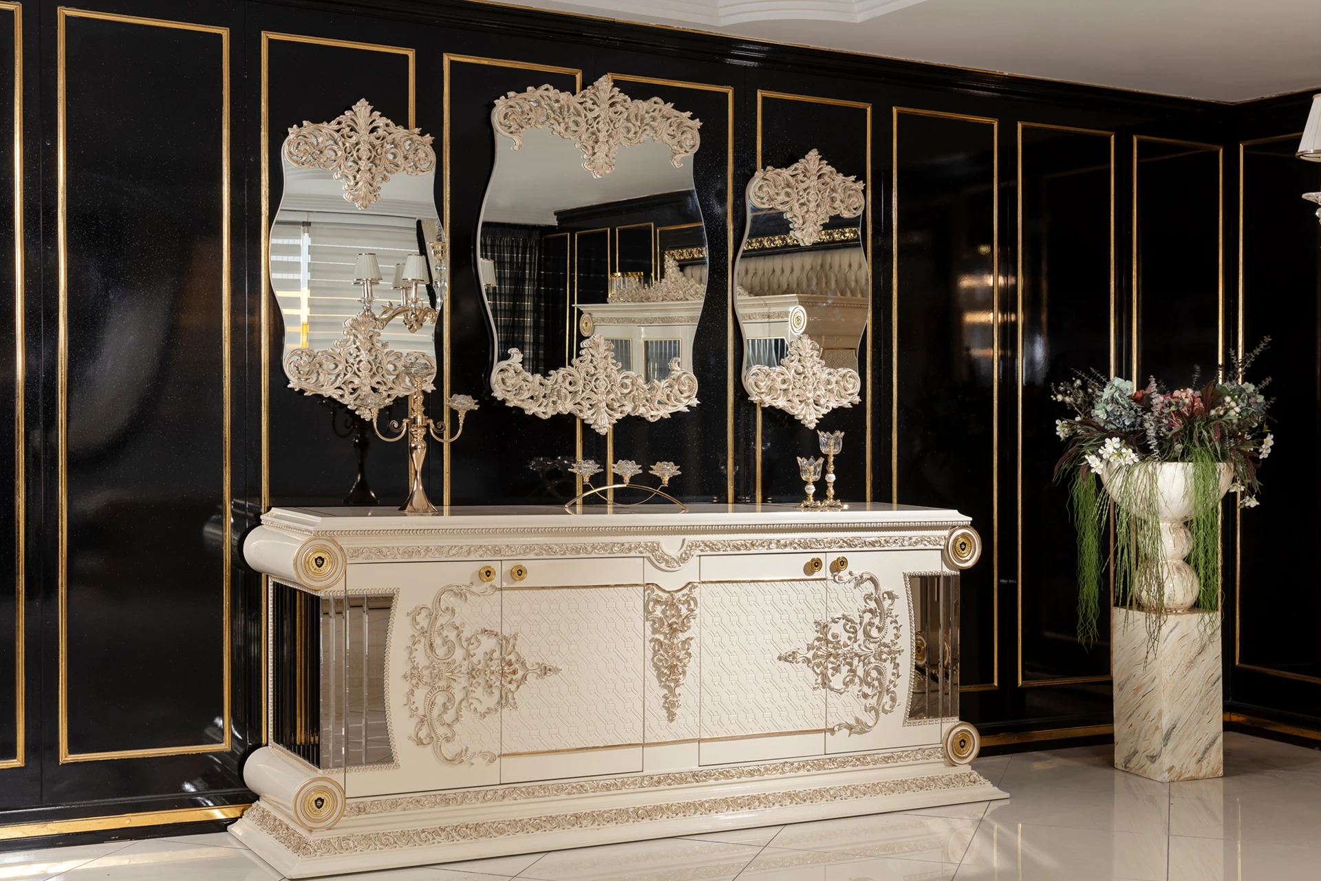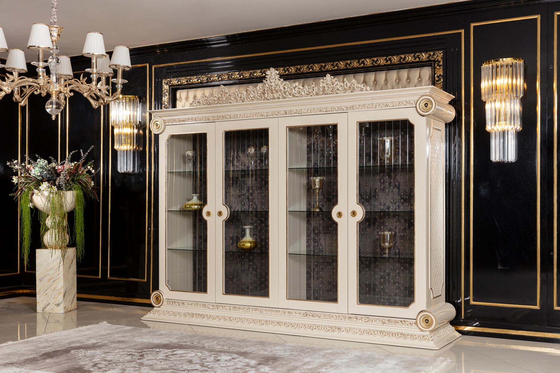 The Cream Lyon dining room set embodies refined luxury with its cream finish and exquisite detailing. The dining table features an ornate base adorned with intricate carvings, providing a sturdy yet elegant foundation for the glossy tabletop. The high-back chairs are upholstered in a plush fabric with rich patterns, perfectly complementing the set’s classic aesthetic. The accompanying cabinet showcases glass-paneled doors, allowing for a beautiful display of fine dinnerware. Mirrored accents and a sleek buffet complete the ensemble, adding depth and grandeur to any dining space.