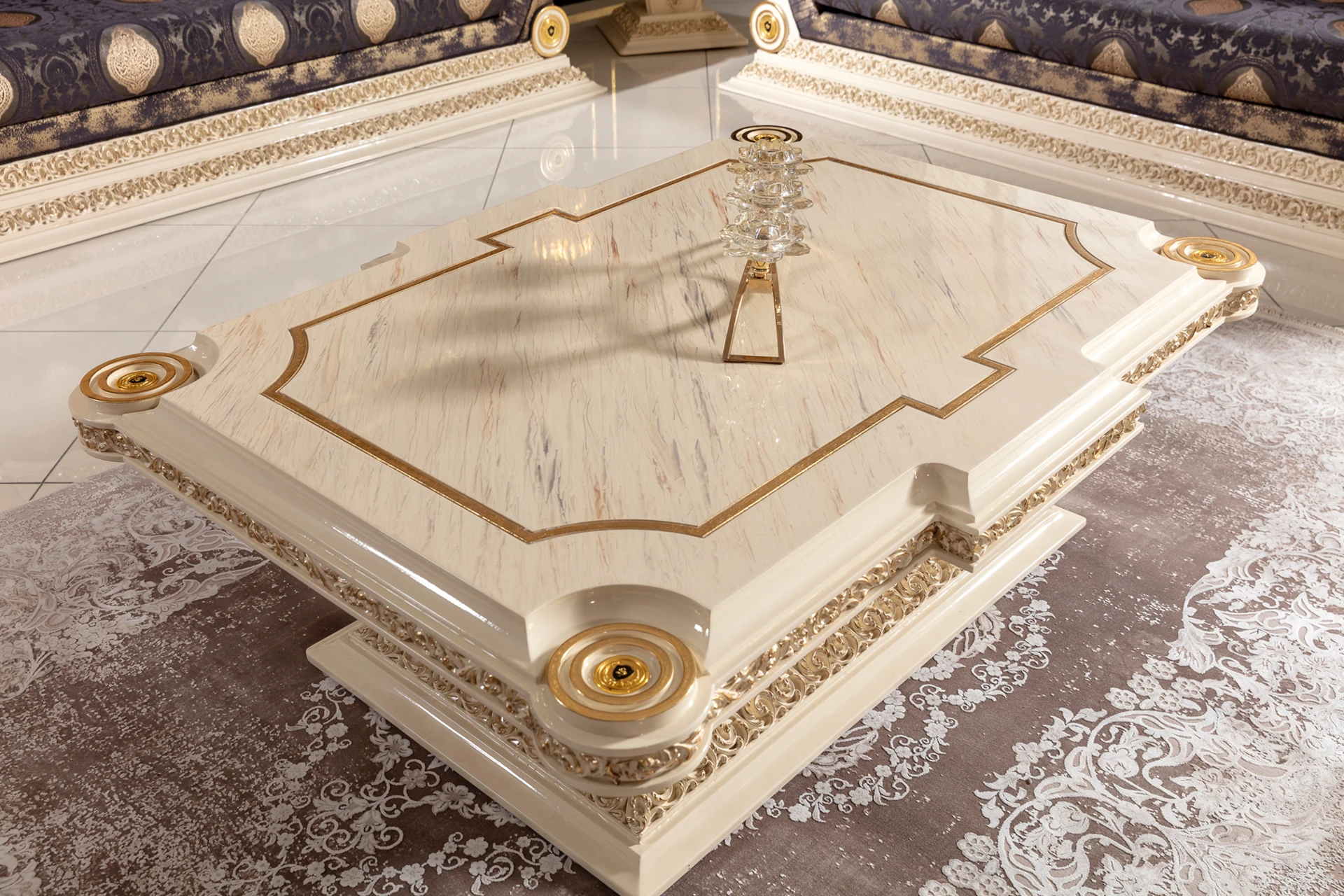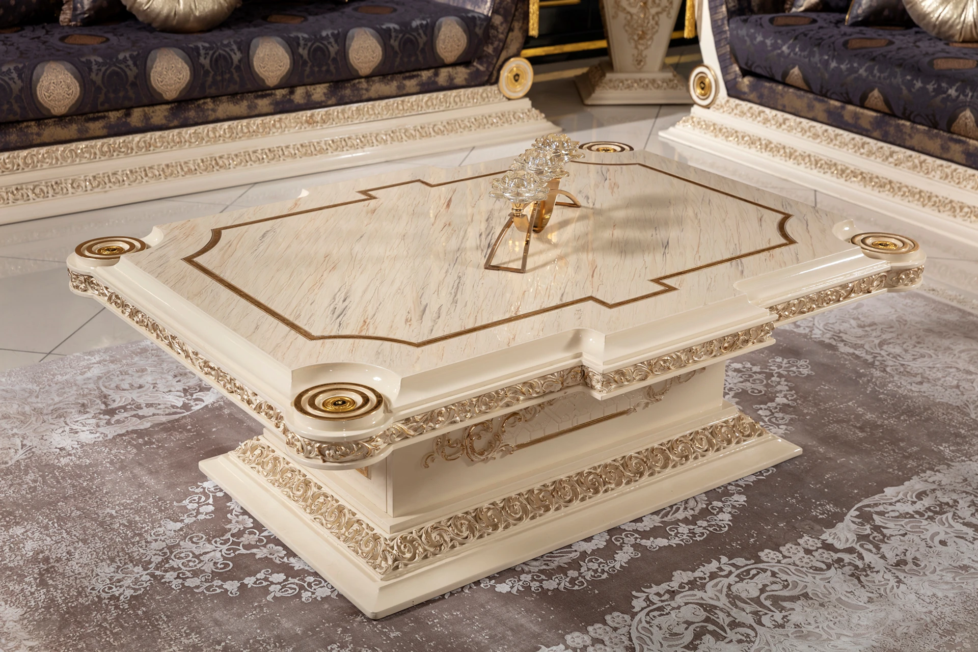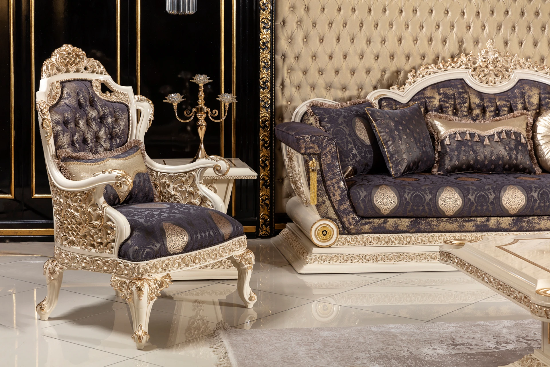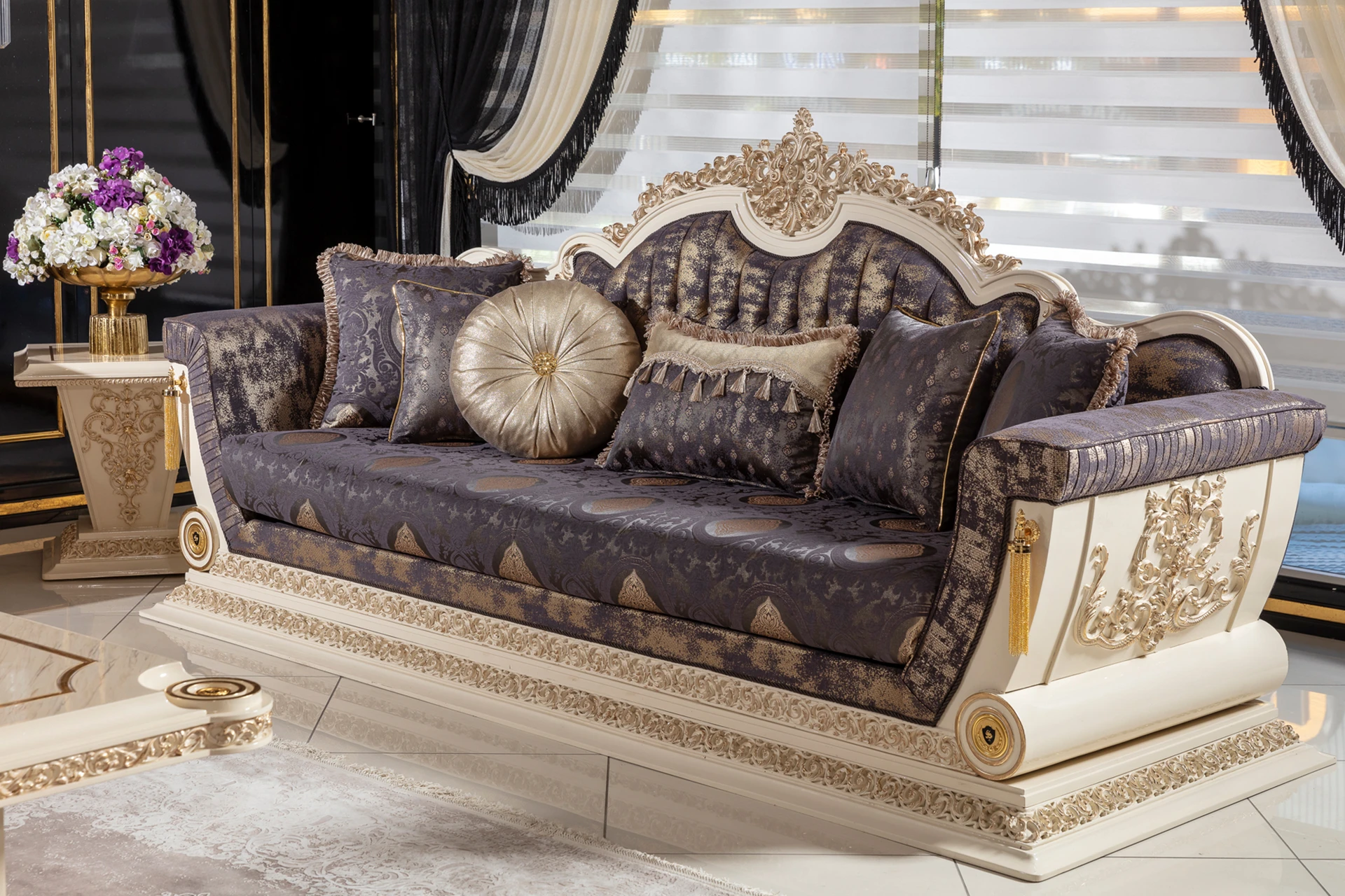 The Cream Lyon sofa set exudes timeless elegance with its sophisticated cream and gold accents. The plush upholstery, featuring deep, luxurious patterns, adds a touch of regal opulence to any living space. Ornate carvings embellish the armrests and frames, showcasing exquisite craftsmanship. The set’s design combines classic curves with a modern sensibility, creating a striking centerpiece for a refined living room. The matching coffee table, with its intricate detailing and glossy surface, completes the look, embodying the essence of luxury and comfort.