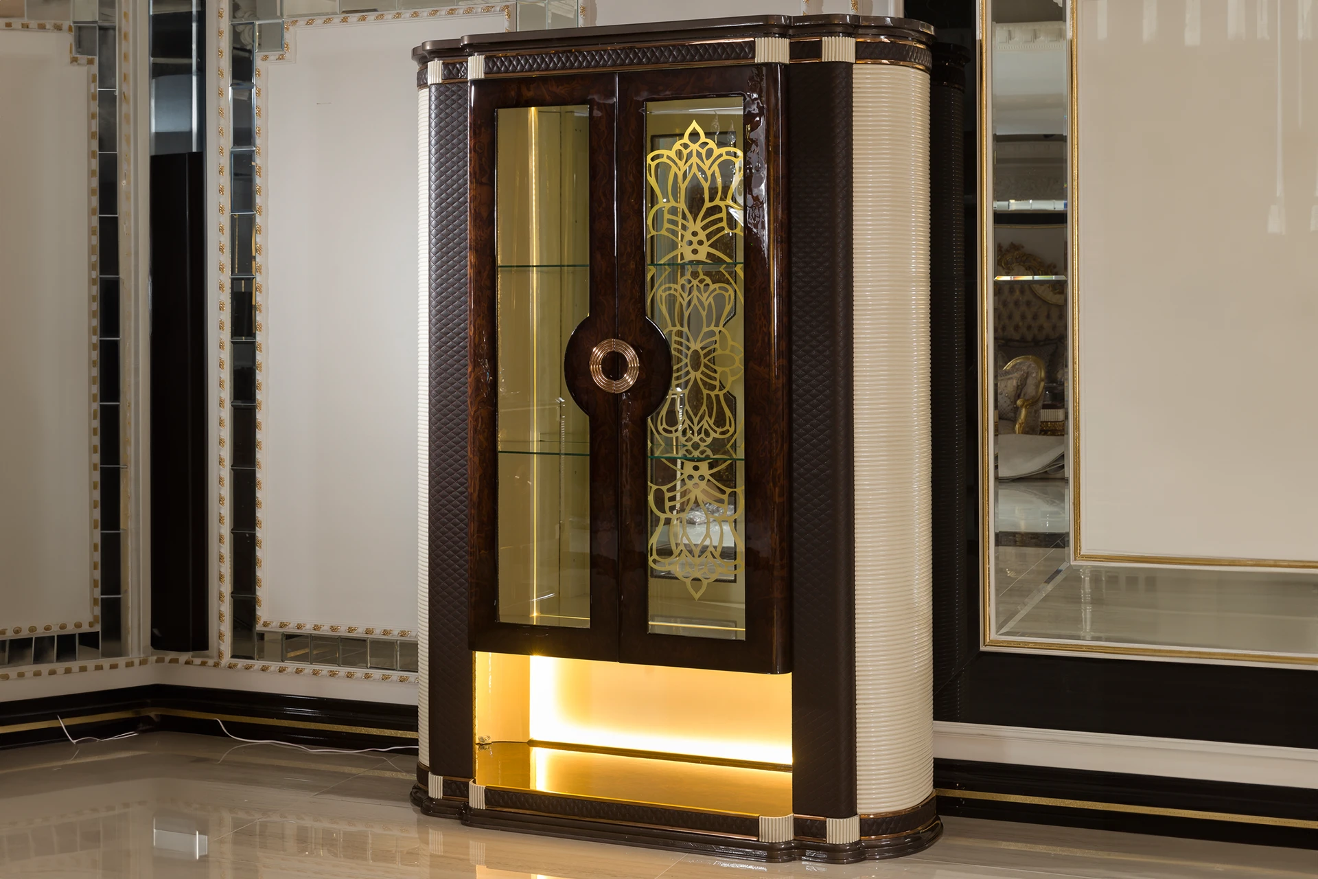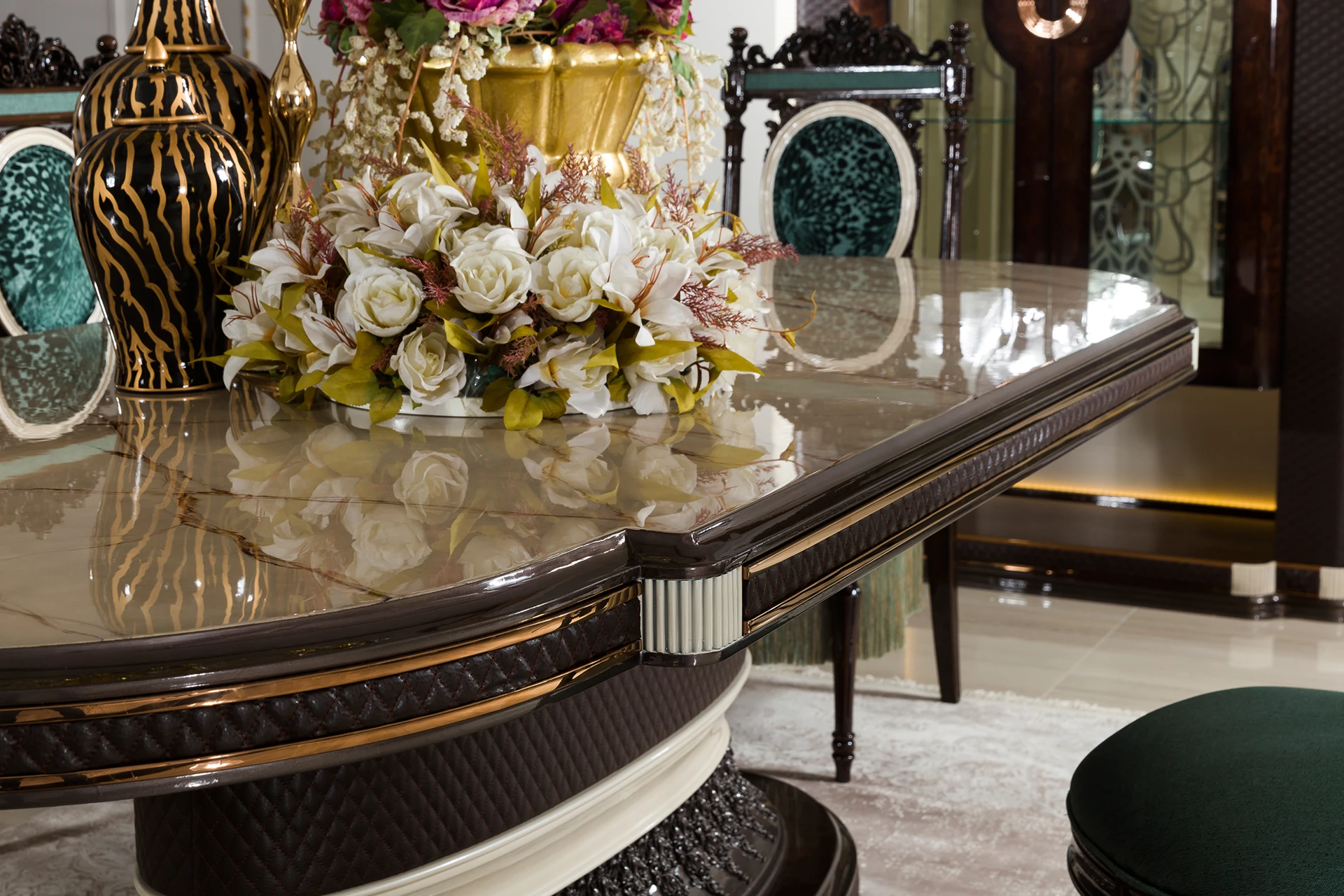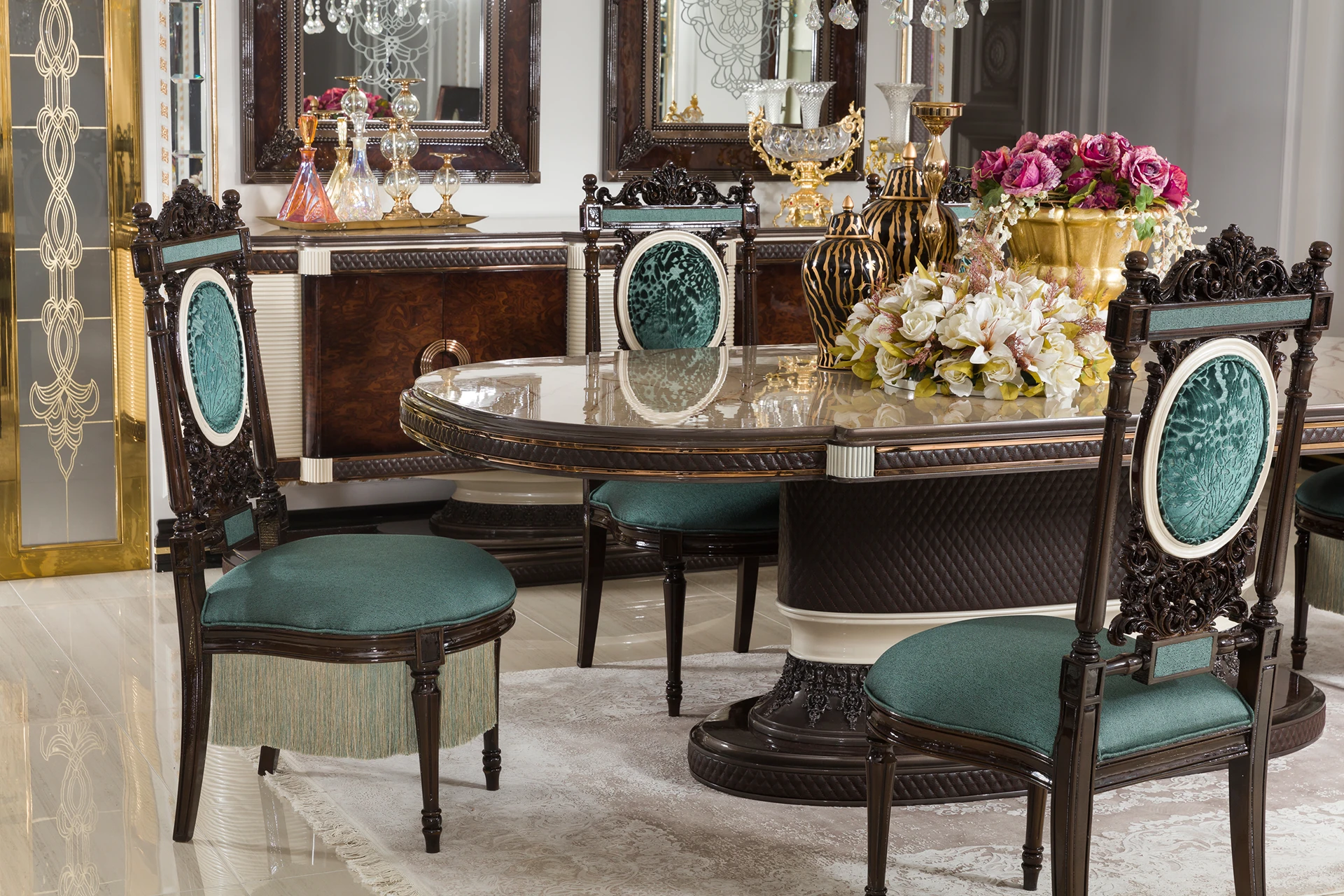 The Crowne dining room set is a masterpiece of luxury and classic design. The set features a grand dining table with a polished, marble-like surface supported by an intricately carved base. The chairs are upholstered in a rich teal velvet, framed by dark wood with exquisite detailing. The sideboard and display cabinet combine deep wood tones with elegant accents, offering both storage and a regal appearance. Completing the set, the ornate chandelier and framed mirrors add a touch of opulence, making this dining room a focal point of any home.