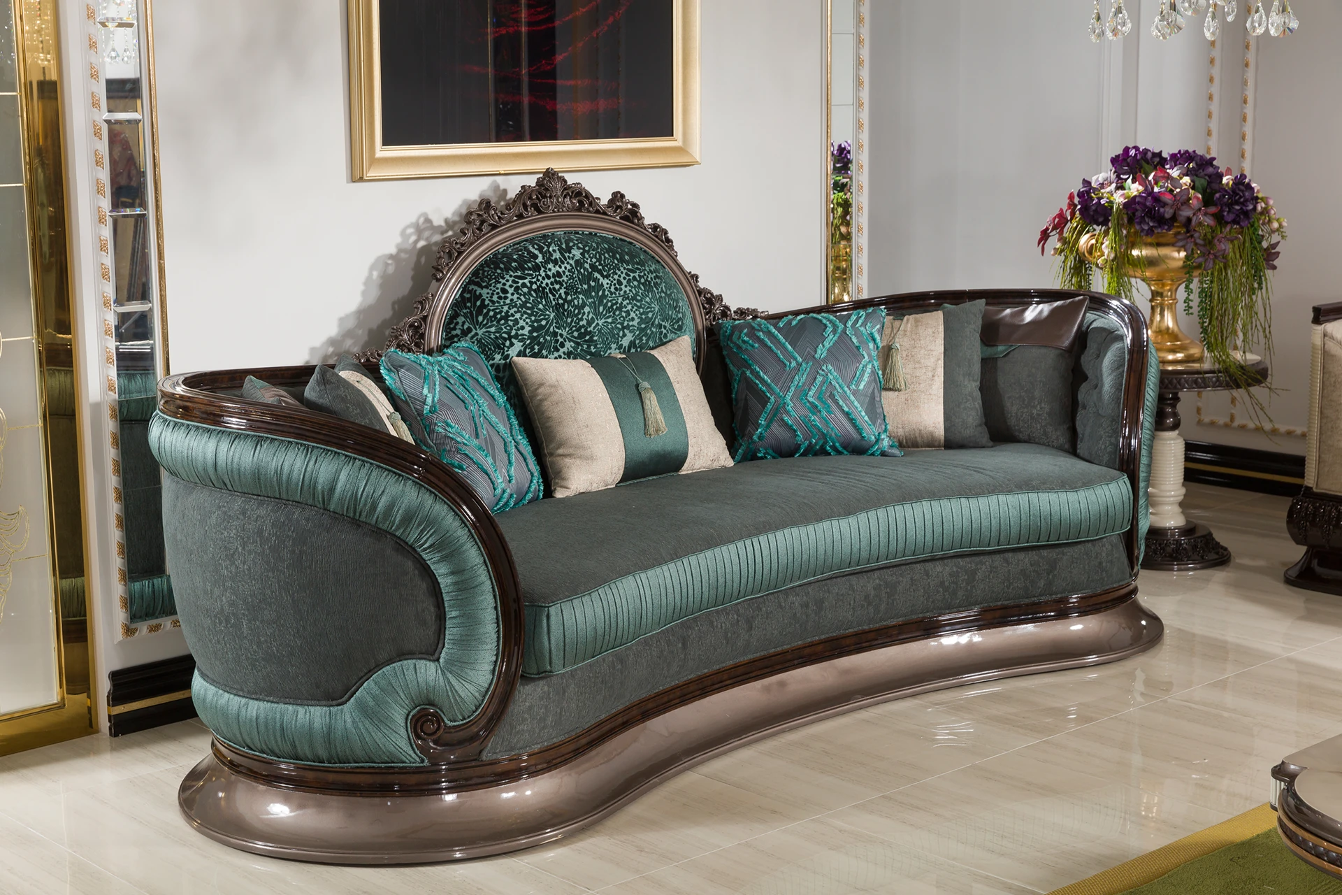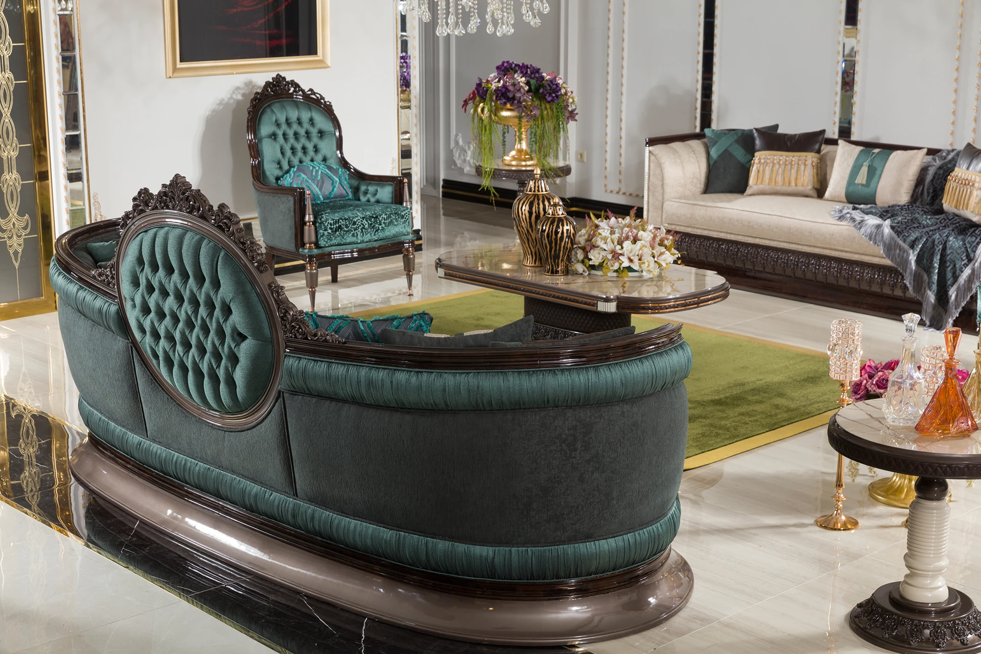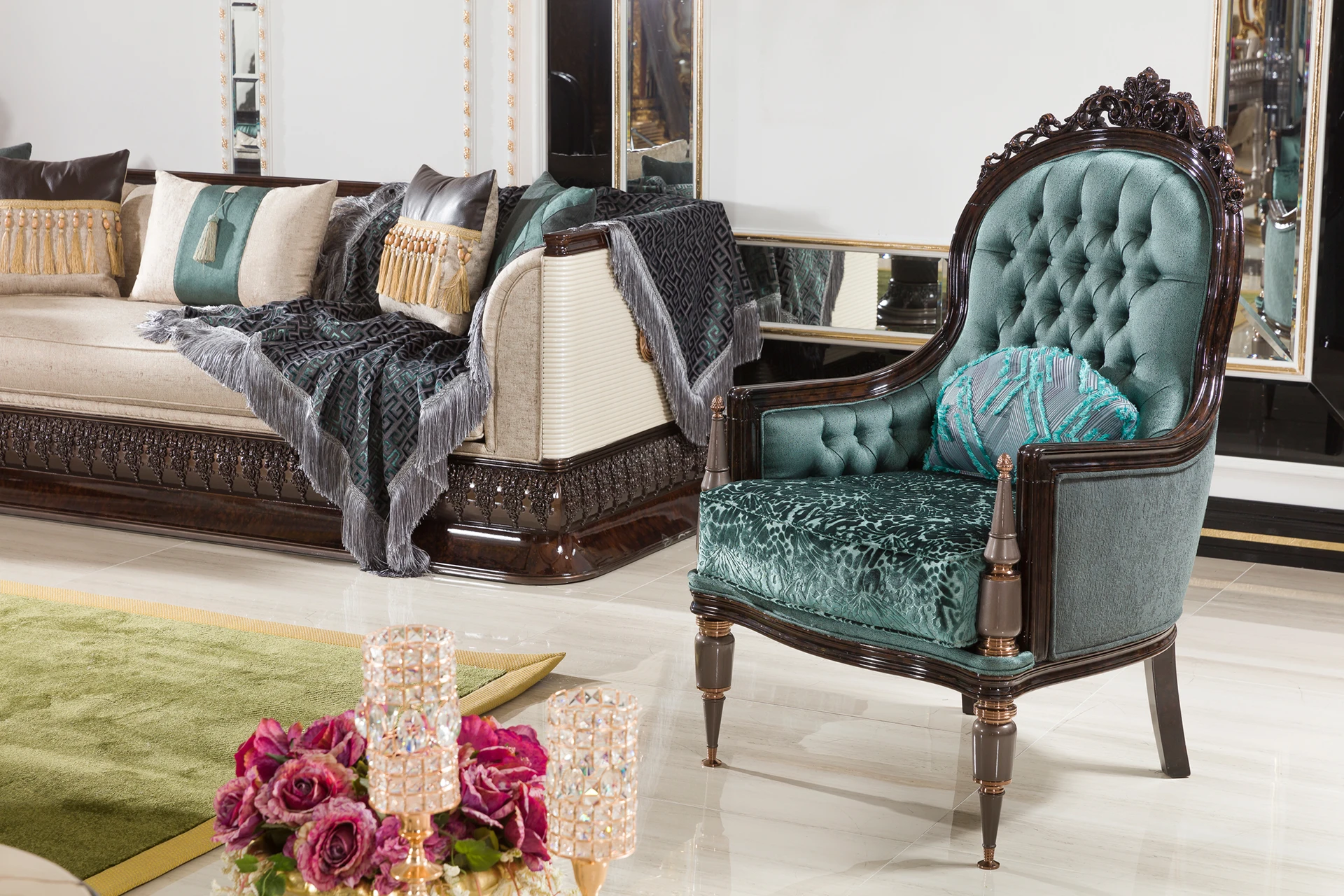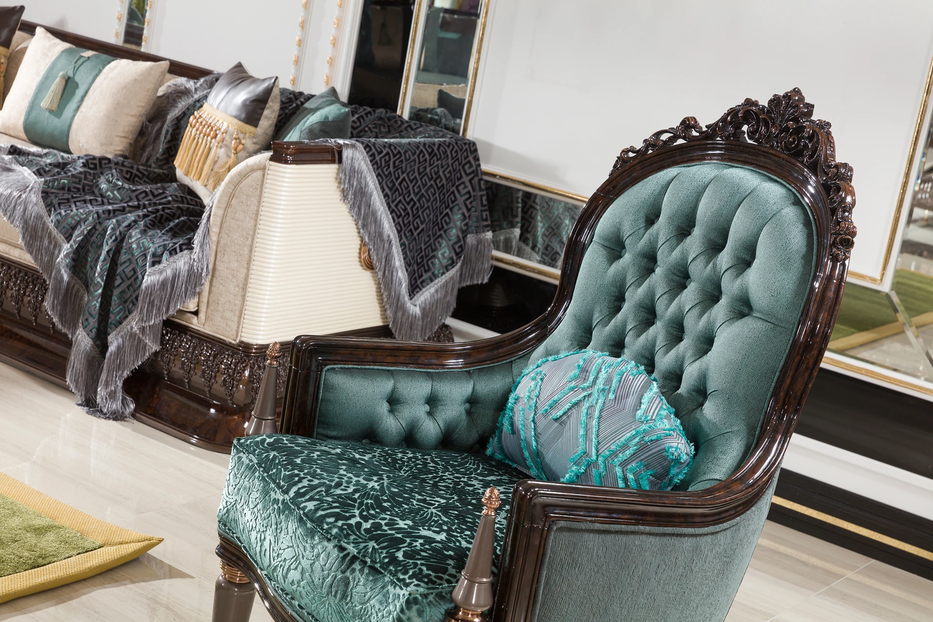 The Crowne sofa set exudes elegance and grandeur, featuring a stunning blend of classic and modern design elements. The sofas are upholstered in plush, teal velvet with intricate dark wood accents that highlight their luxurious silhouette. The refined armchair complements the set, adding a sophisticated touch. A sleek coffee table with a polished surface sits at the center, paired with a green rug that brings warmth and cohesion to the room. Adorned with decorative pillows and accompanied by a chandelier, this set creates an ambiance of timeless luxury and comfort.