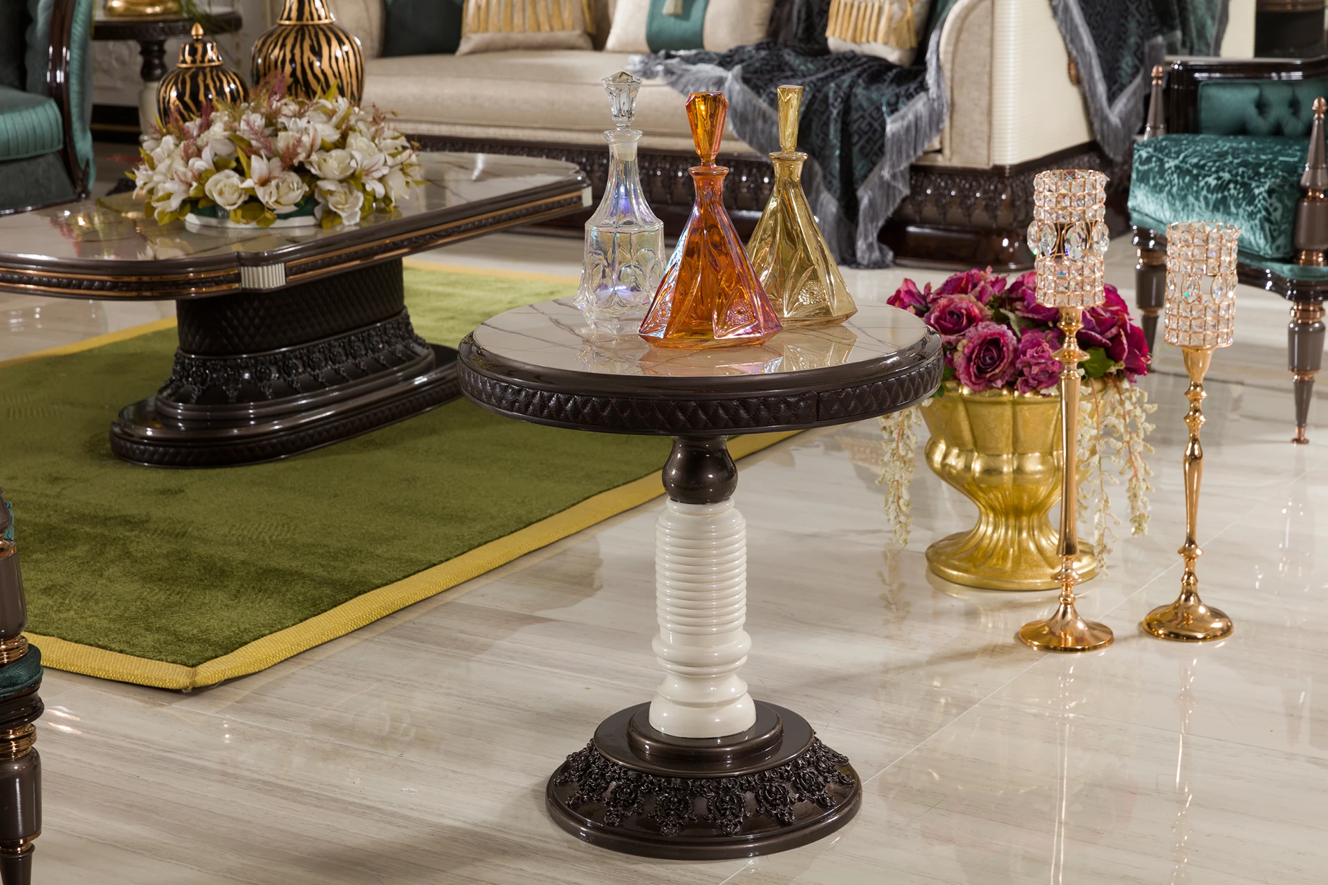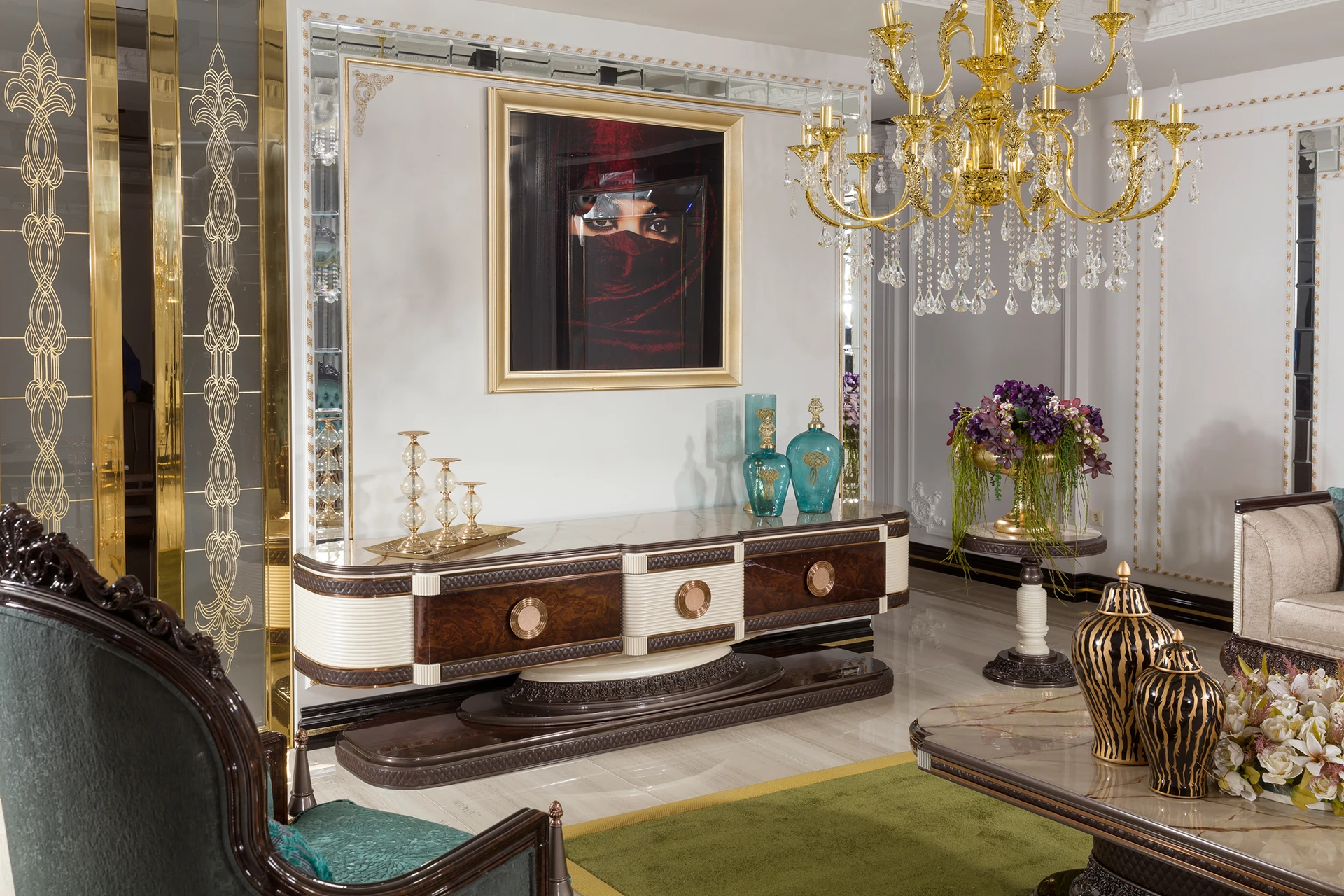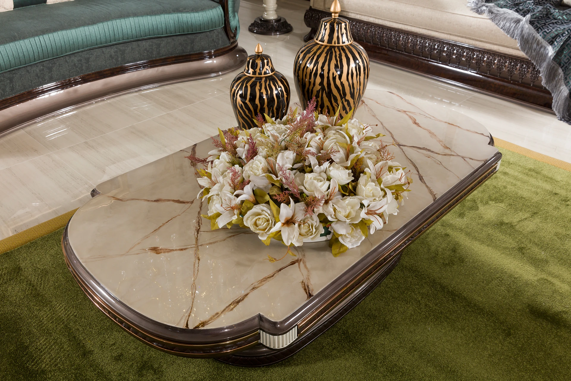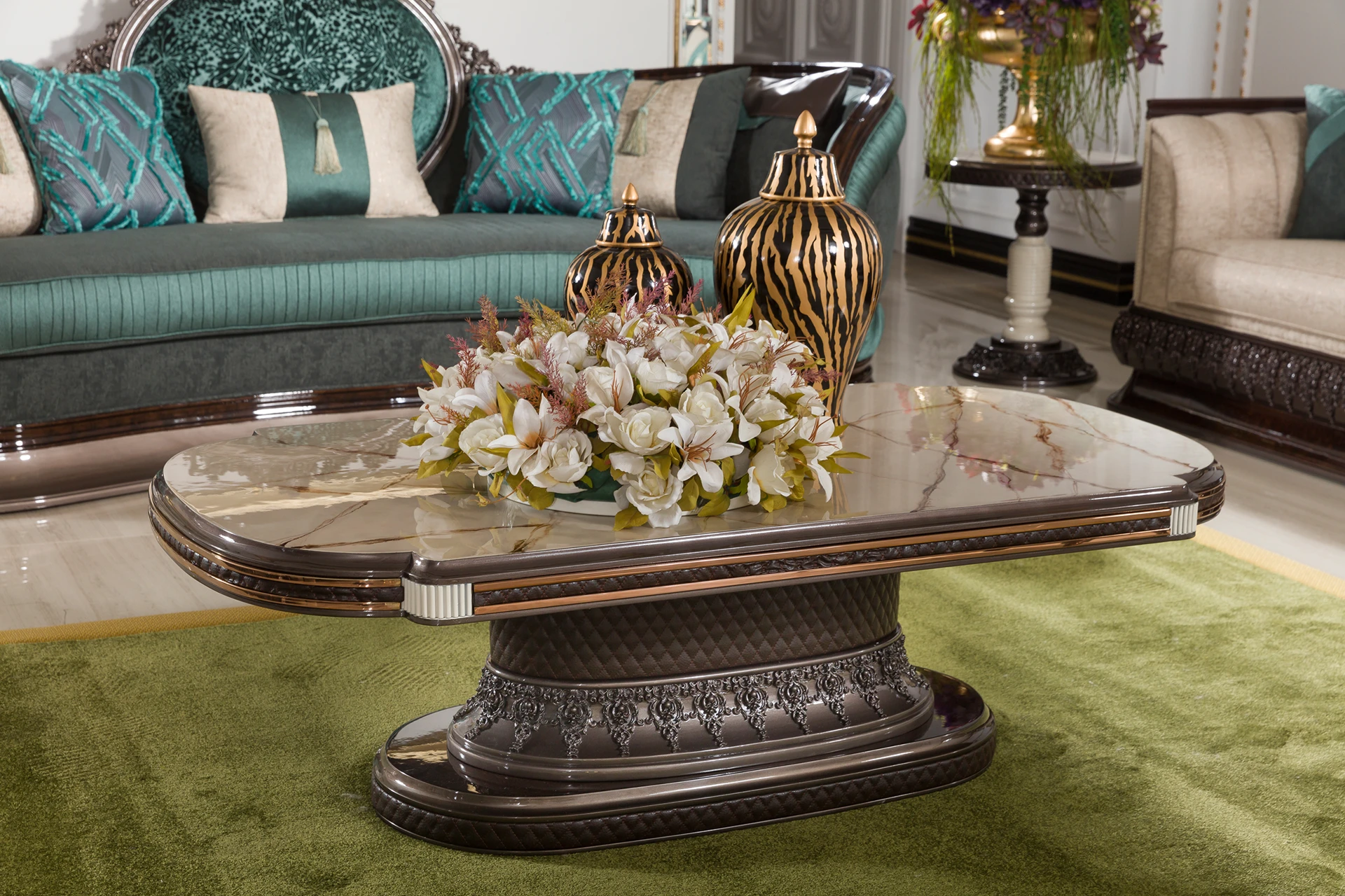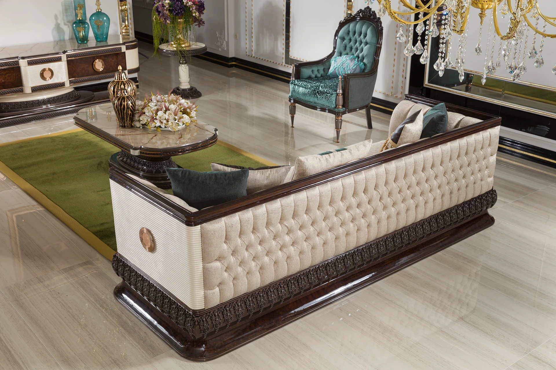 The Crowne sofa set exudes elegance and grandeur, featuring a stunning blend of classic and modern design elements. The sofas are upholstered in plush, teal velvet with intricate dark wood accents that highlight their luxurious silhouette. The refined armchair complements the set, adding a sophisticated touch. A sleek coffee table with a polished surface sits at the center, paired with a green rug that brings warmth and cohesion to the room. Adorned with decorative pillows and accompanied by a chandelier, this set creates an ambiance of timeless luxury and comfort.
