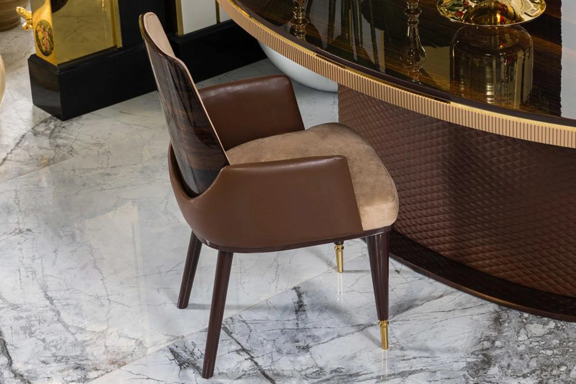 The Elda dining room set showcases a perfect balance of luxury and contemporary design. The bold use of rich textures and sleek lines brings a sophisticated and modern vibe to your dining area. The meticulously crafted table, paired with elegant chairs, promises comfort while making a bold style statement. The contrasting color palette, combined with the subtle metallic accents, elevates the space with an air of refinement. Ideal for hosting dinner parties or intimate family meals, this dining set adds a touch of class and timeless elegance to your home.