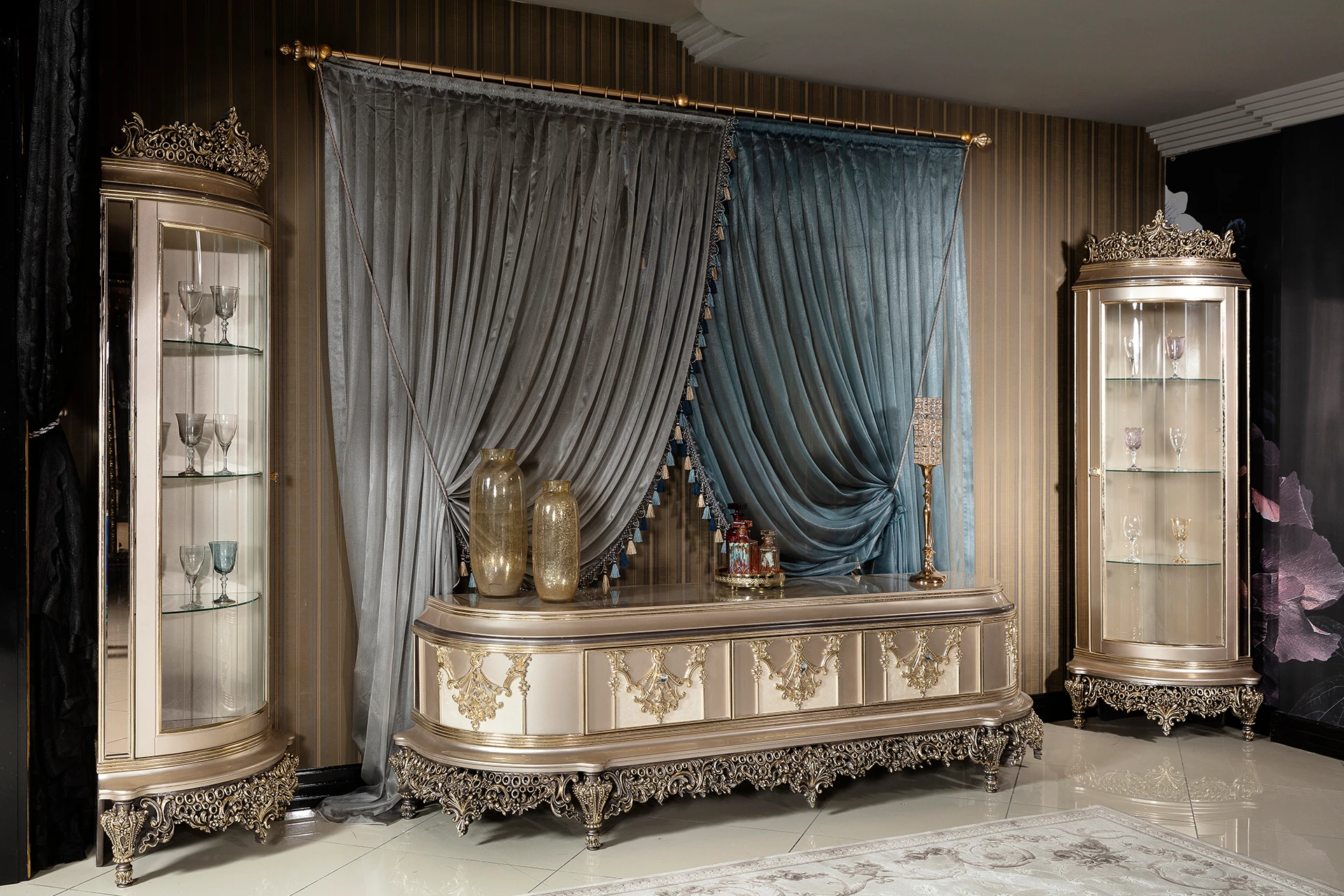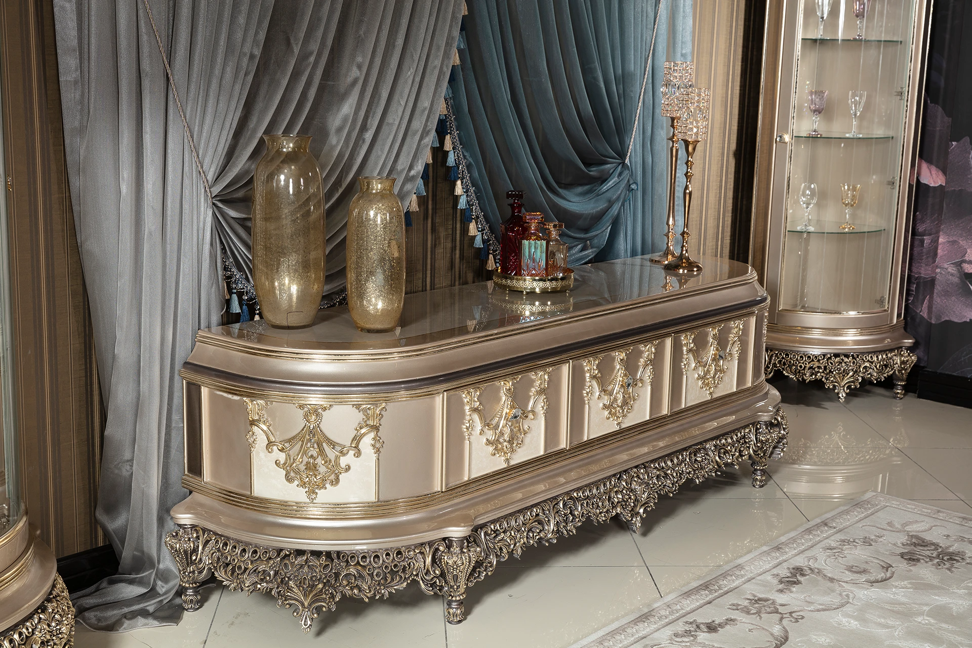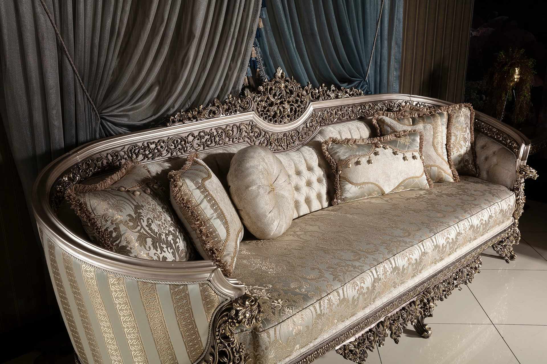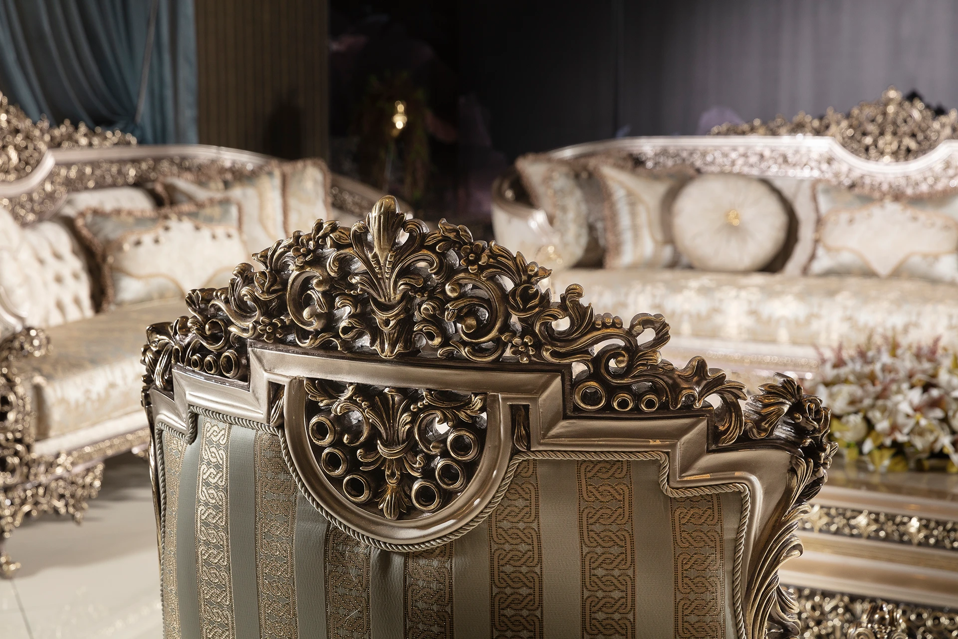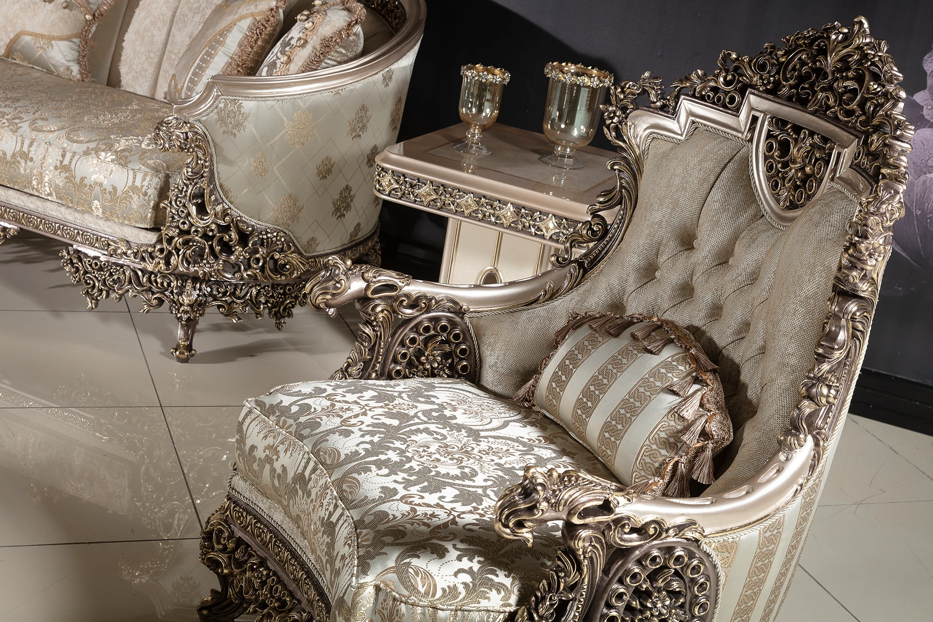 The Elegance sofa set embodies opulence and sophistication with its intricately carved frames and luxurious upholstery. The sofas boast high, gracefully curved backs adorned with tufted details, complemented by plush cushions in subtle, elegant patterns. The armchairs match perfectly, featuring rich carvings and comfortable seating, creating a cohesive and regal living room setup. The central coffee table stands out with its rounded edges and intricate base, mirroring the ornate design of the seating. Finished in a soft, metallic sheen, this set brings a touch of timeless luxury to any space.