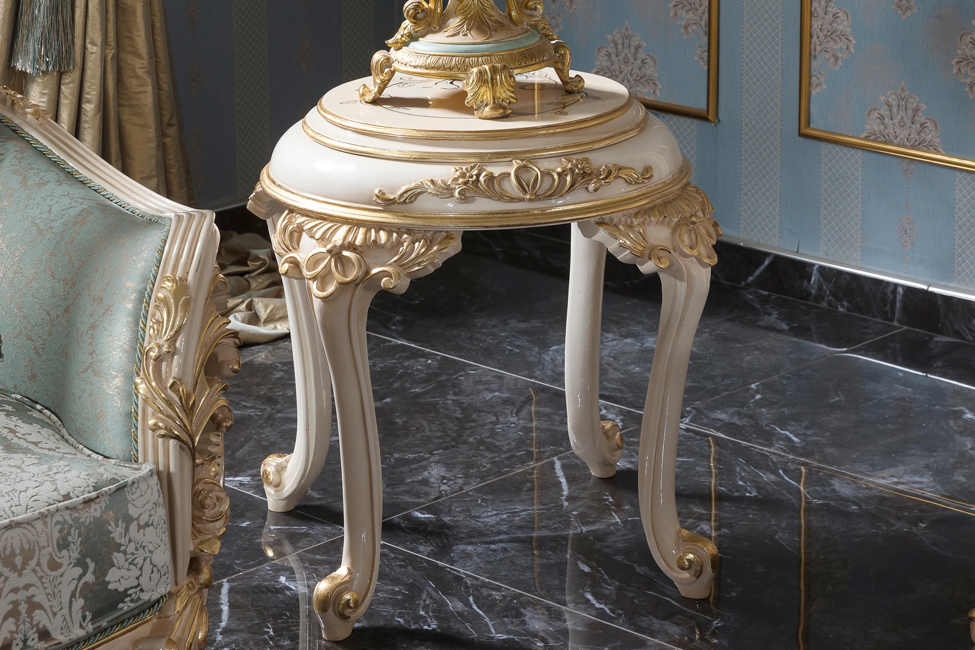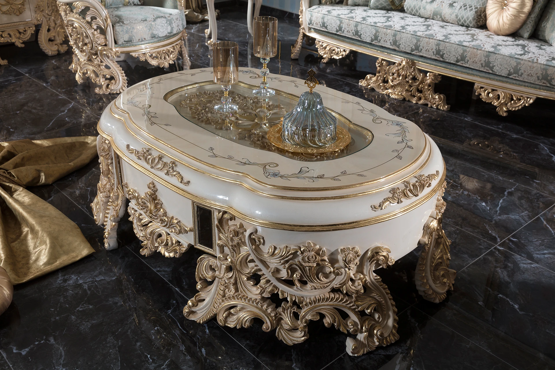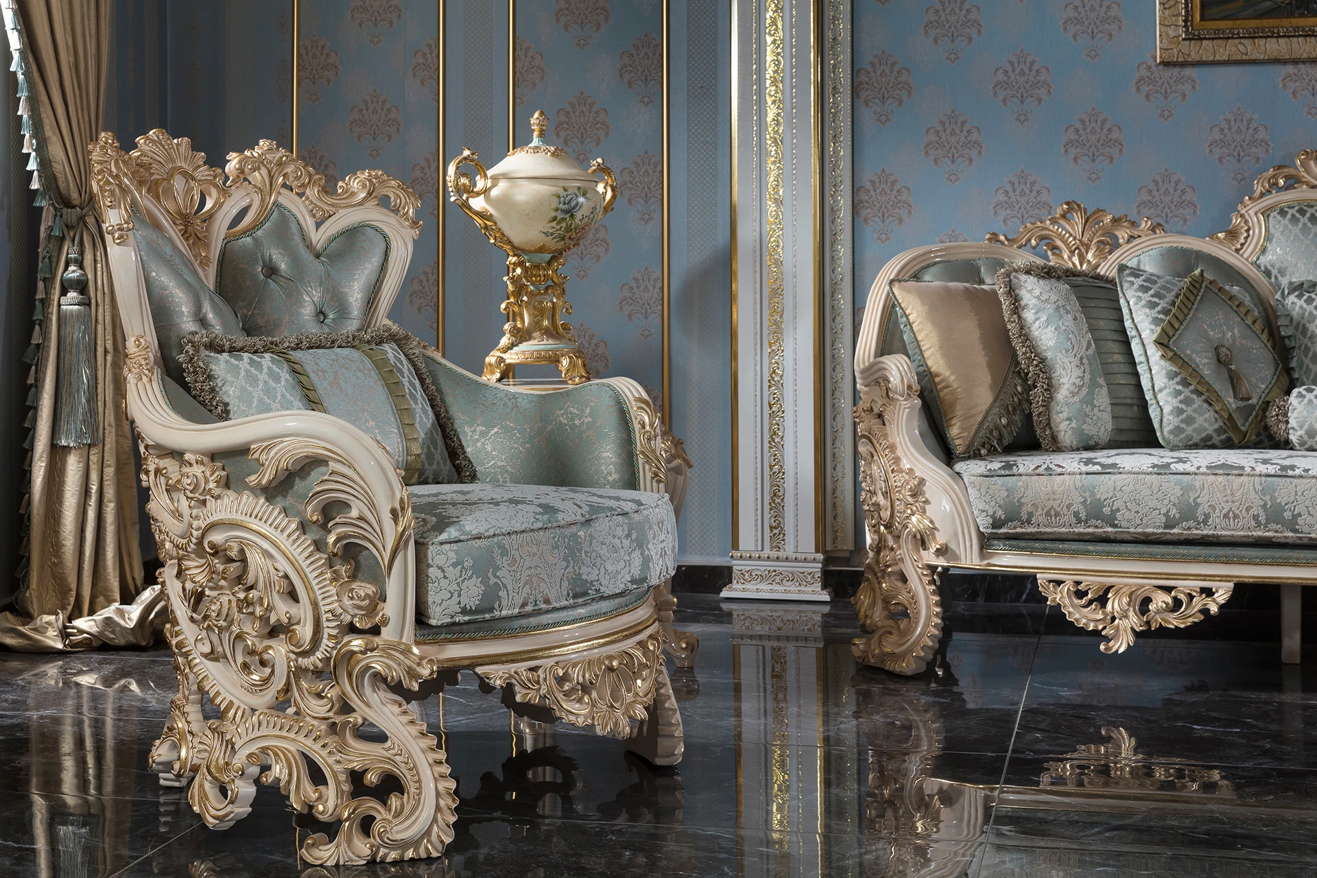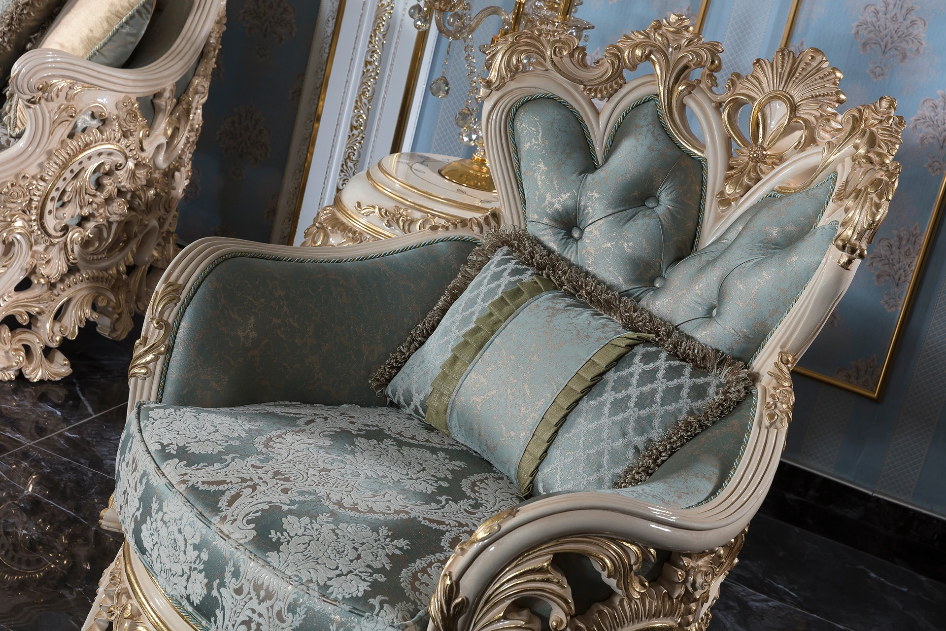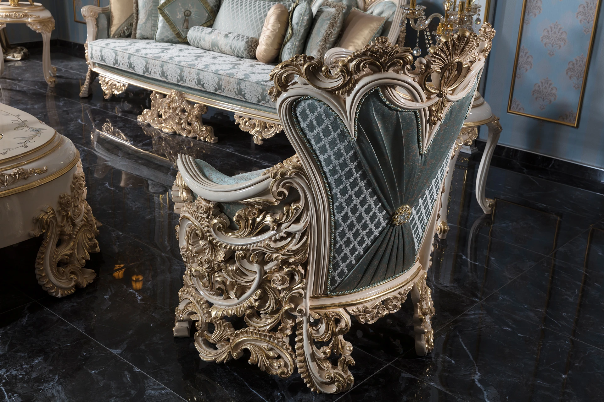 The Elnor sofa set embodies classic luxury with its detailed craftsmanship. Each piece showcases an intricate combination of ornate carvings and soft upholstery in a soothing mint green. The sofa’s plush cushions and elegantly curved armrests provide both comfort and sophistication, while the armchairs mirror this grand design with an added touch of elegance. The coffee table stands as a centerpiece, featuring ornate carvings and a glass top that reflects the room’s opulence. This set adds an air of timeless grandeur to any living space.