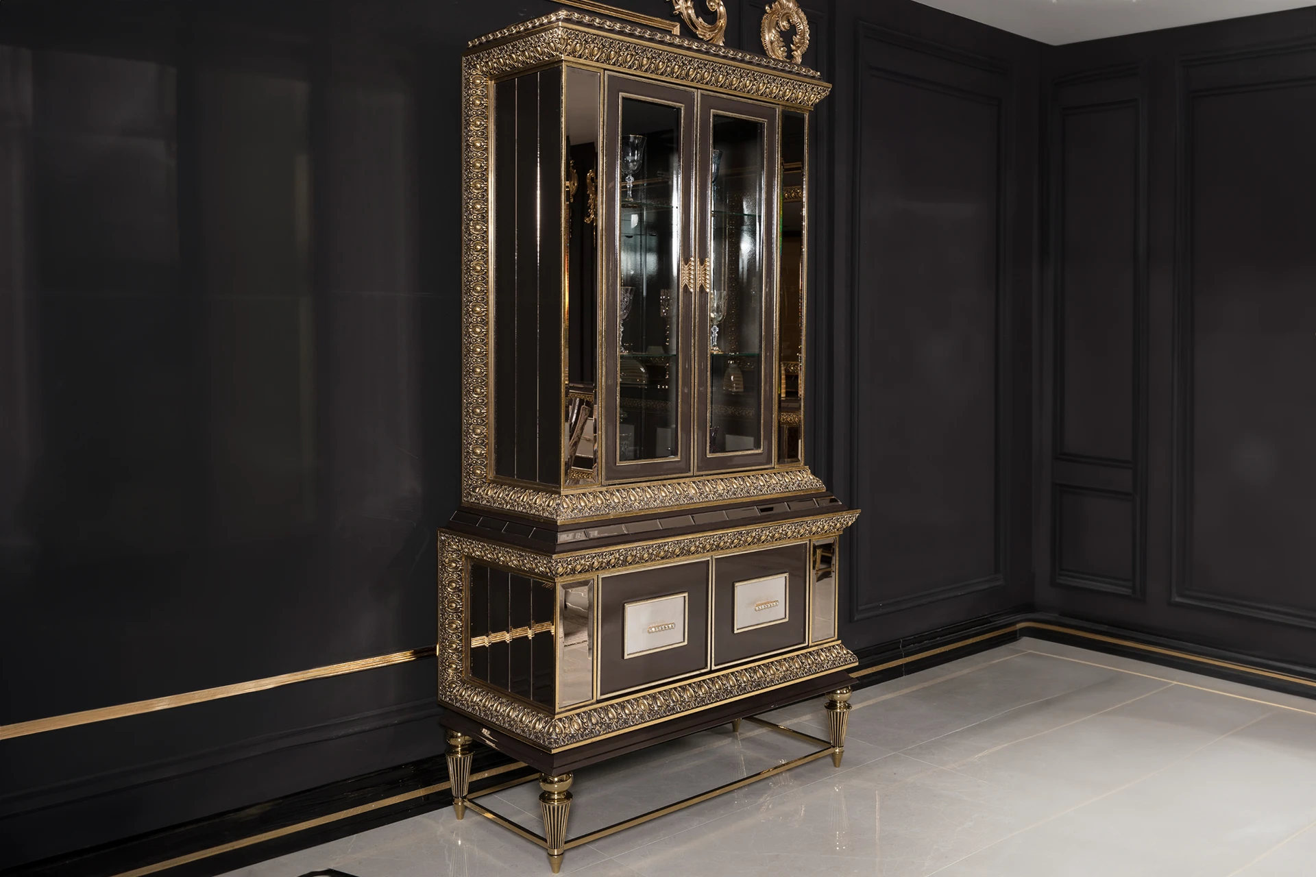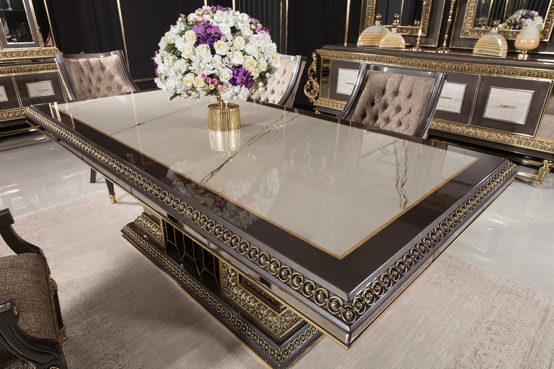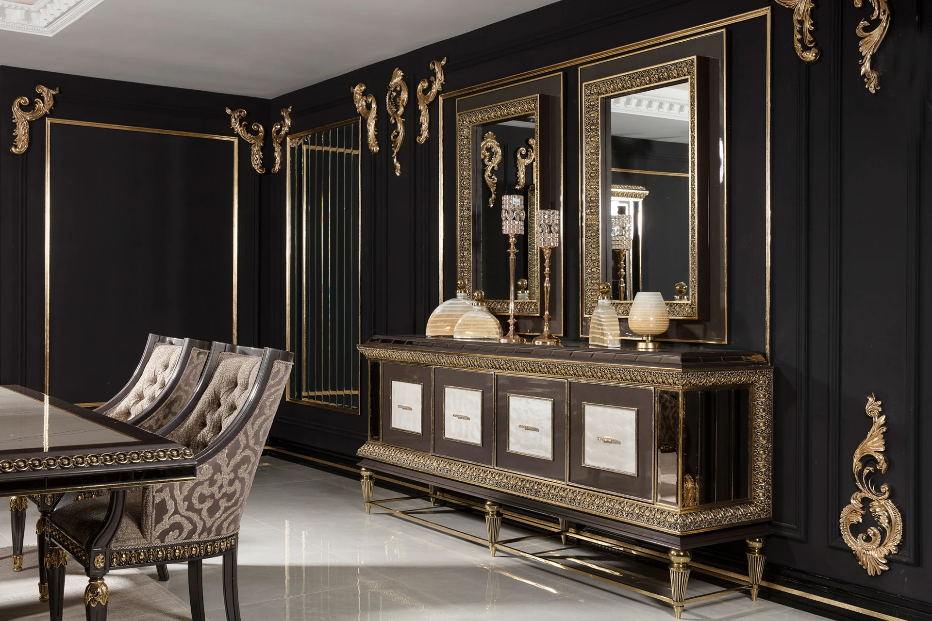 The Emirgan dining room set is a masterpiece of refined luxury. It features a grand dining table with a glossy, mirrored surface and intricate golden accents, giving it an opulent yet modern feel. The table’s base is adorned with detailed carvings, while the chairs boast elegant upholstery with tufted backs and a sophisticated pattern, adding both comfort and style. The matching buffet and glass cabinet continue the theme of luxury, incorporating mirrored panels, ornate carvings, and gold trim. This set creates an ambiance of regal dining, perfect for those who seek a timeless yet contemporary aesthetic in their home.