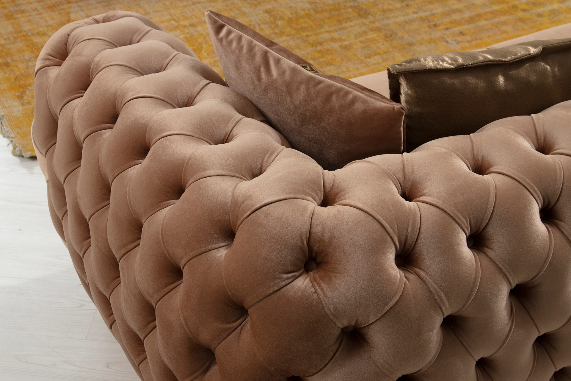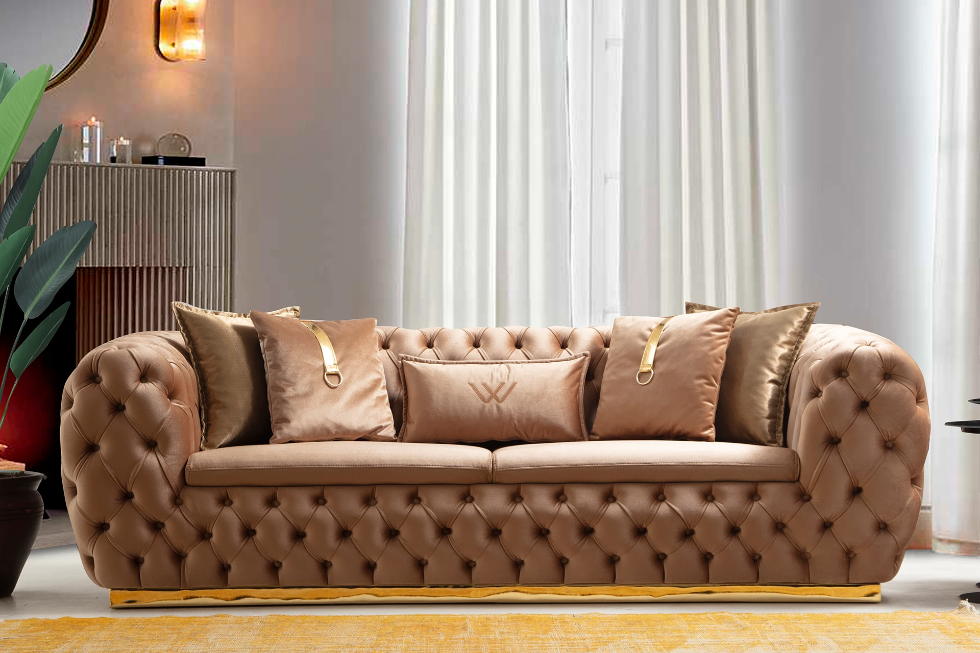 The Emperio sofa set exudes classic elegance with a modern twist. Its luxurious, tufted upholstery in rich shades of beige and caramel adds an opulent touch to the room. The smooth, rounded edges and deep-button detailing reflect timeless craftsmanship, while the gold accents at the base introduce a contemporary flair. Accompanied by a sleek, minimalist coffee table, this set offers a blend of traditional luxury and modern sophistication, making it a stunning focal point in any living space.