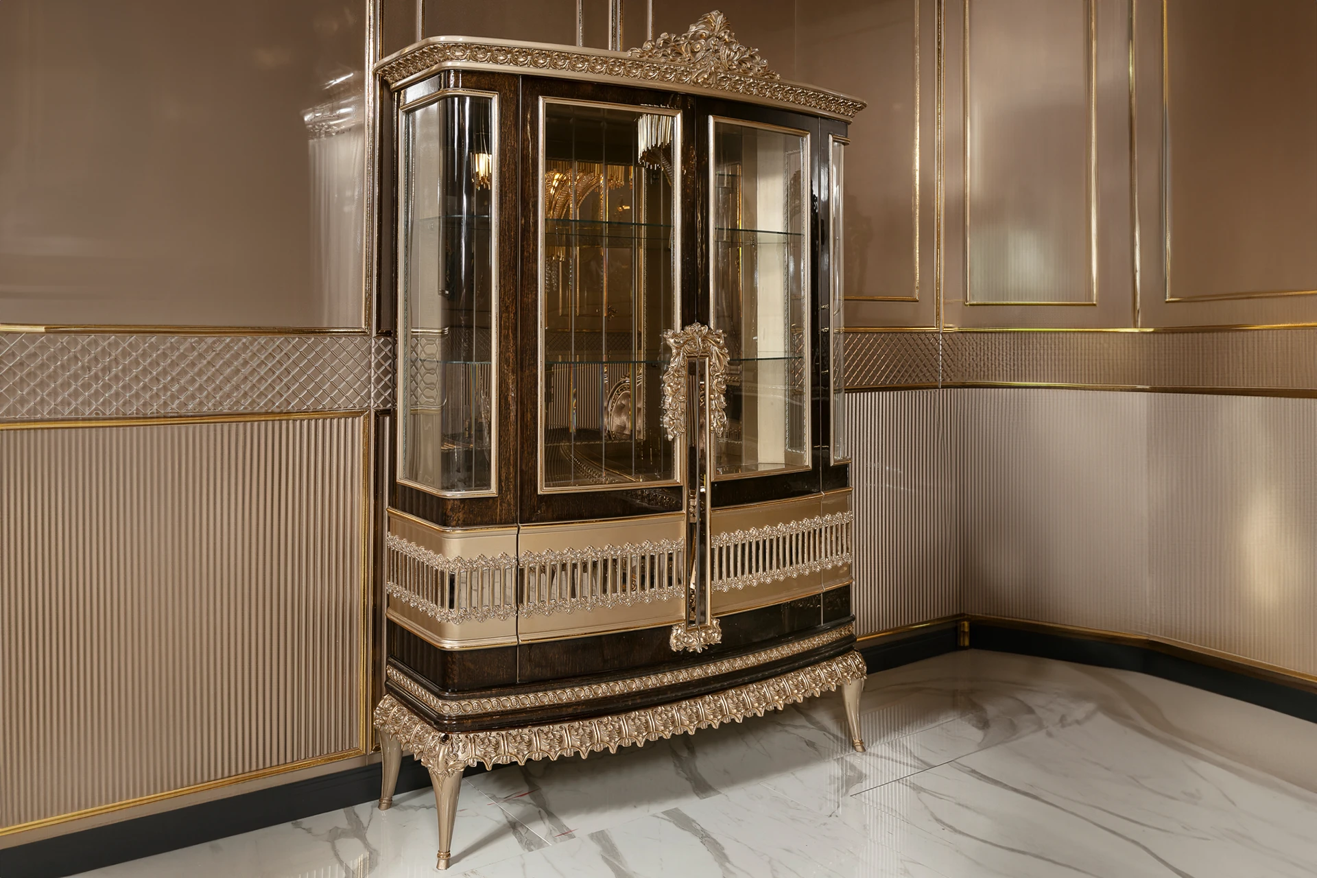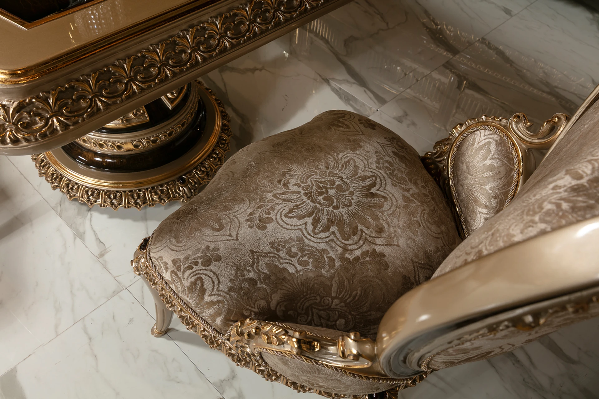 The Empire dining room set is the epitome of luxury and grandeur, offering a regal aesthetic that transforms any dining area into a sophisticated space. Its intricate detailing and high-quality finishes reflect timeless elegance, combining traditional craftsmanship with a contemporary flair. The set’s rich upholstery and ornate carvings on the chairs exude comfort and style, while the spacious dining table provides an impressive centerpiece for gatherings. With its lustrous golden accents and meticulously designed framework, the Empire set is perfect for those who desire a touch of opulence in their home. Ideal for hosting elegant dinners or special occasions, this set will leave a lasting impression.