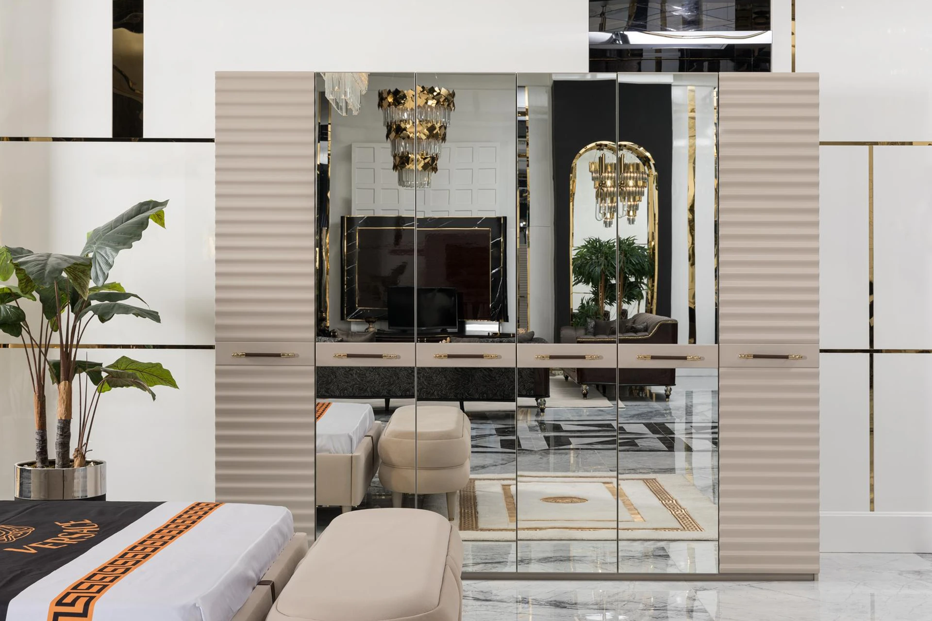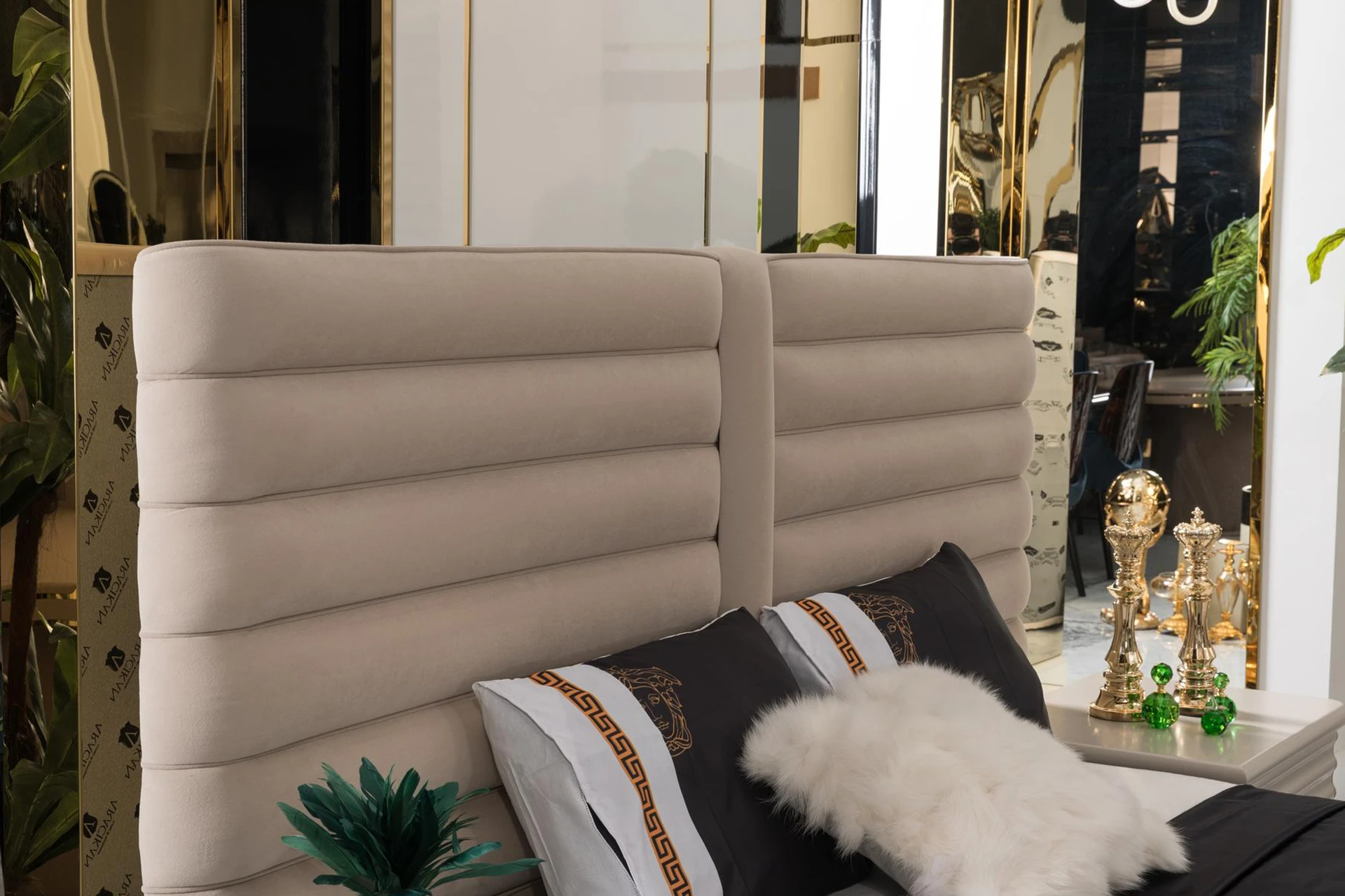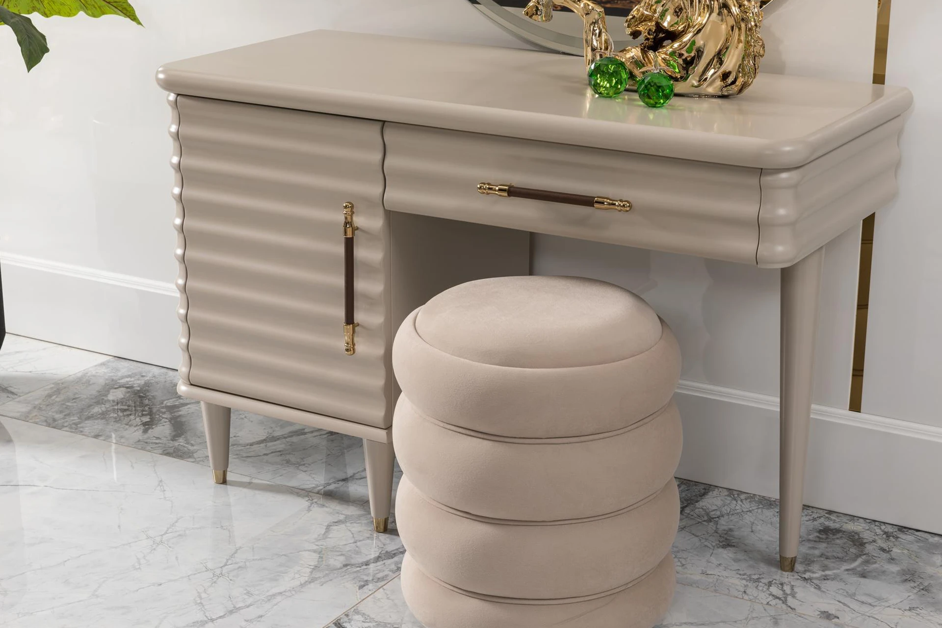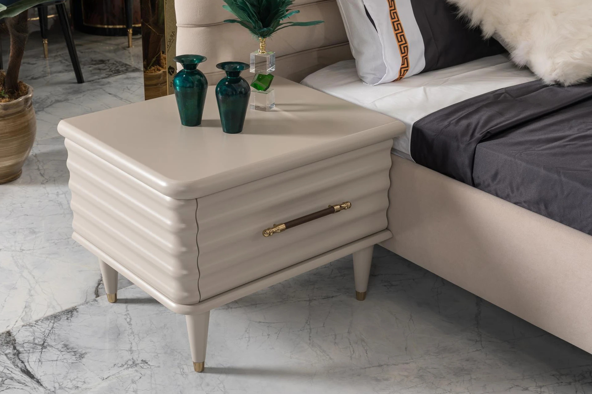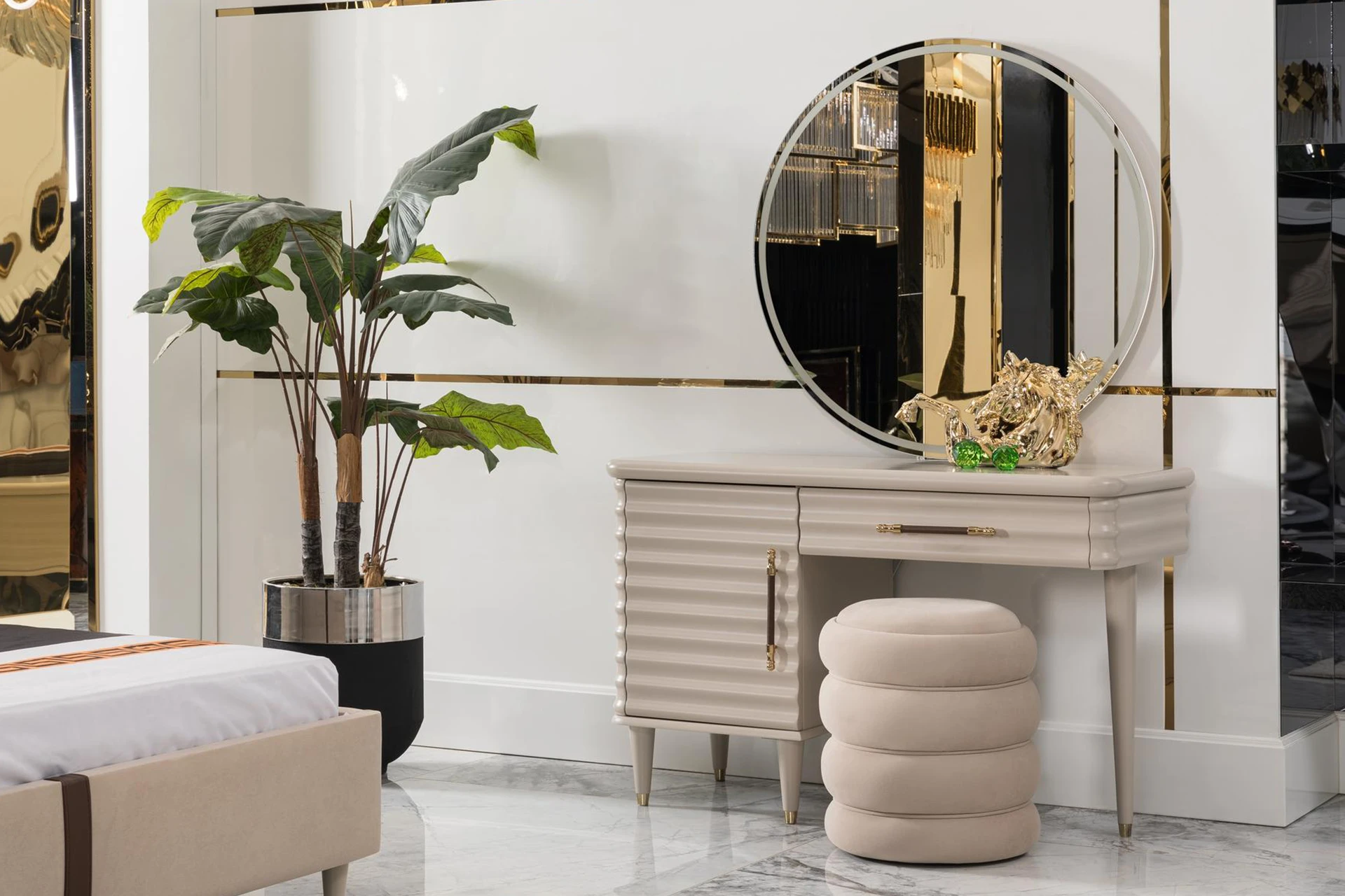 The Eyfel bedroom set offers a sophisticated retreat with its clean lines and neutral palette. The bed’s upholstered headboard features a unique layered design, providing both comfort and visual appeal. The set includes a chic nightstand with a ribbed texture, complementing the overall aesthetic. The accompanying vanity, complete with a circular mirror and plush stool, adds a touch of elegance, making this set perfect for those who desire a modern yet timeless bedroom ambiance.