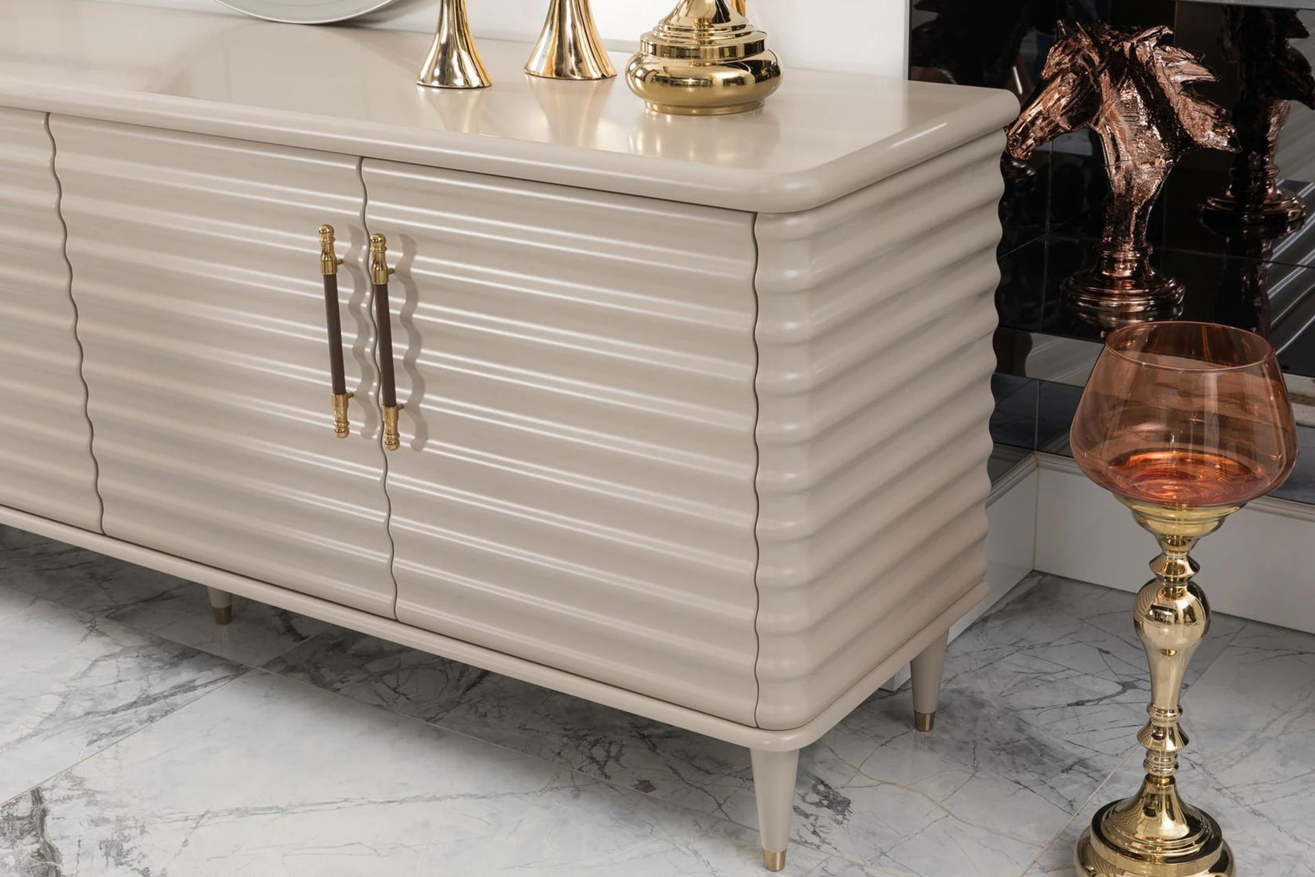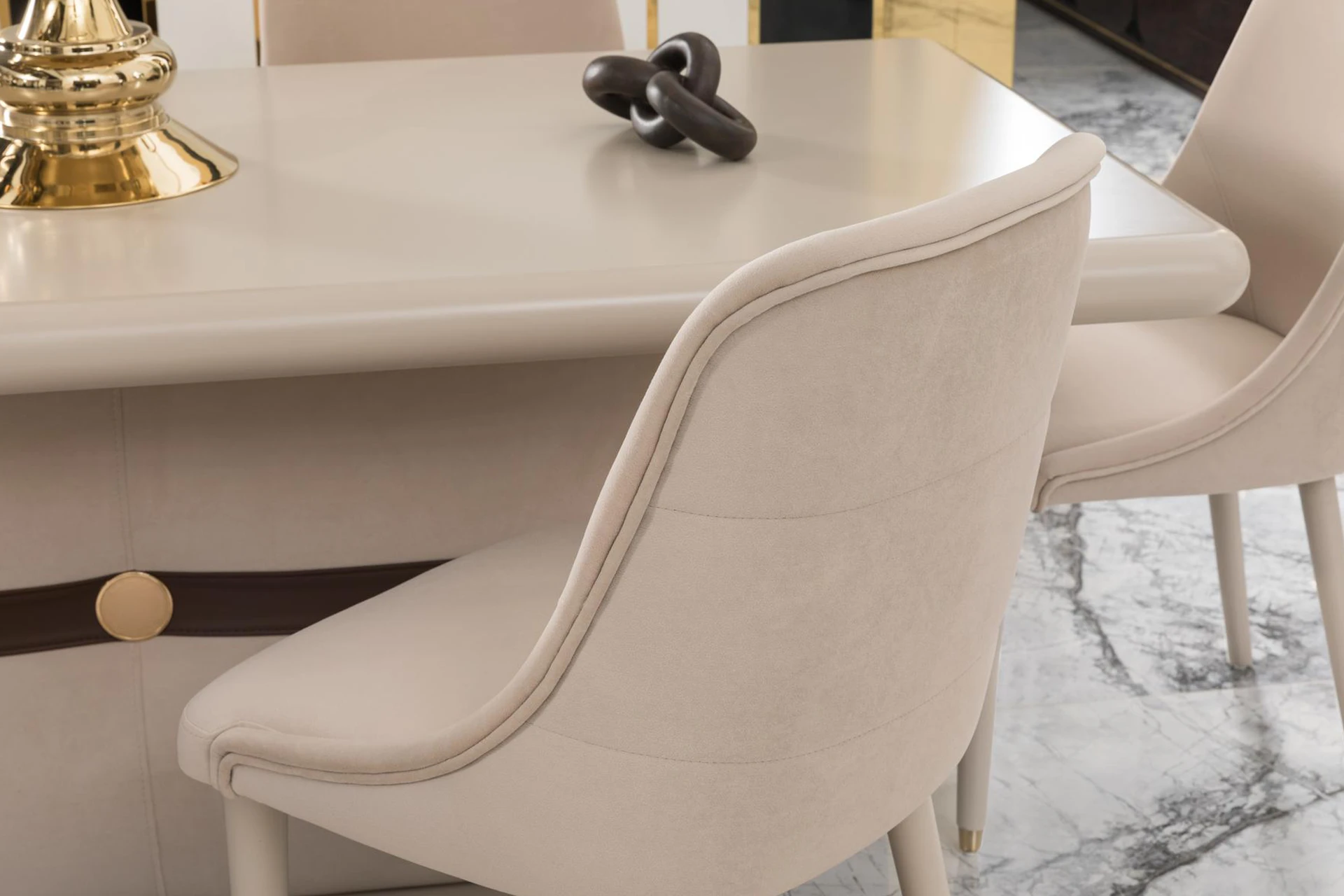The Eyfel dining room set brings an air of timeless elegance with its sleek lines and soft, neutral tones. The table’s rounded corners and subtle decorative accents create a harmonious balance between modernity and classic style. Paired with comfortable upholstered chairs, it offers an inviting space for family gatherings. The matching buffet, featuring a textured surface and accented with a sophisticated circular mirror, enhances the room’s aesthetic. This set is ideal for those seeking a dining experience that exudes understated luxury and refinement.