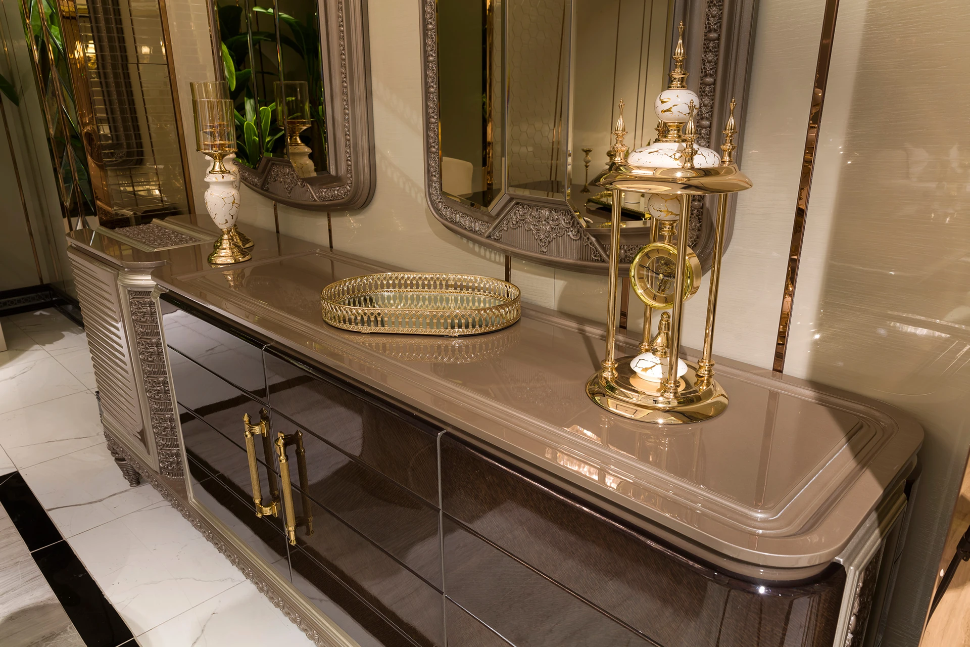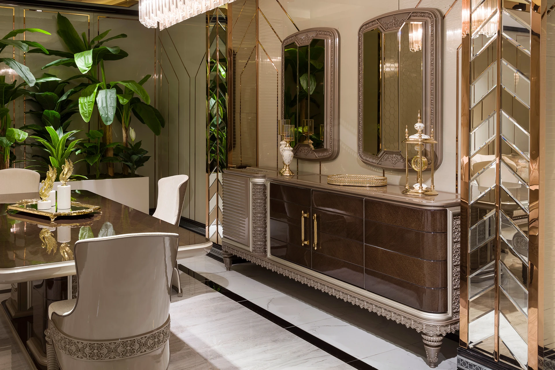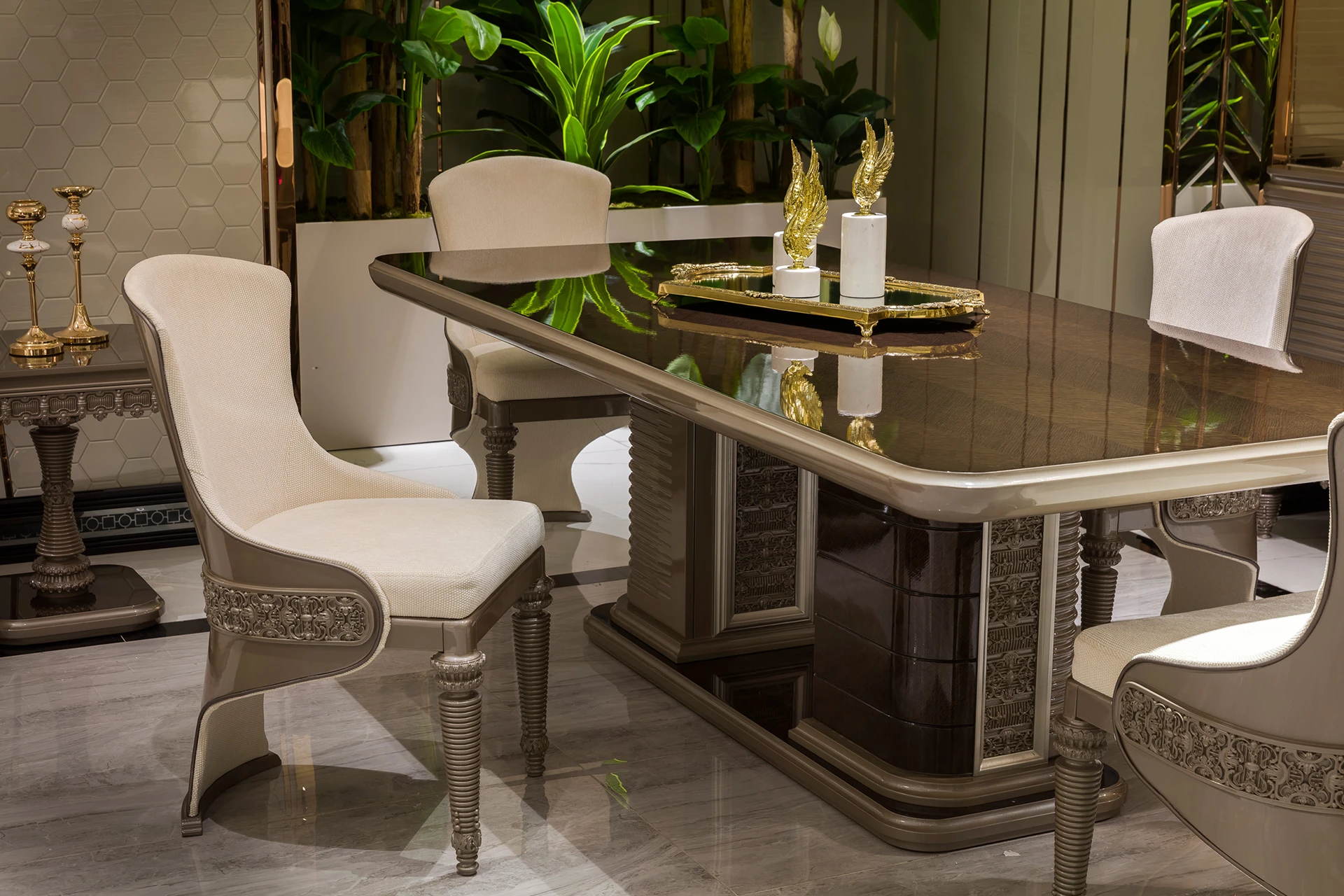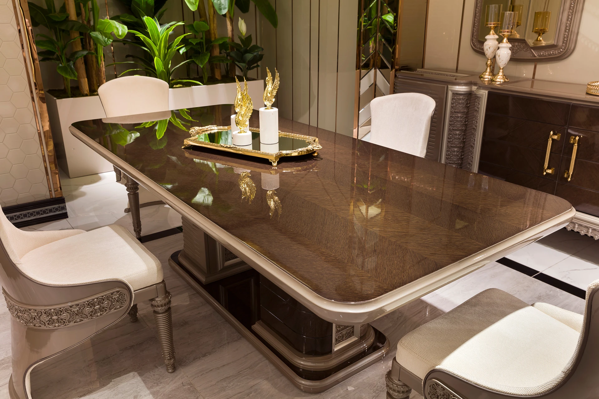 The Florya dining room set from the classic collection embodies a refined blend of elegance and modern luxury. The sleek dining table, with its glossy surface and gracefully curved legs, serves as a sophisticated centerpiece for your dining area. Paired with uniquely designed chairs that boast both comfort and style, this set elevates any mealtime experience. The intricate carvings on the table base and chair backs add a touch of classic opulence. Accompanied by a stylish sideboard featuring delicate detailing and ample storage, the Florya dining room set creates a harmonious and inviting dining space for any occasion.