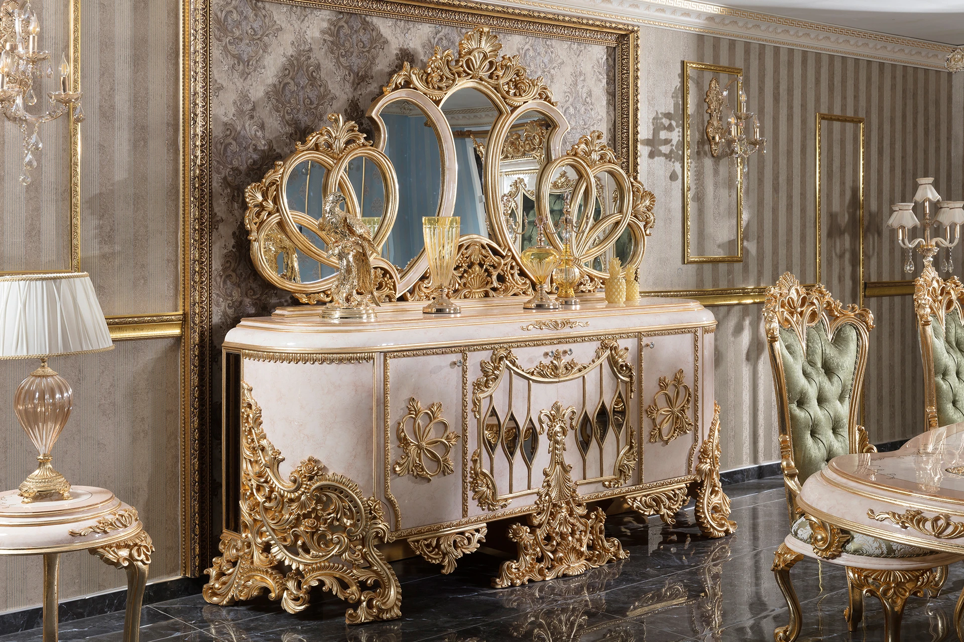 The Gold Elnor dining room set exudes grandeur with its ornate design. The lavish dining table features an intricately carved base adorned with golden accents, perfectly complementing its glossy surface. The upholstered chairs, finished in a soft green fabric, display exquisite carvings along the backrest and legs, adding a regal touch. The stunning buffet cabinet, with its elaborate mirror arrangement, amplifies the room’s luxurious feel, while the glass-fronted display cabinet completes the set, showcasing elegance and refinement. This dining room set is a true masterpiece of classic opulence.