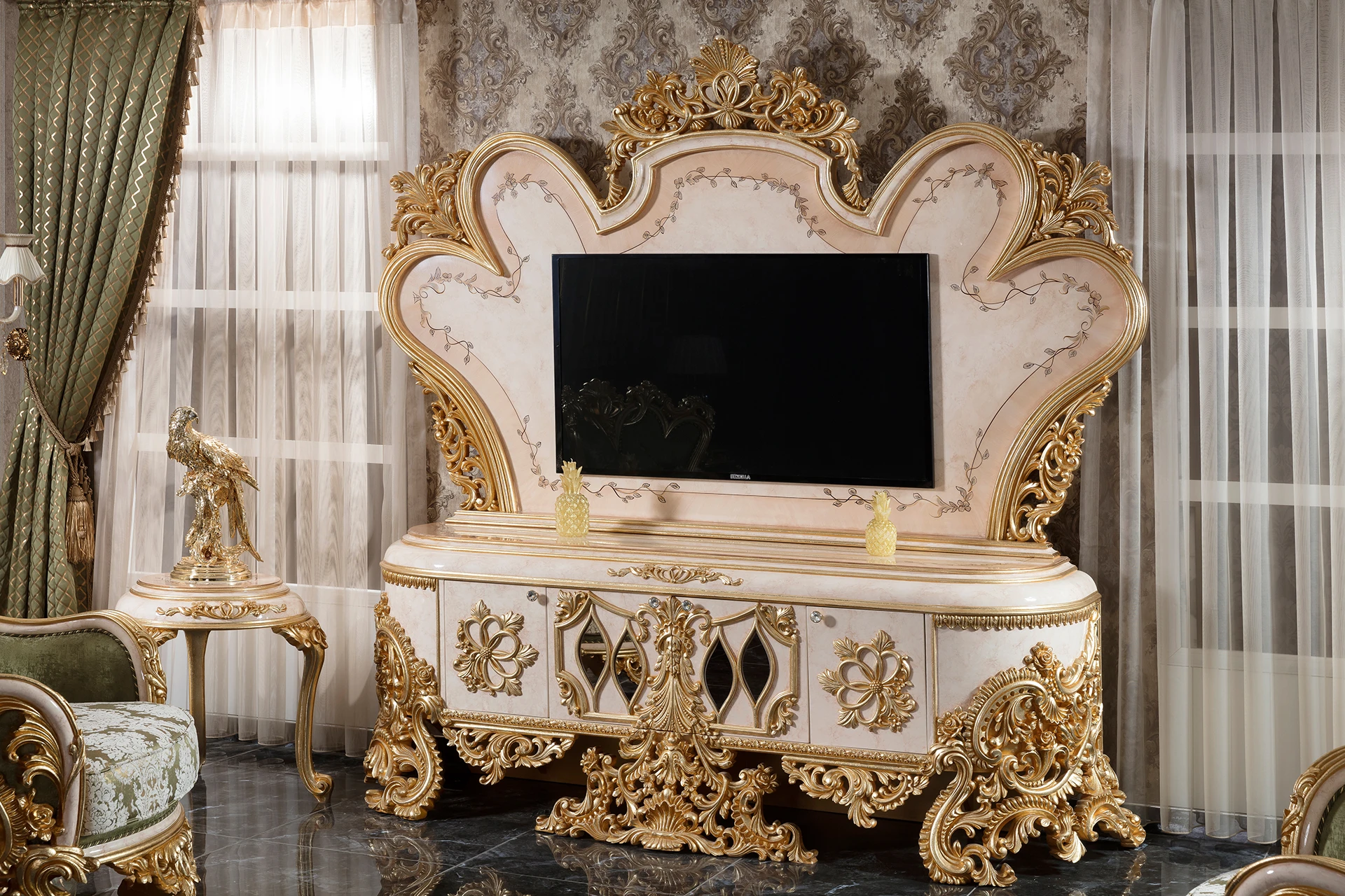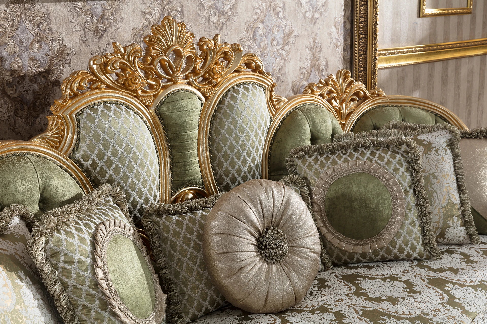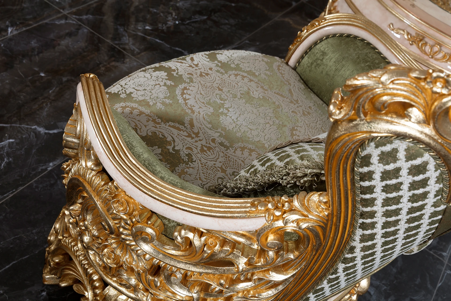 The Gold Elnor sofa set embodies luxurious grandeur with its intricately carved gold frame and plush upholstery. The set features lavishly detailed sofas and armchairs, adorned with rich patterns in elegant shades of green. The seating is complemented by exquisite cushions, adding layers of texture and comfort. A marble-topped coffee table sits at the center, framed by elaborate gold carvings, matching the overall opulent aesthetic of the set. This arrangement transforms any living space into a royal setting, exuding timeless sophistication and style.