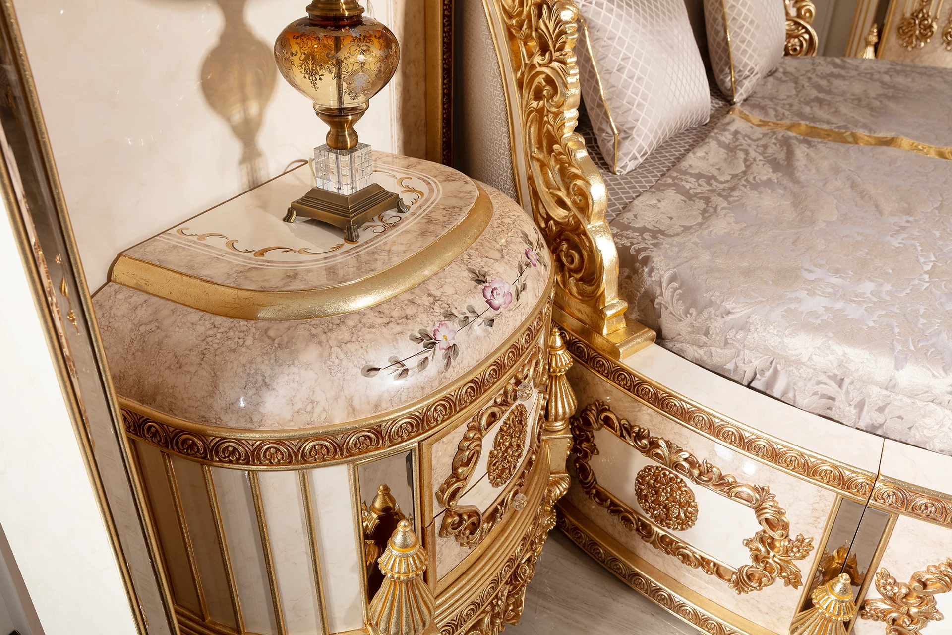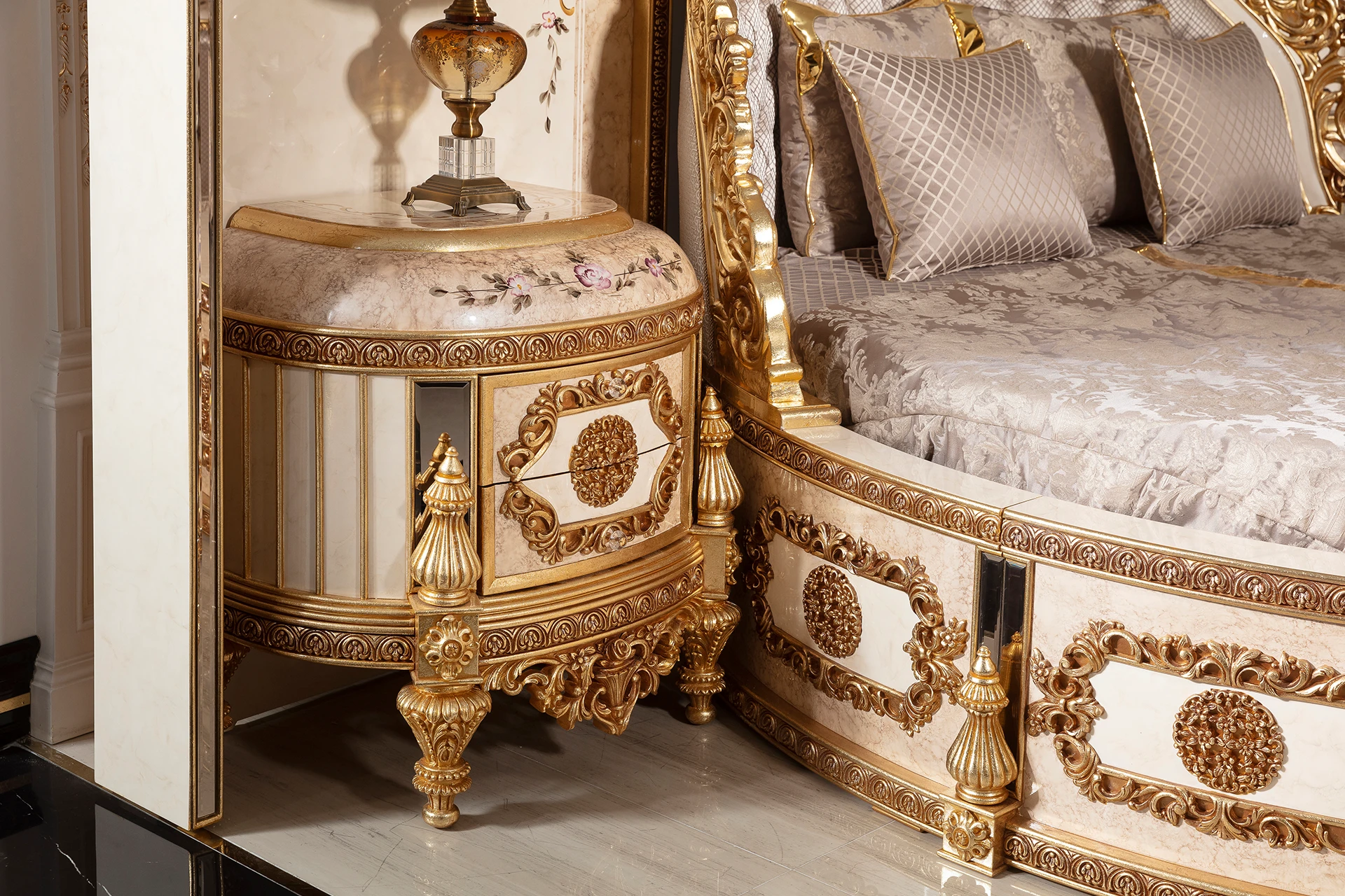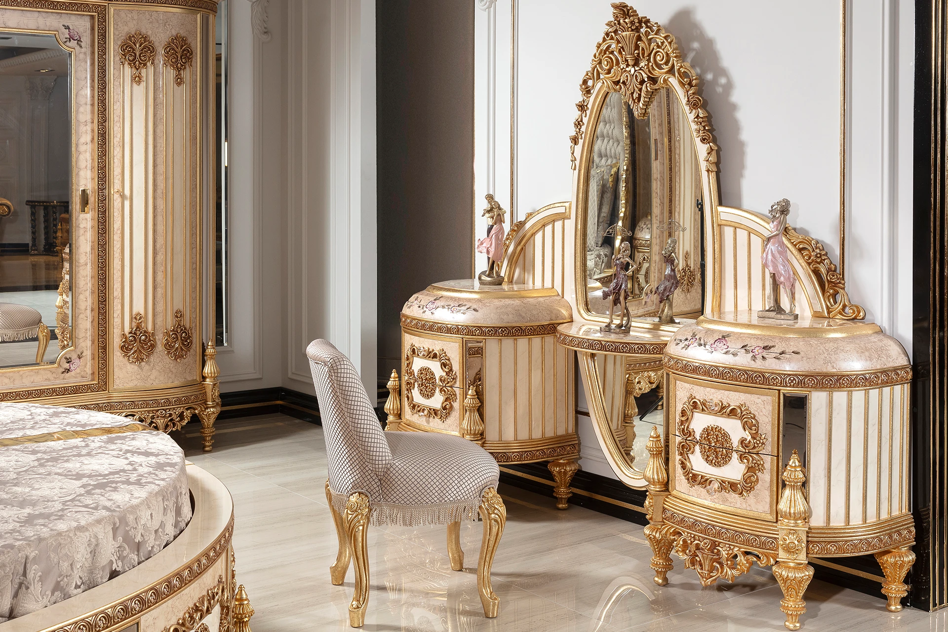 The Gold Hanzade bedroom set is a masterpiece of classic opulence and luxury. Its centerpiece, the stunning bed, features an exquisitely carved headboard with rich gold detailing, paired with an upholstered backrest that adds a regal touch. The bed frame’s ornate design extends to the nightstands, which are adorned with intricate carvings and a gleaming finish. The matching wardrobe is a true work of art, boasting beautifully detailed patterns and ample storage space. The set includes a vanity with a grand mirror, featuring elegant curves and accents that embody timeless sophistication. This bedroom set is designed to create an atmosphere of grandeur and royal comfort.