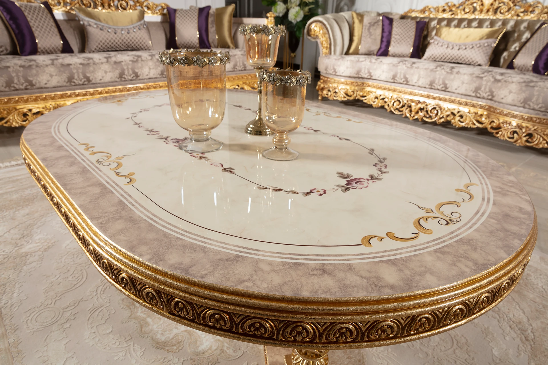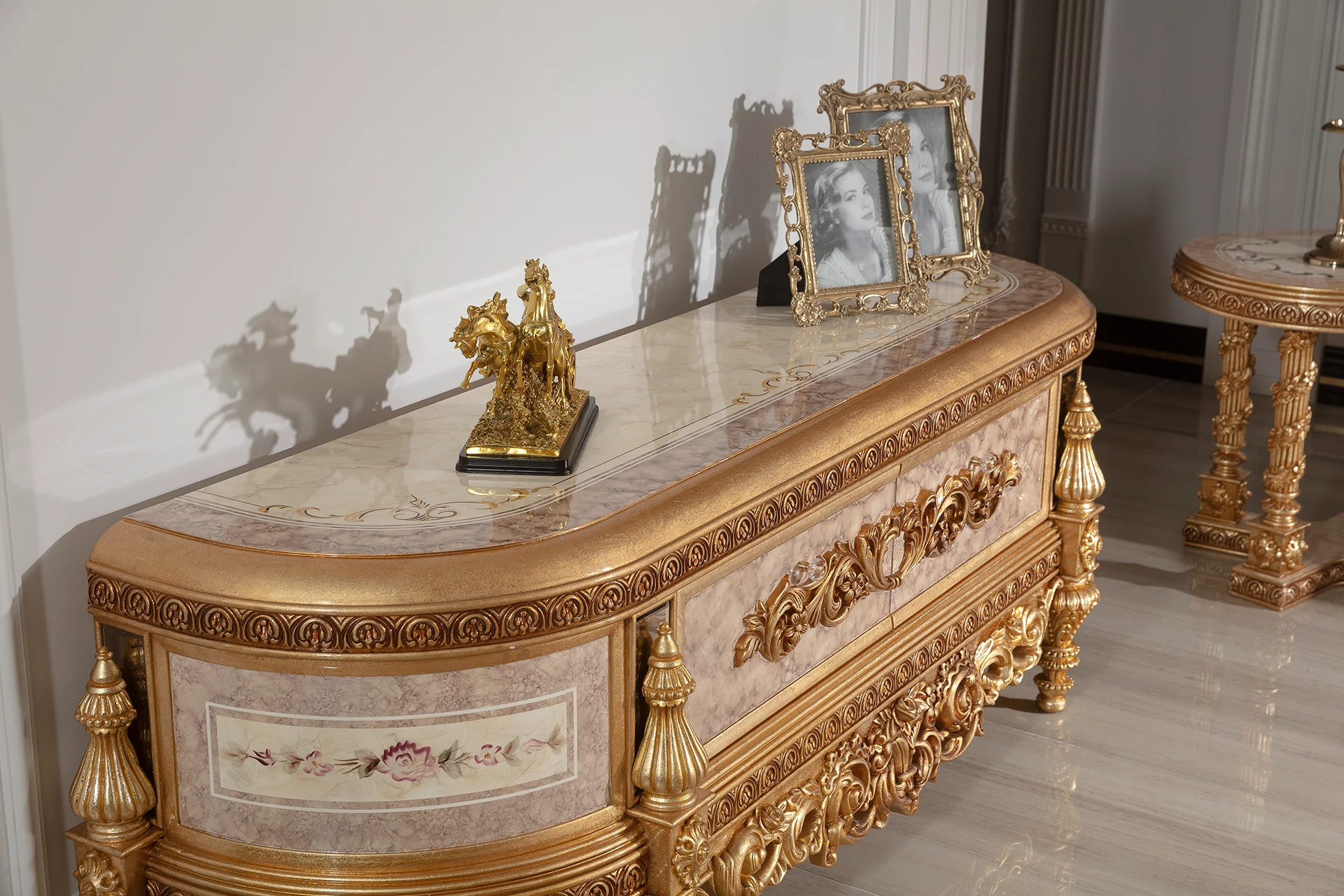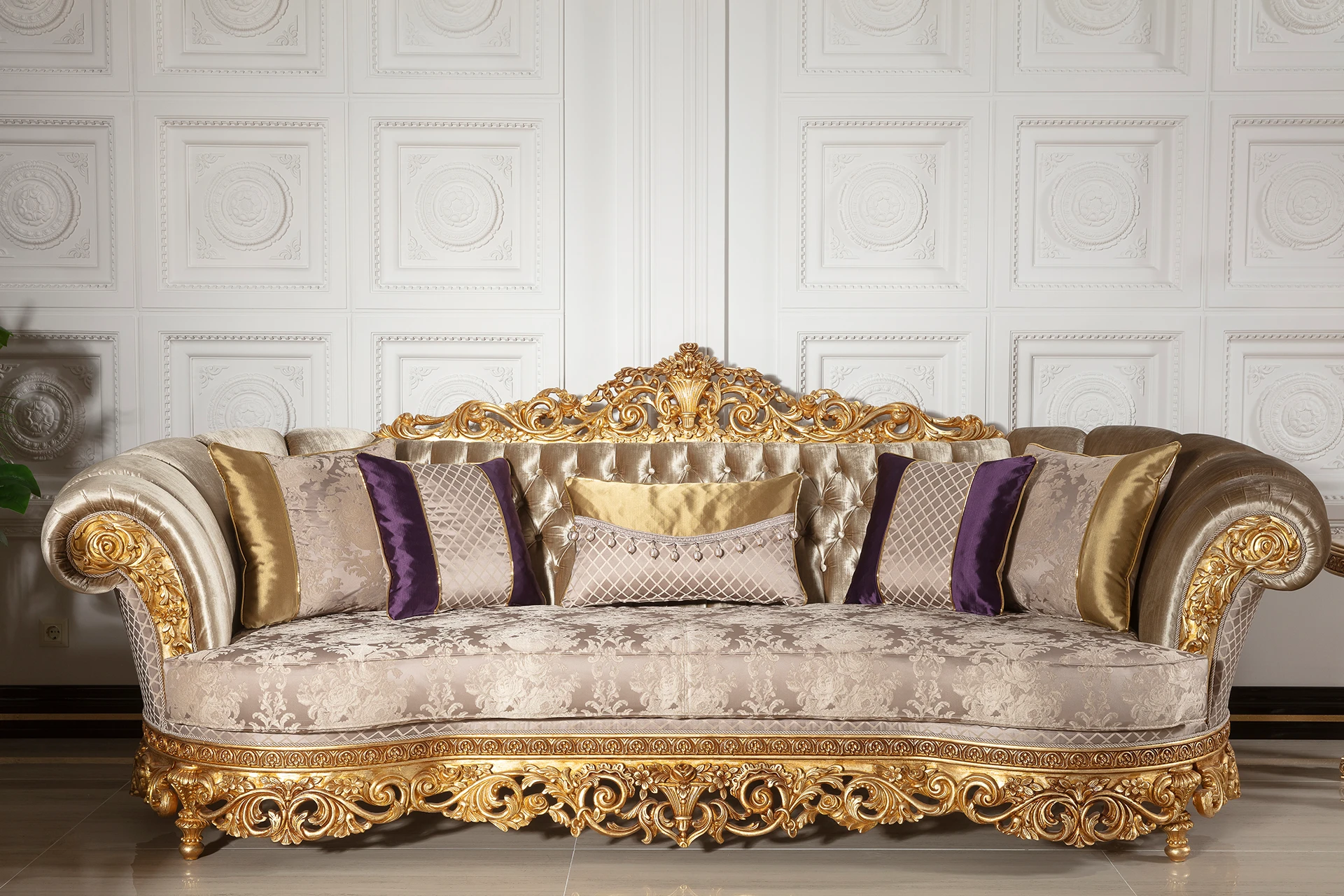 The Gold Hanzade sofa set radiates luxury and elegance, combining classic design elements with rich golden accents. Each sofa features intricate carvings on its frame, showcasing the mastery of craftsmanship. The upholstery boasts a refined pattern, while the plush cushions, highlighted with hints of gold and deep colors, add a layer of comfort and opulence. The armchairs, echoing the sofa’s grandeur, feature gracefully curved arms and lavish detailing. Complementing the set is a marble-topped coffee table with ornate gold accents, making it an ideal focal point for a sophisticated living space. This ensemble embodies regal charm for a truly majestic atmosphere.