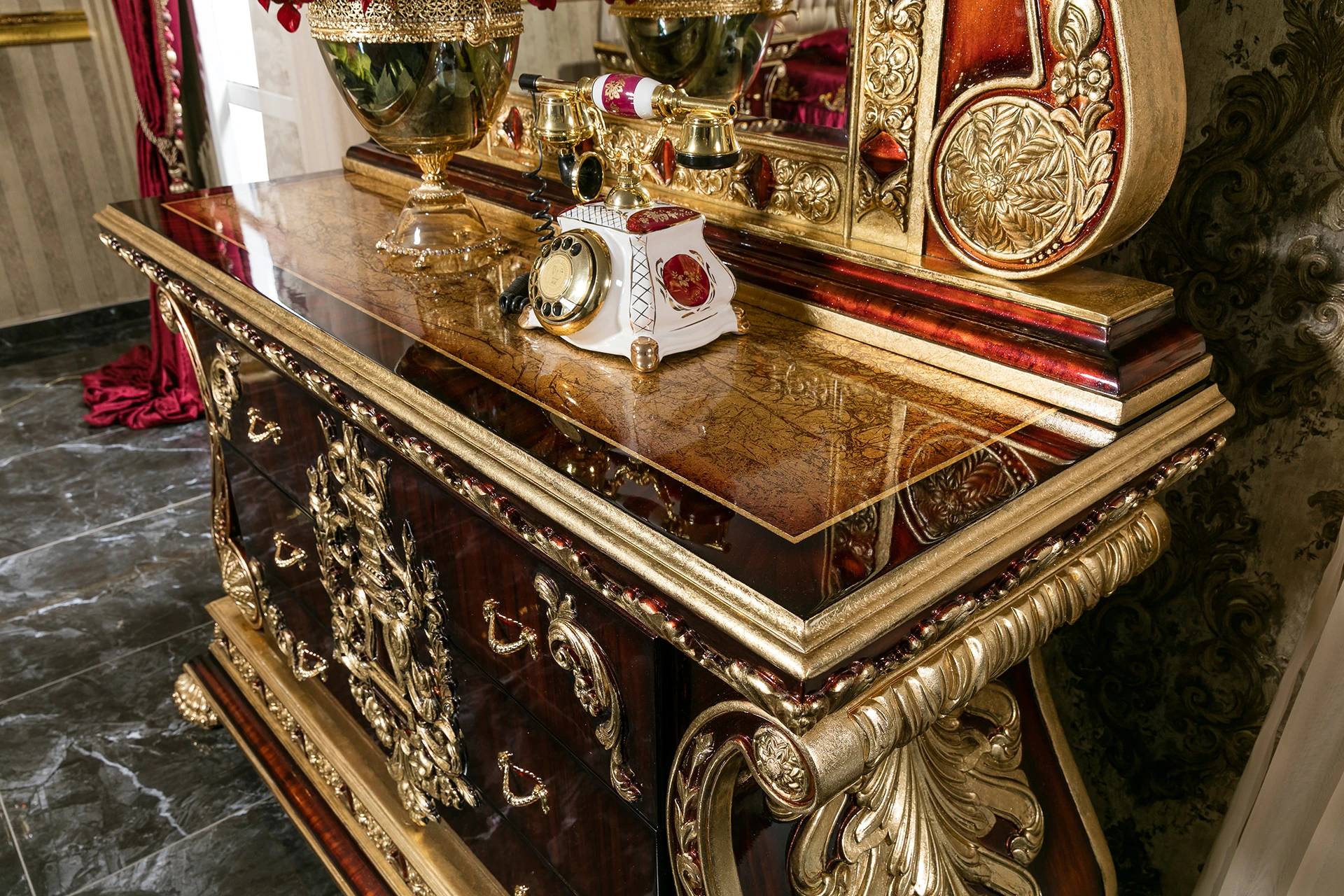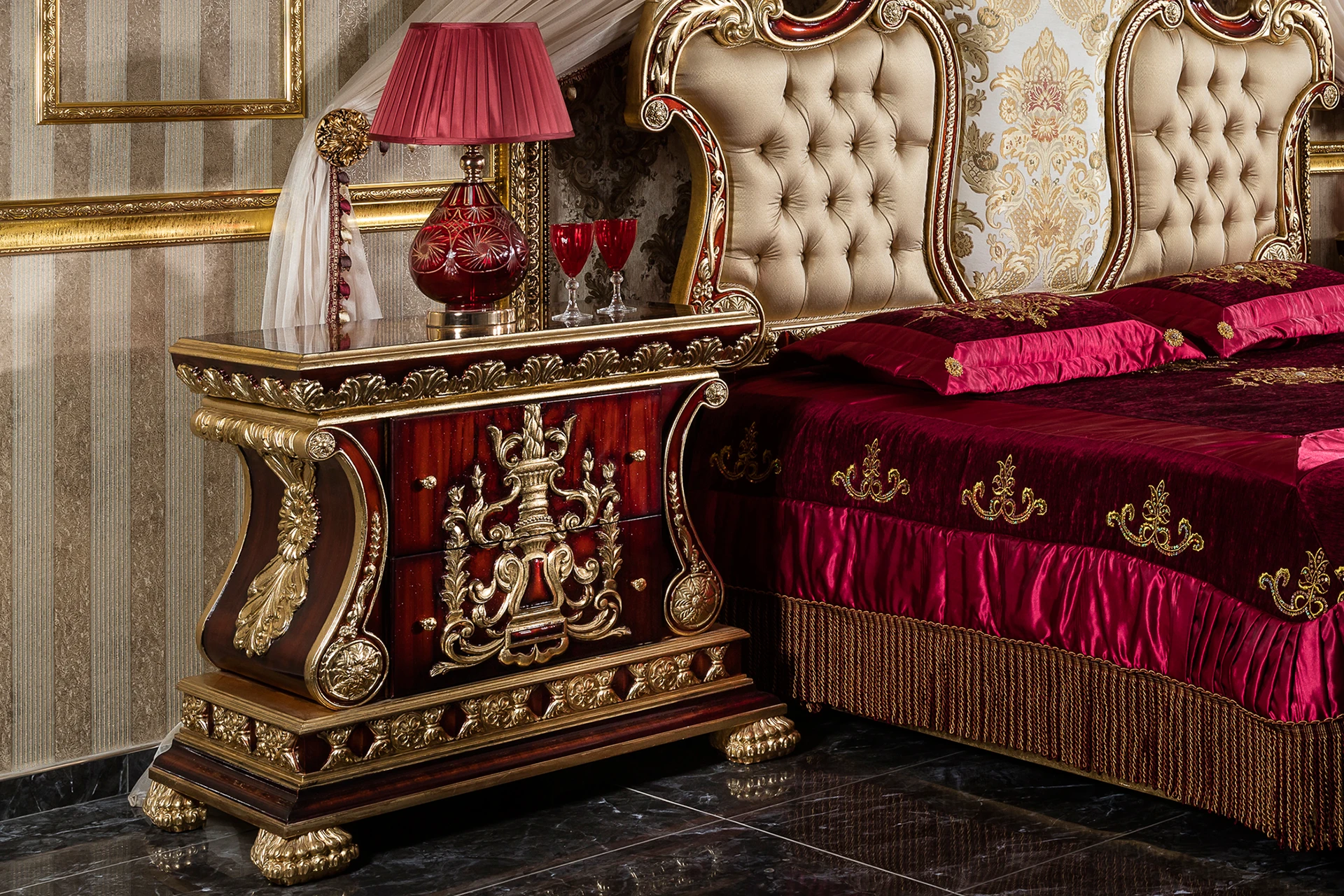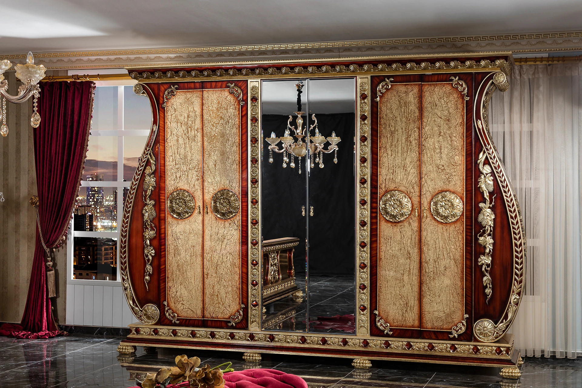 Experience the opulence of the Gondol bedroom set, a masterpiece that brings royal luxury to your space. The bed features an intricately carved headboard, adorned with golden accents and rich, velvety upholstery for an exquisite touch. The accompanying nightstands echo the elegance with detailed woodwork and lavish embellishments. The grand wardrobe, with its mirrored doors and ornate carvings, offers both style and ample storage. The set is completed with a plush, tufted bench that adds an extra layer of sophistication. The gondol bedroom set transforms any bedroom into a majestic sanctuary of comfort and style.