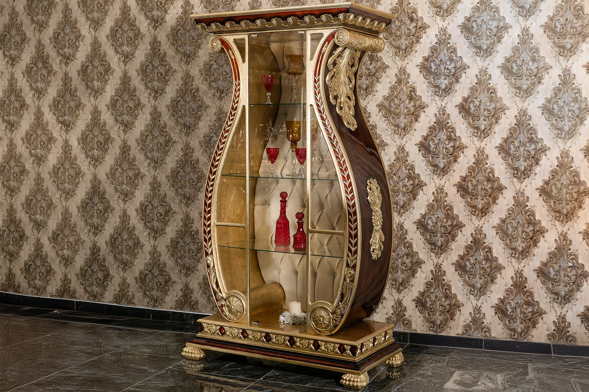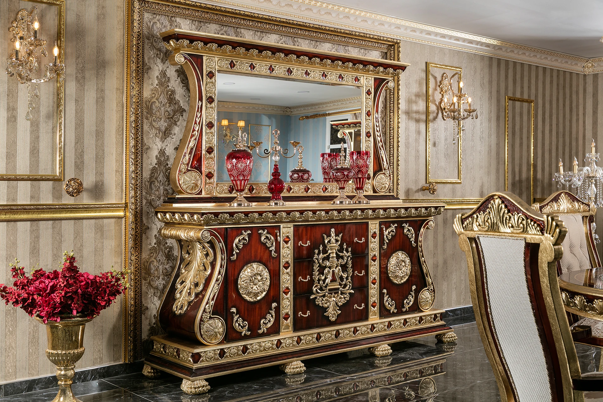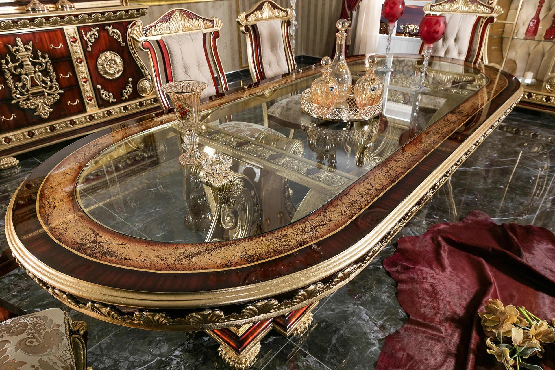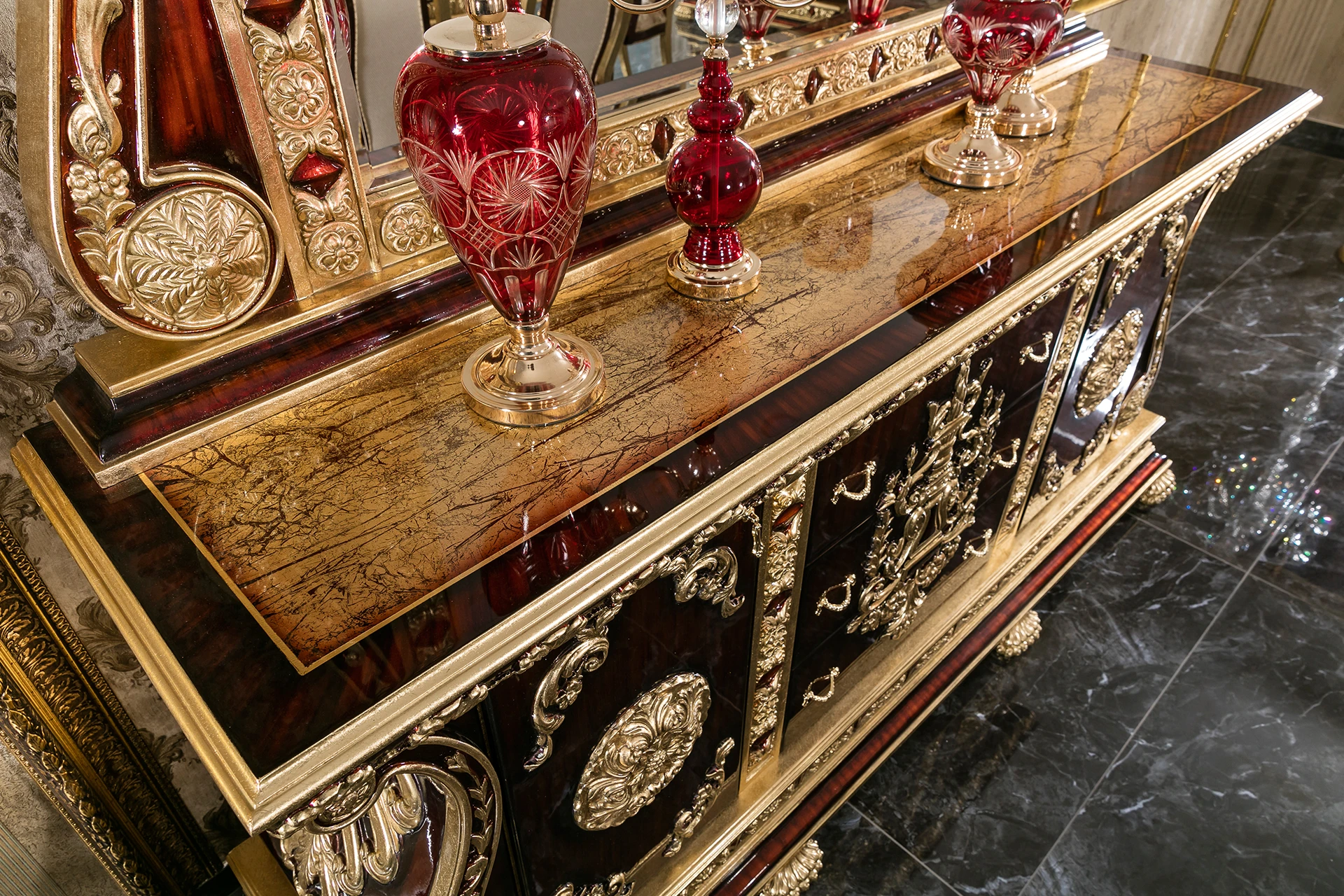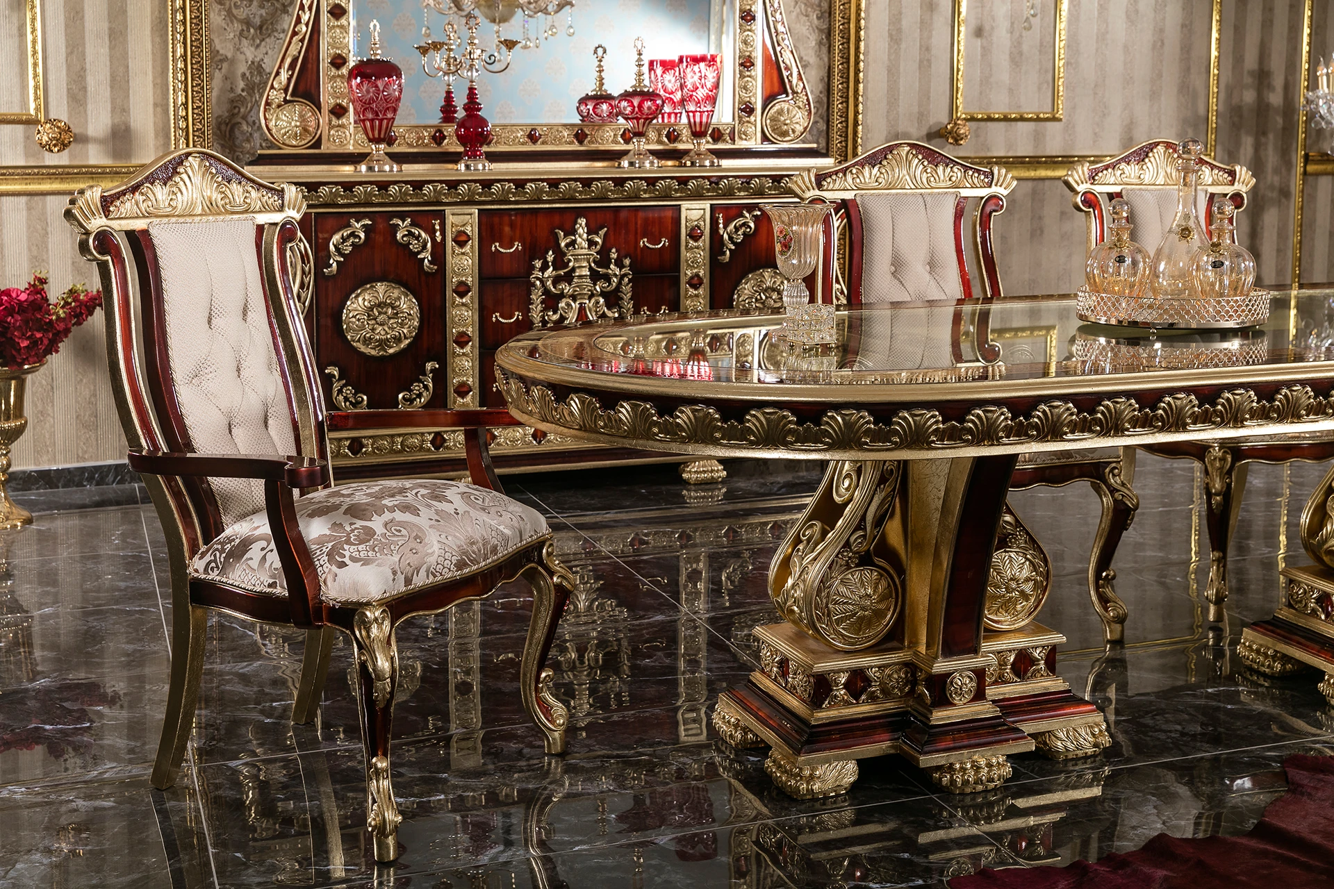 The epitome of luxurious dining, the Gondol dining room set radiates opulence with its magnificent design. Crafted with elaborate woodwork, the table showcases an exquisite blend of classic motifs and golden accents, creating a centerpiece that exudes grandeur. Paired with plush, upholstered chairs featuring intricately carved frames, this set promises both comfort and elegance. The accompanying buffet and hutch boast detailed carvings and a rich, glossy finish, offering ample storage while adding to the room’s regal ambiance. This dining room set is perfect for those who wish to dine in an atmosphere of sophistication and timeless beauty.