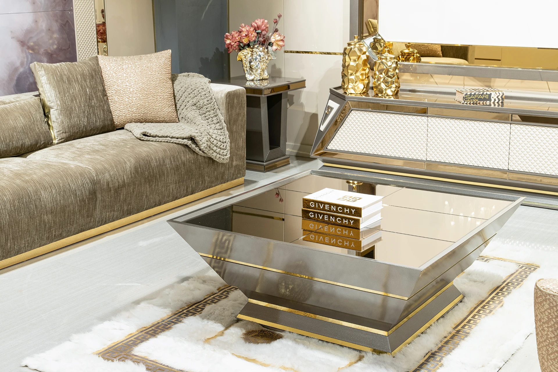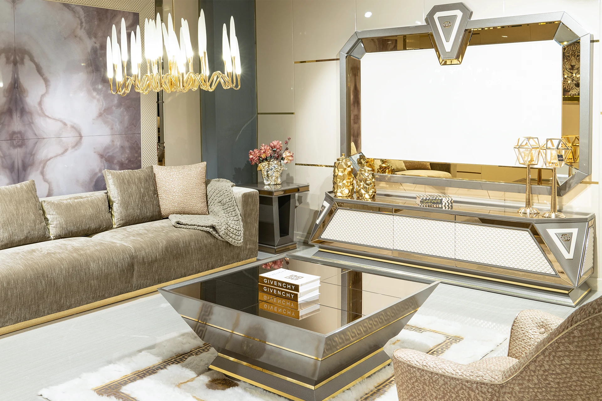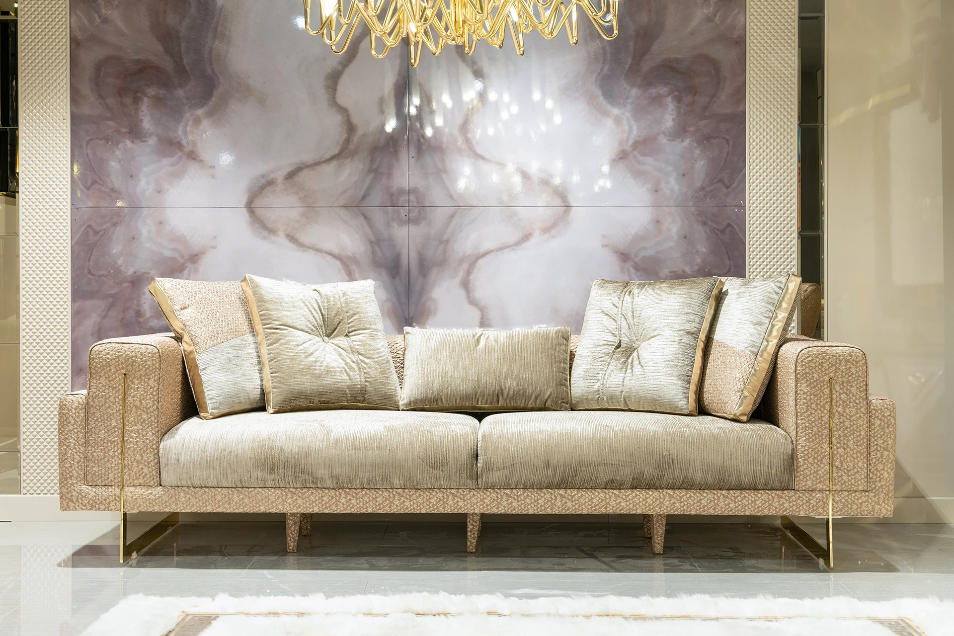 The Goodness sofa set exudes a modern luxury vibe with its soft neutral tones and elegant textures. The muted gold and beige hues provide a serene, sophisticated atmosphere, while the plush fabric on the sofa and chairs enhances comfort. The sleek, angular coffee table adds a contemporary flair, complemented by the eye-catching chandelier overhead. The soft, reflective surfaces and metallic accents throughout the room give the space an understated yet glamorous appeal. The overall design combines warmth with modern luxury, making it an inviting and stylish living space.