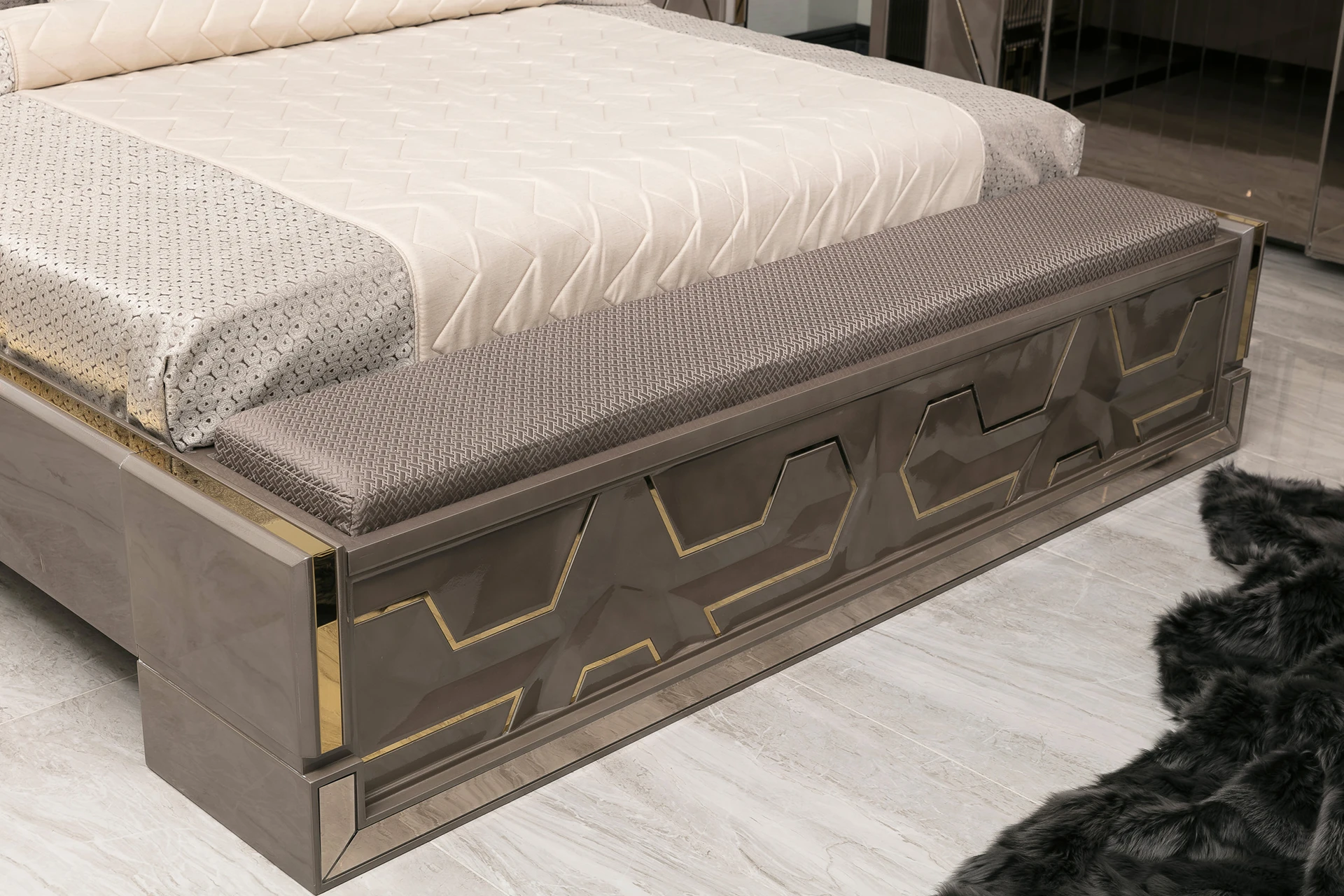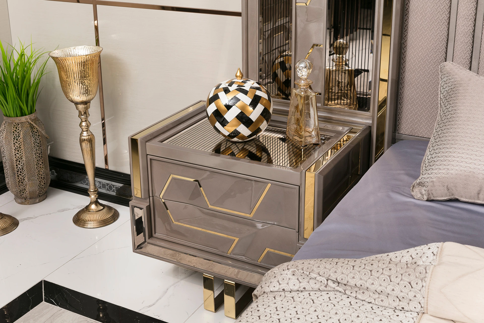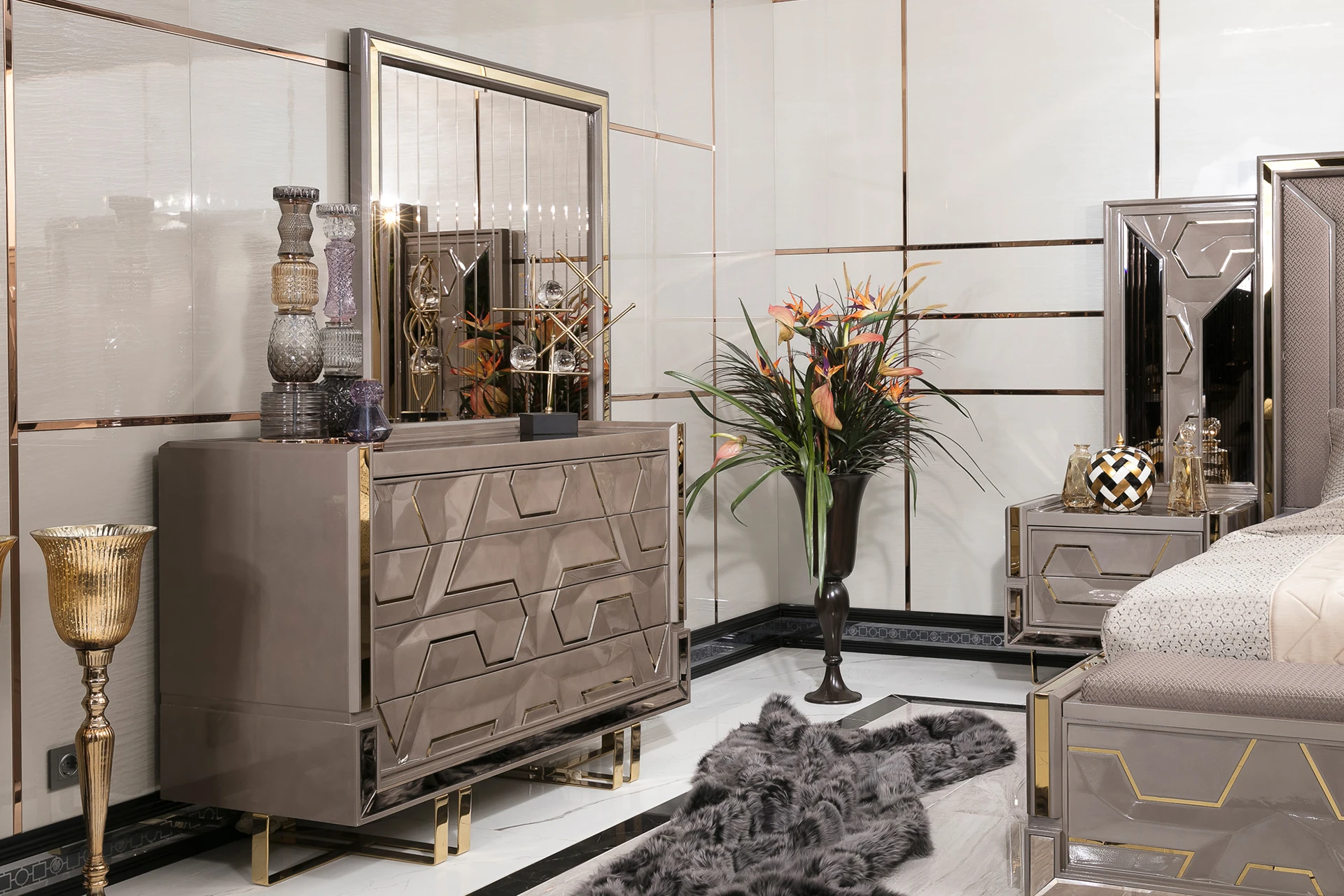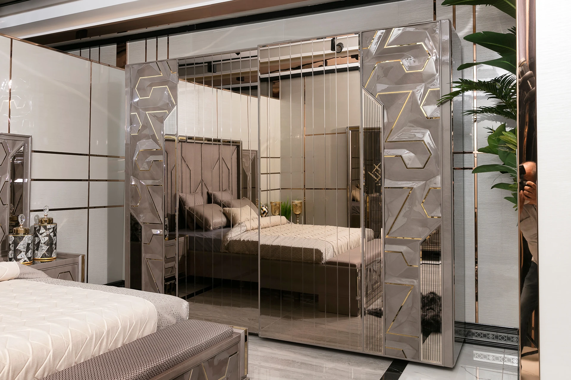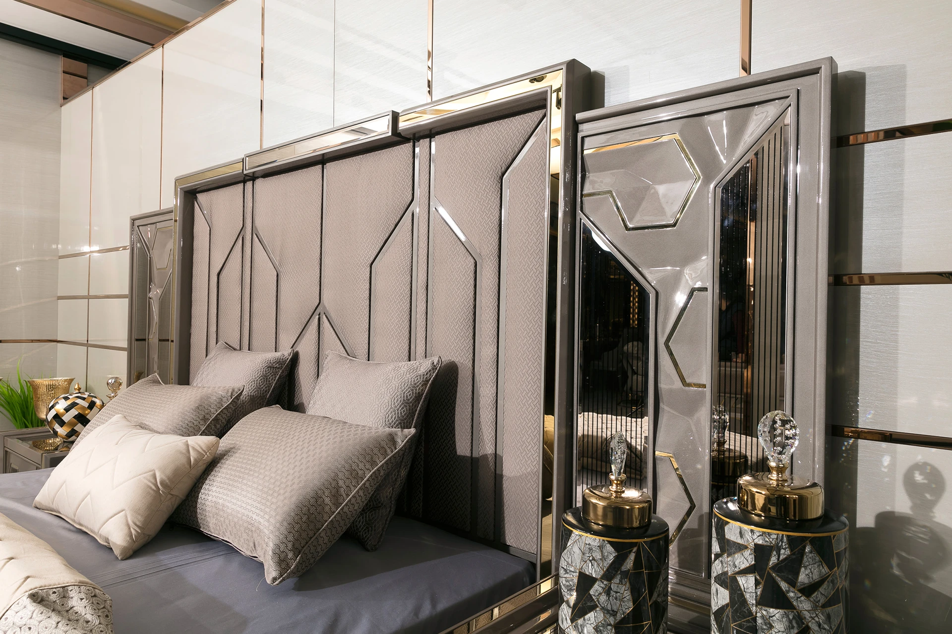 The epitome of modern elegance, the Gusto bedroom set transforms your space into a luxurious retreat. This set features a bold, geometric pattern on the headboard and wardrobe, accented with sleek, high-gloss finishes for a refined look. The spacious wardrobe with mirrored doors adds a touch of sophistication while enhancing the room’s light and depth. The bedside tables boast contemporary lines and convenient storage, complementing the plush bed frame designed for ultimate comfort. The gusto bedroom set is perfect for those who appreciate stylish, high-end living.