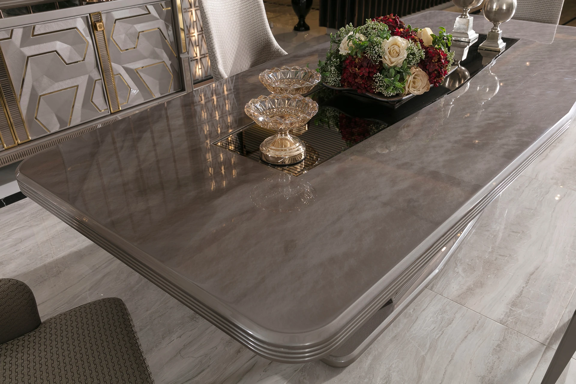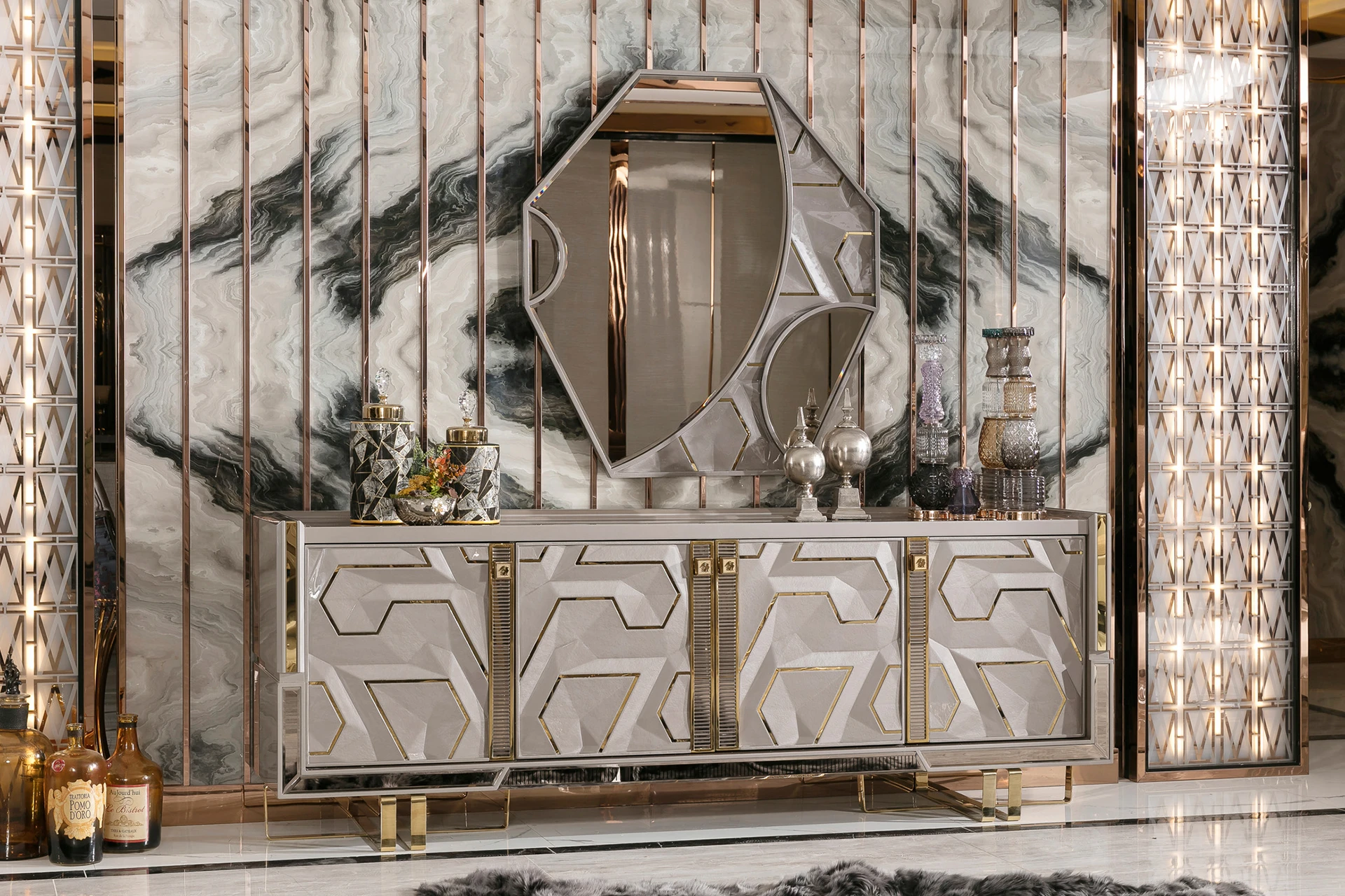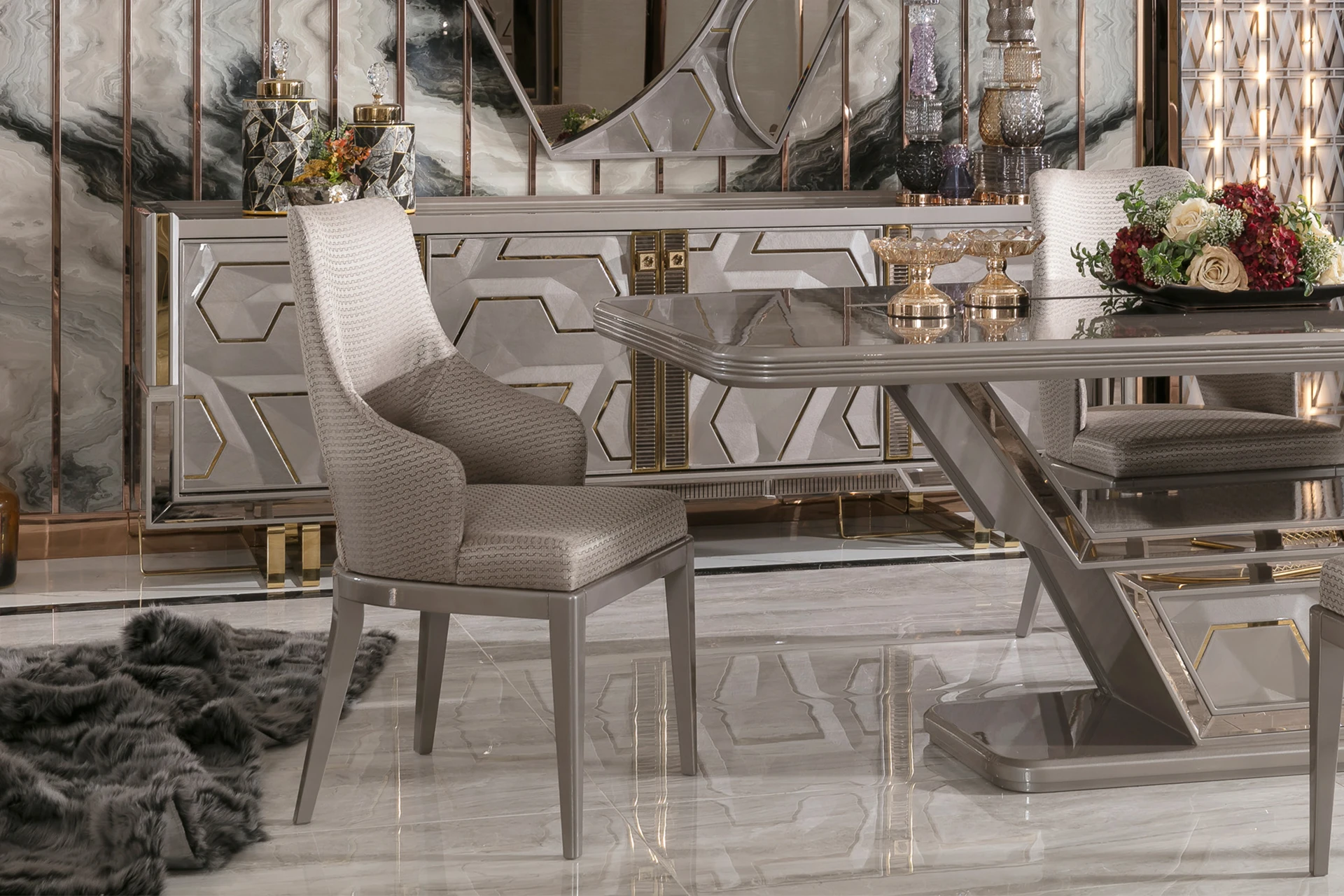 Transform your dining experience with the Gusto dining room set, where modern design meets luxurious elegance. The sleek, geometric patterns on the dining table and buffet showcase impeccable craftsmanship, while the high-gloss finish adds a touch of sophistication. Paired with plush, ergonomically designed chairs, this set promises both comfort and style. The centerpiece mirror with its unique geometric shape complements the contemporary aesthetic, creating an eye-catching focal point. Gusto is perfect for those who desire a chic and refined dining atmosphere.