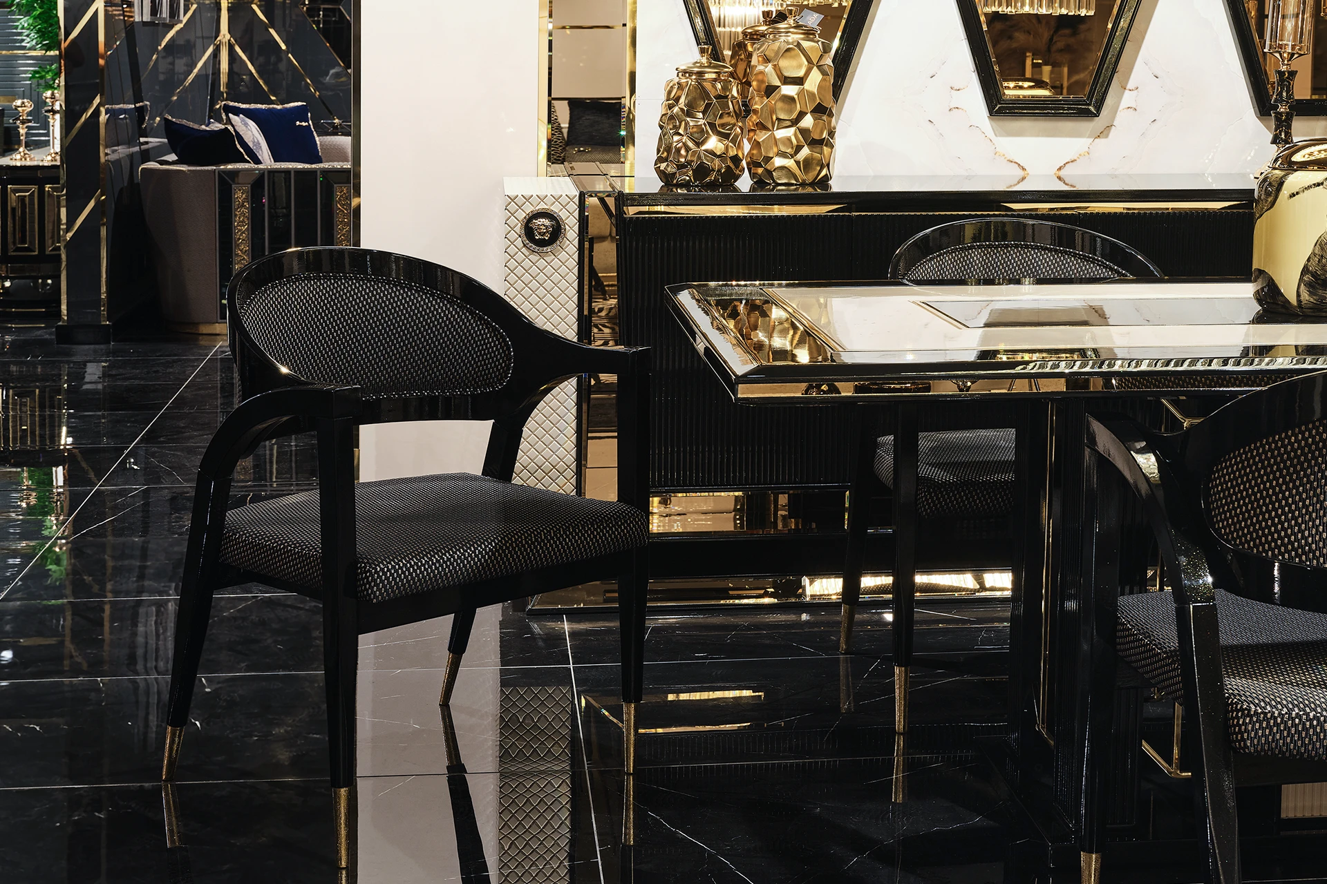 The Hera dining room set embodies a luxurious and modern aesthetic, combining sleek black and gold tones with a reflective, high-gloss finish. The glass-top dining table features bold, geometric base designs that emphasize sophistication and grandeur. The surrounding black chairs with gold-accented legs seamlessly blend into the design, offering a comfortable yet stylish seating option.