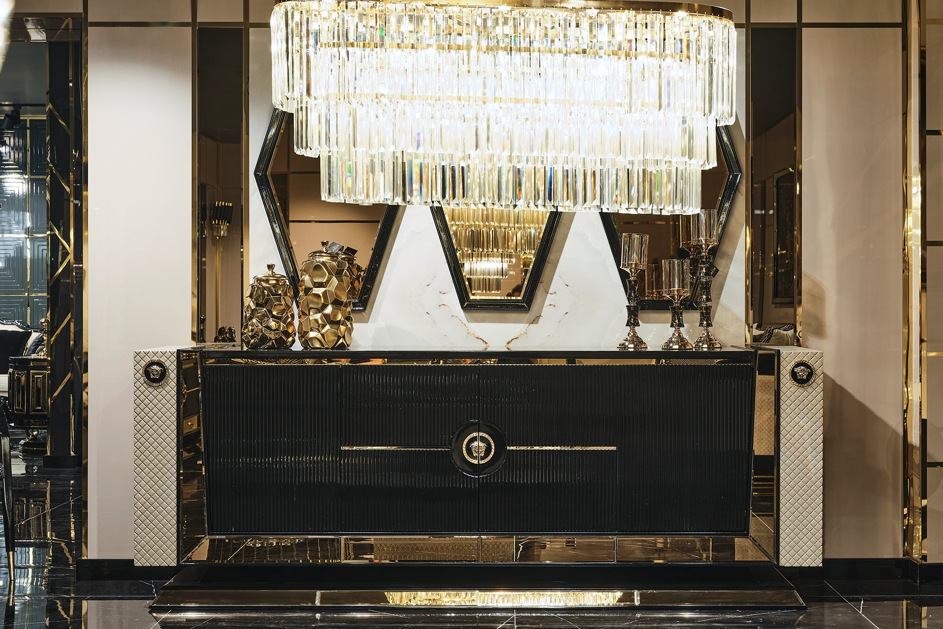 The chandelier above the table creates a stunning focal point, with cascading glass elements adding an air of opulence to the room. Hexagonal mirrors on the wall and decorative vases complement the overall setting, while the black and gold sideboard adds both functionality and elegance. This dining set is perfect for those who appreciate contemporary luxury and bold design choices.