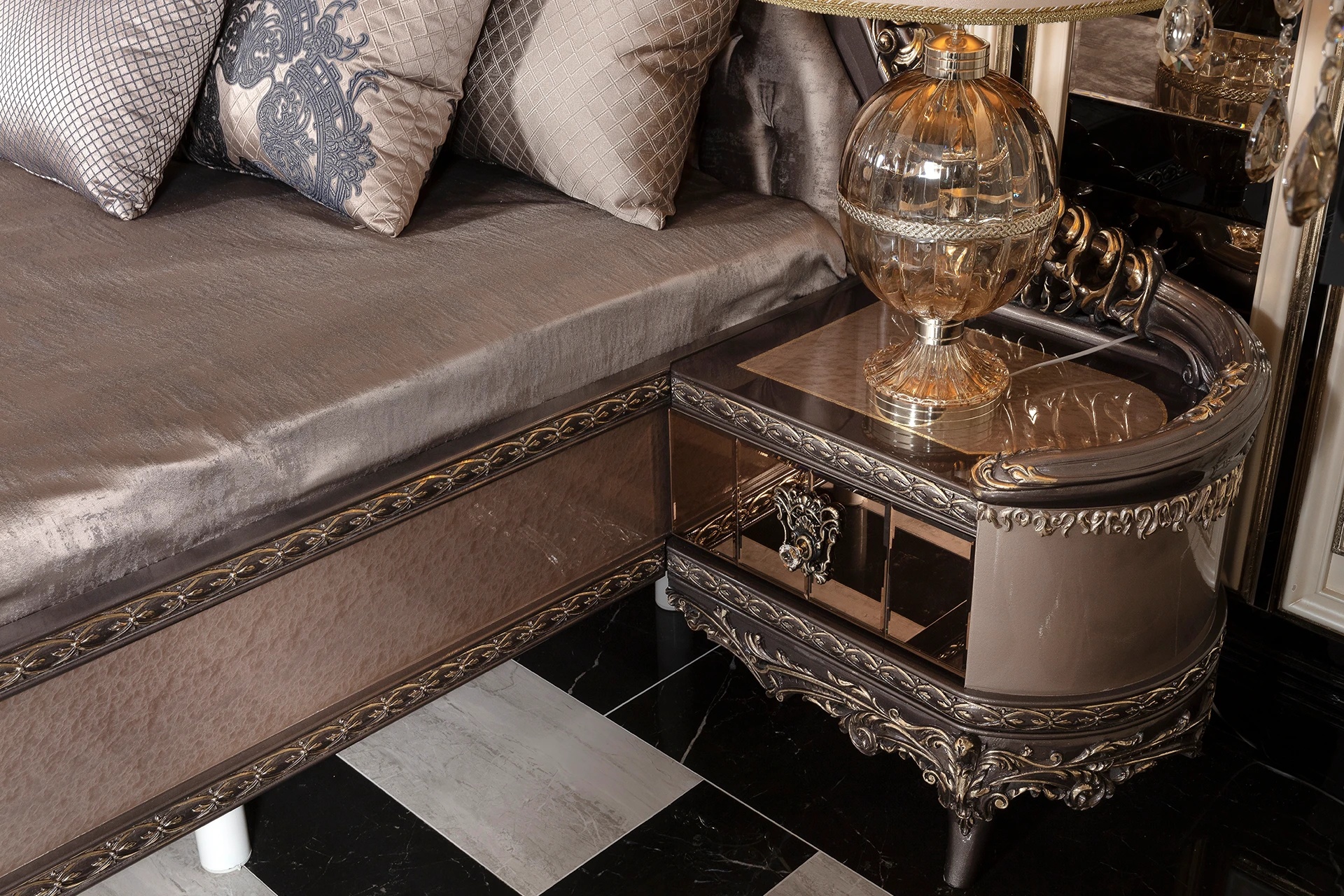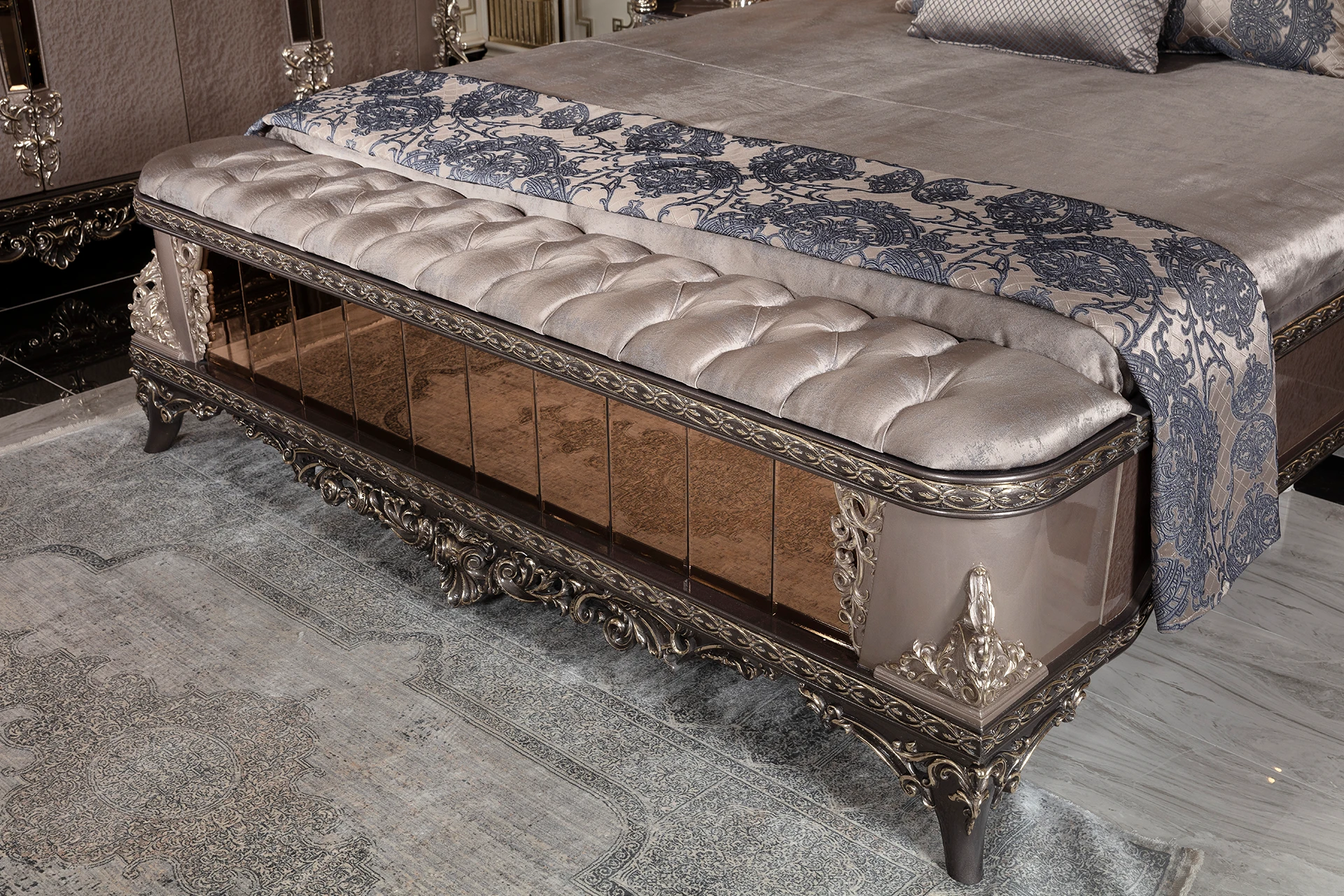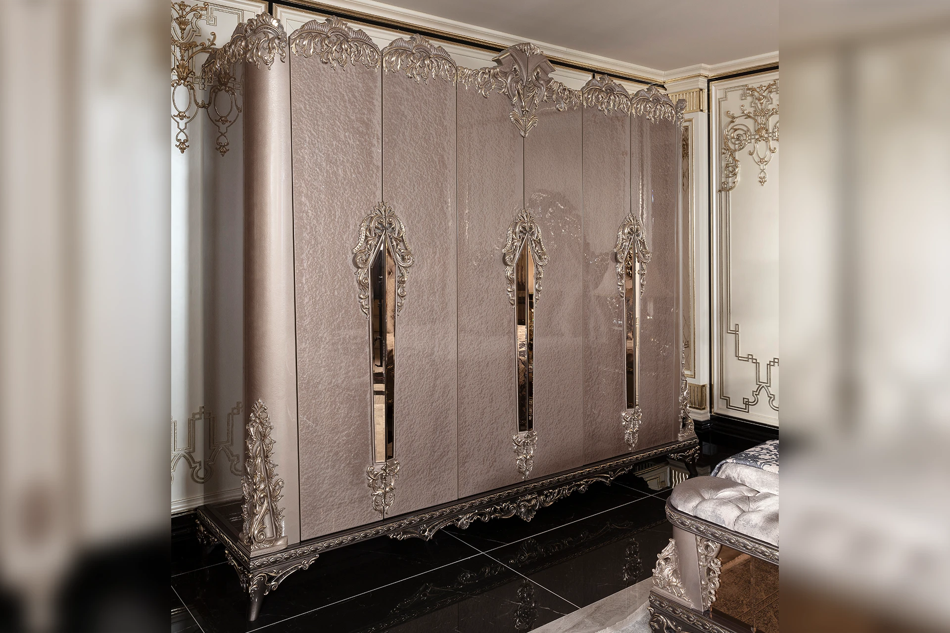 The Hisar bedroom set showcases an exquisite blend of elegance and craftsmanship, perfect for a luxurious retreat. Its intricately detailed headboard, adorned with delicate carvings and plush upholstery, offers both comfort and regal sophistication. The wardrobe and nightstands complement the design with sleek mirrored surfaces and ornate accents, enhancing the room’s opulent feel. The neutral tones combined with metallic embellishments create a timeless atmosphere, making this set ideal for those who seek a refined and serene sleeping environment. Every element in the Hisar bedroom set reflects luxury, transforming your space into a palace-like sanctuary.