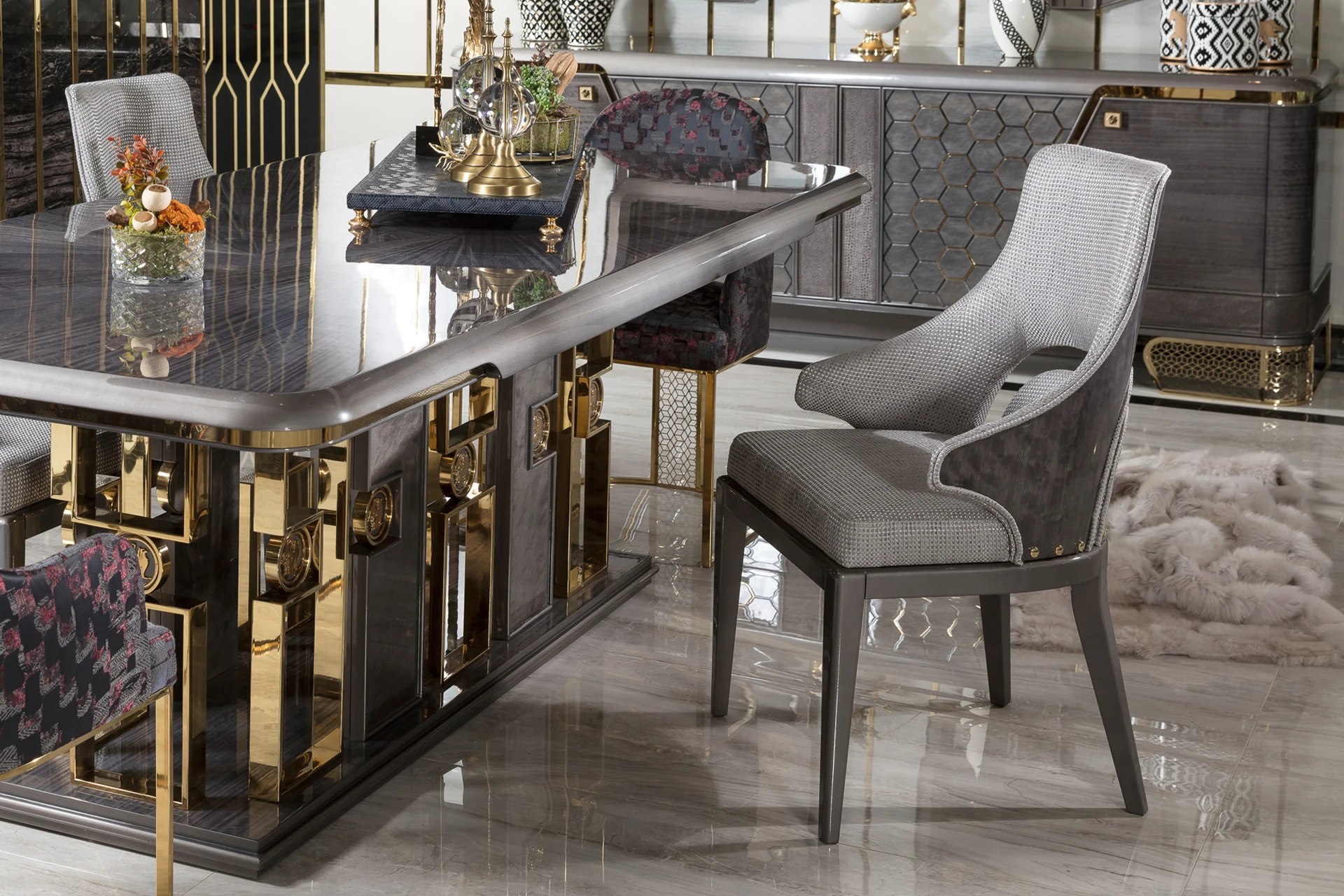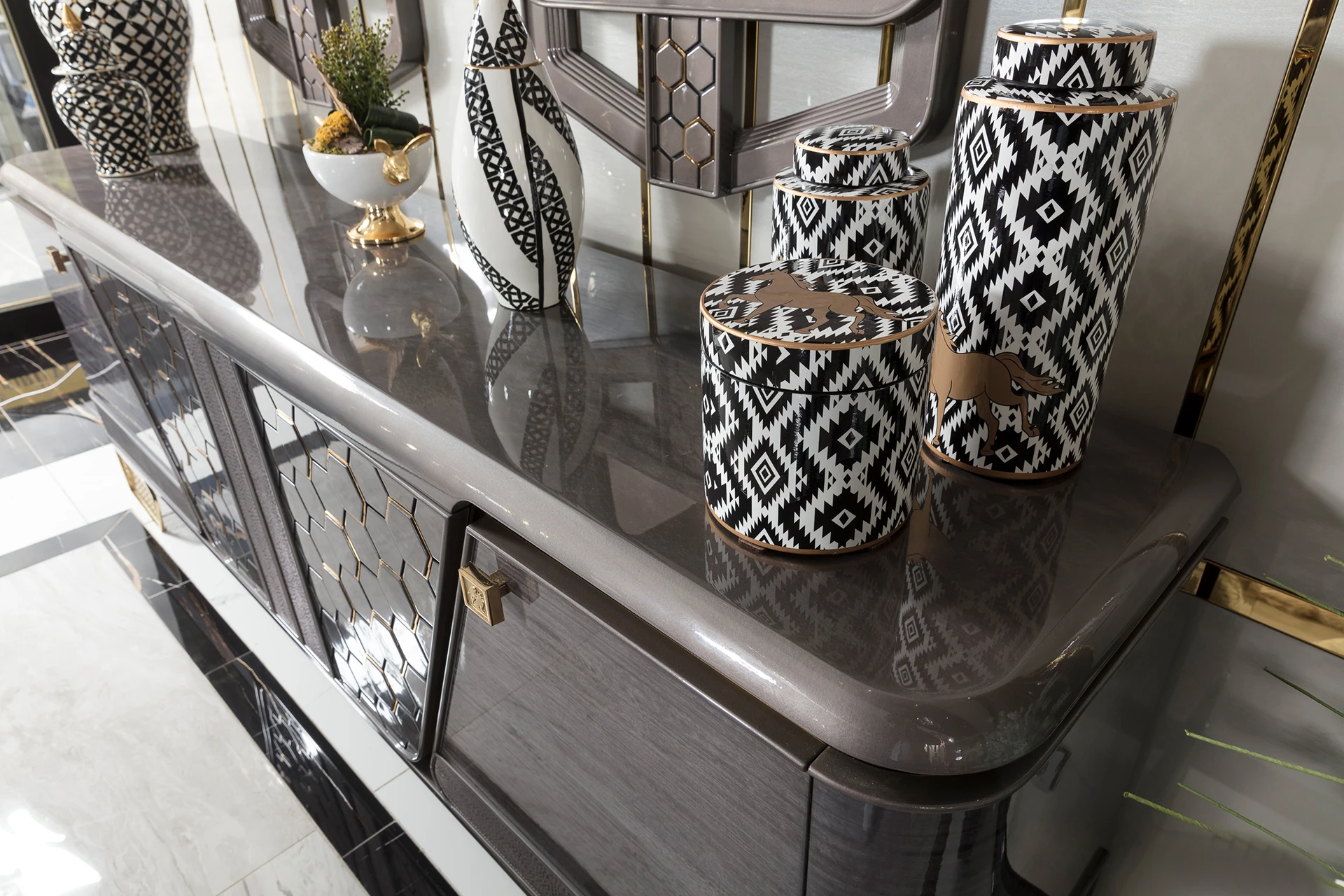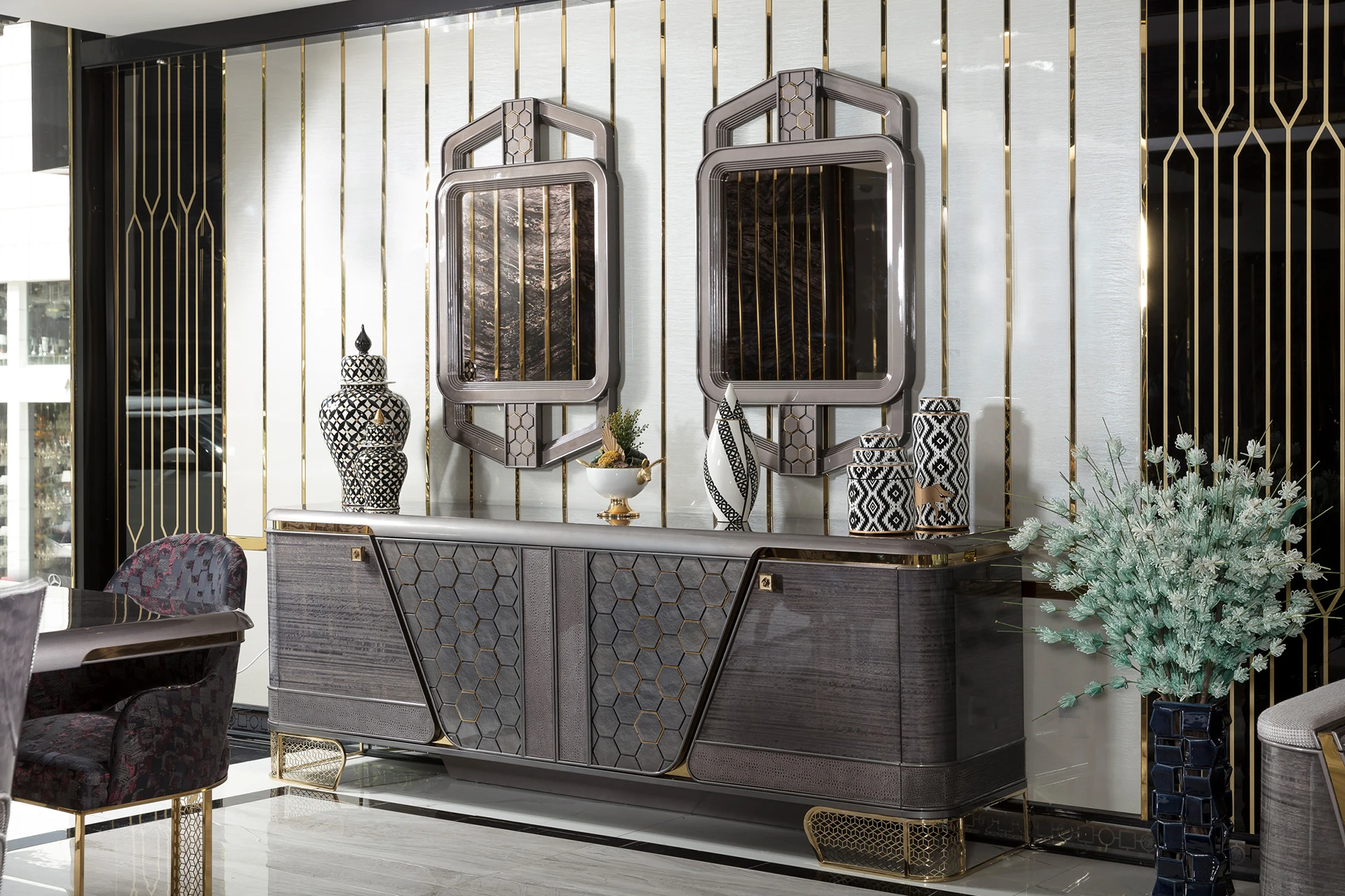 The icon Dining room set redefines contemporary elegance with its bold design and luxurious details. The table features a sleek, high-gloss finish and is complemented by chairs upholstered in plush fabric with unique patterns. The sideboard boasts a geometric motif, enhanced with metallic accents that add an opulent touch. Decorative elements, including stylish mirrors and a sophisticated decor display, further amplify the modern aesthetic. This set is the perfect blend of function and fashion, creating an inviting dining space for memorable gatherings.