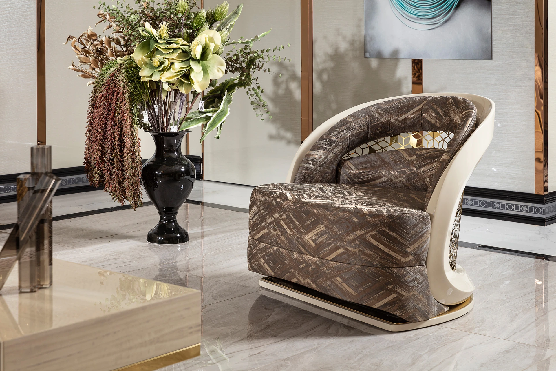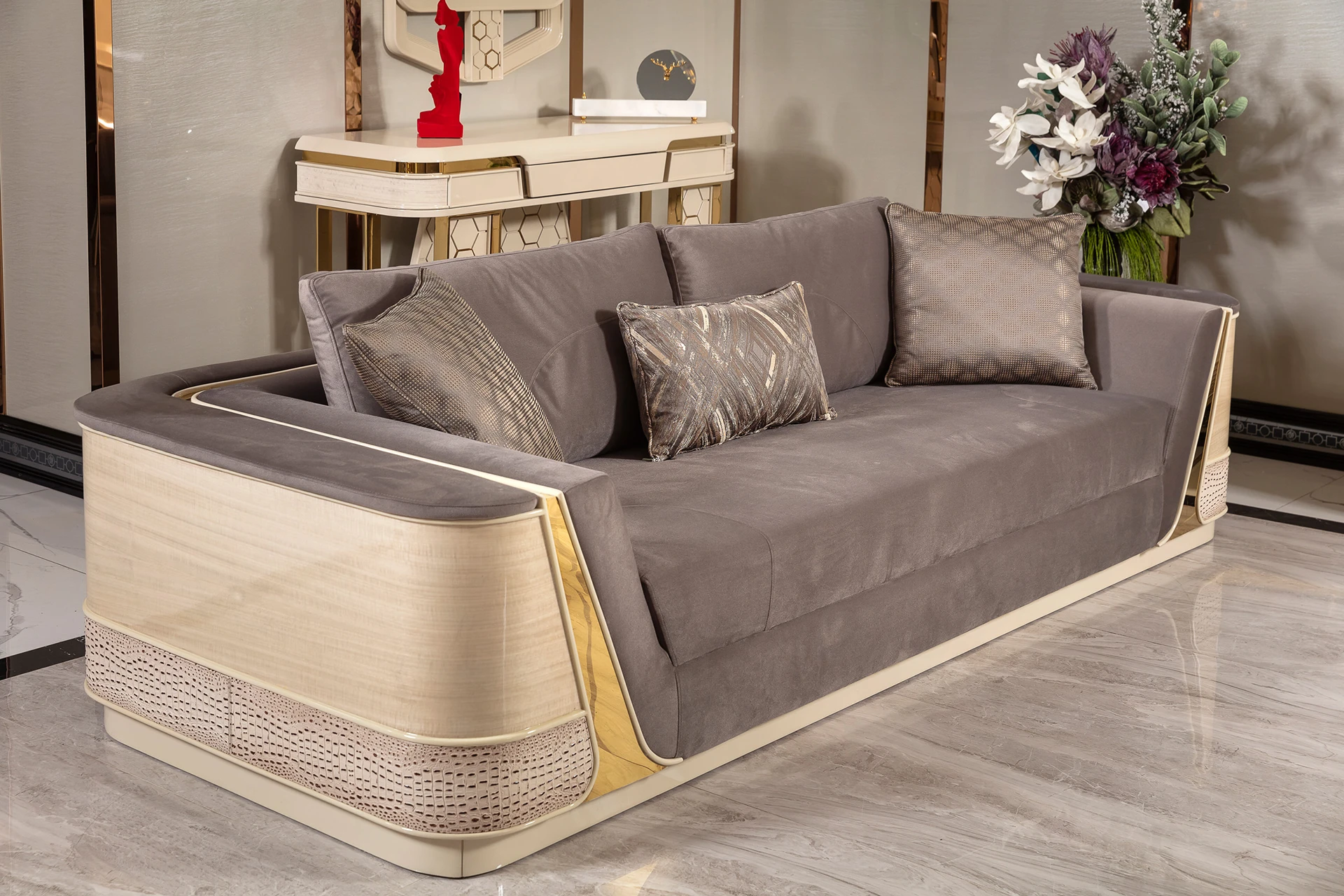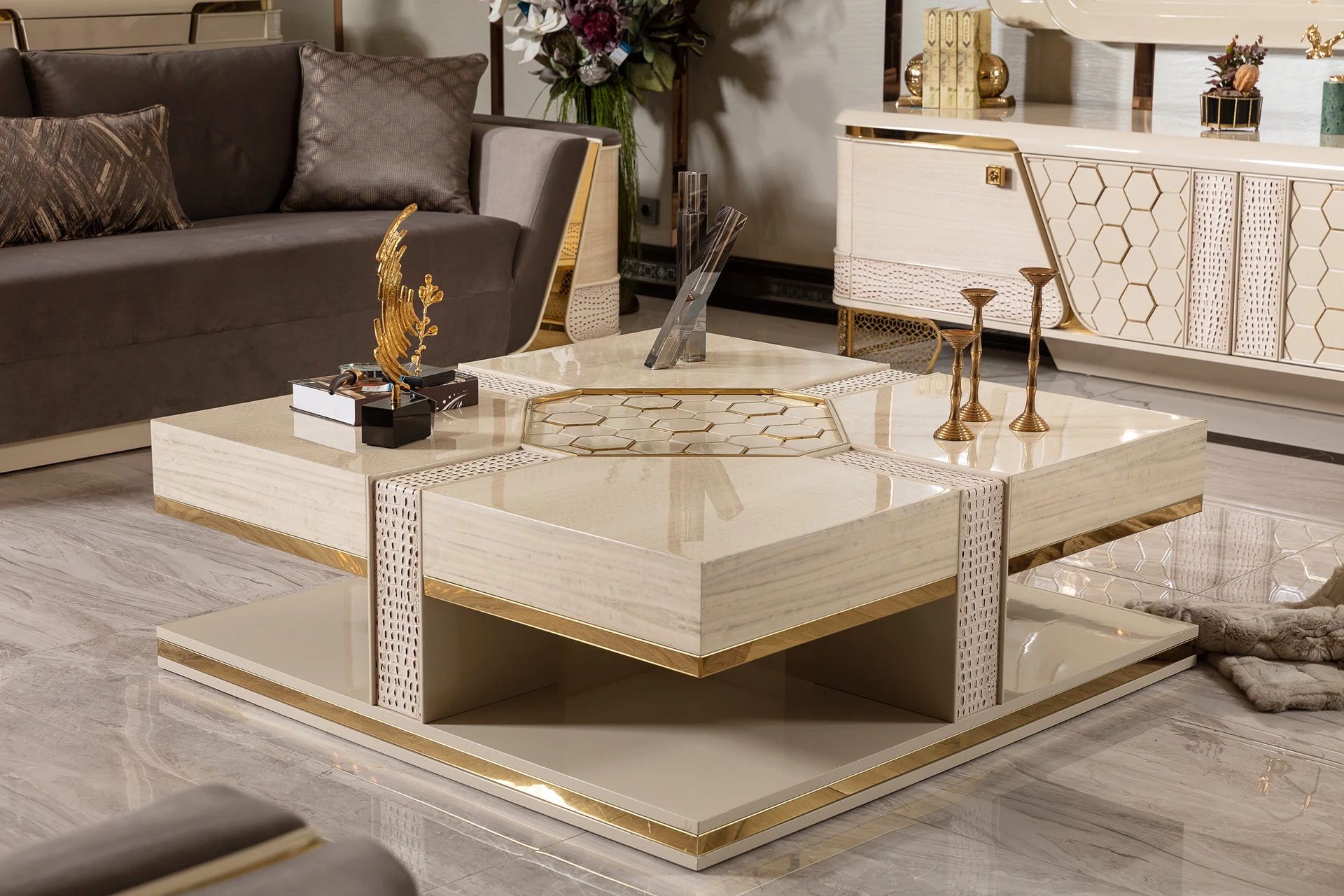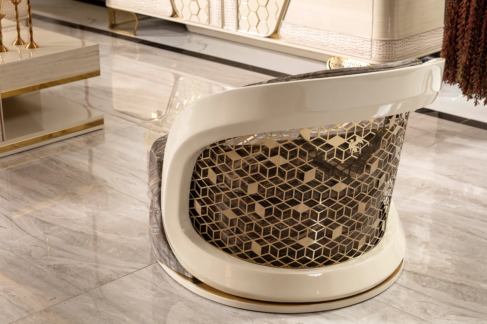Redefine your living space with the Icon white sofa set’s modern elegance. Featuring a sleek design with soft, muted tones, this set brings sophistication and comfort to any room. The sofa’s plush cushions and uniquely curved arms provide a luxurious seating experience, while the accompanying chairs boast a stunning geometric backrest design that adds a touch of artistic flair. A polished center table with intricate patterns completes the look, making this set a perfect choice for those who appreciate both style and functionality. Transform your living room into a haven of contemporary chic.