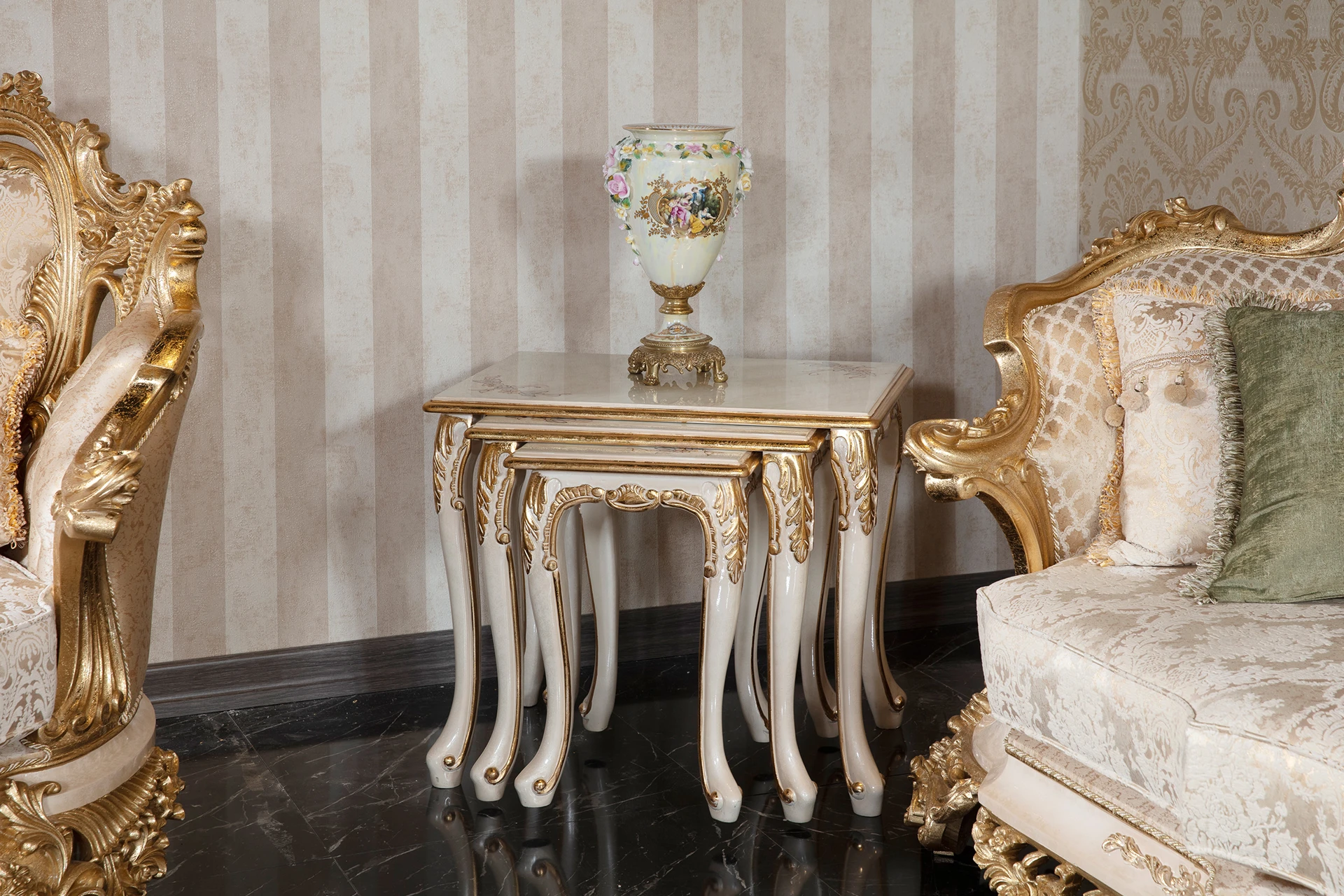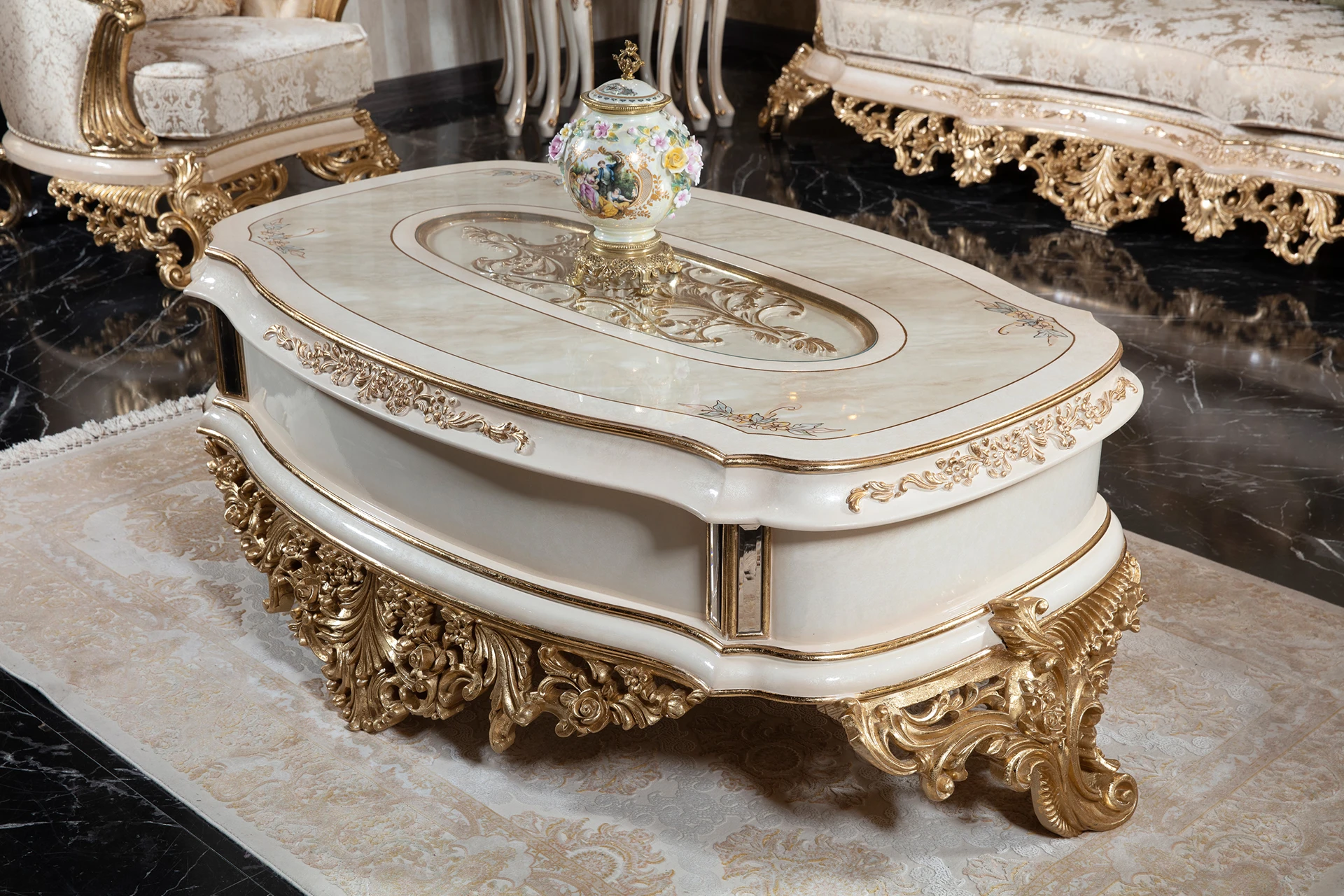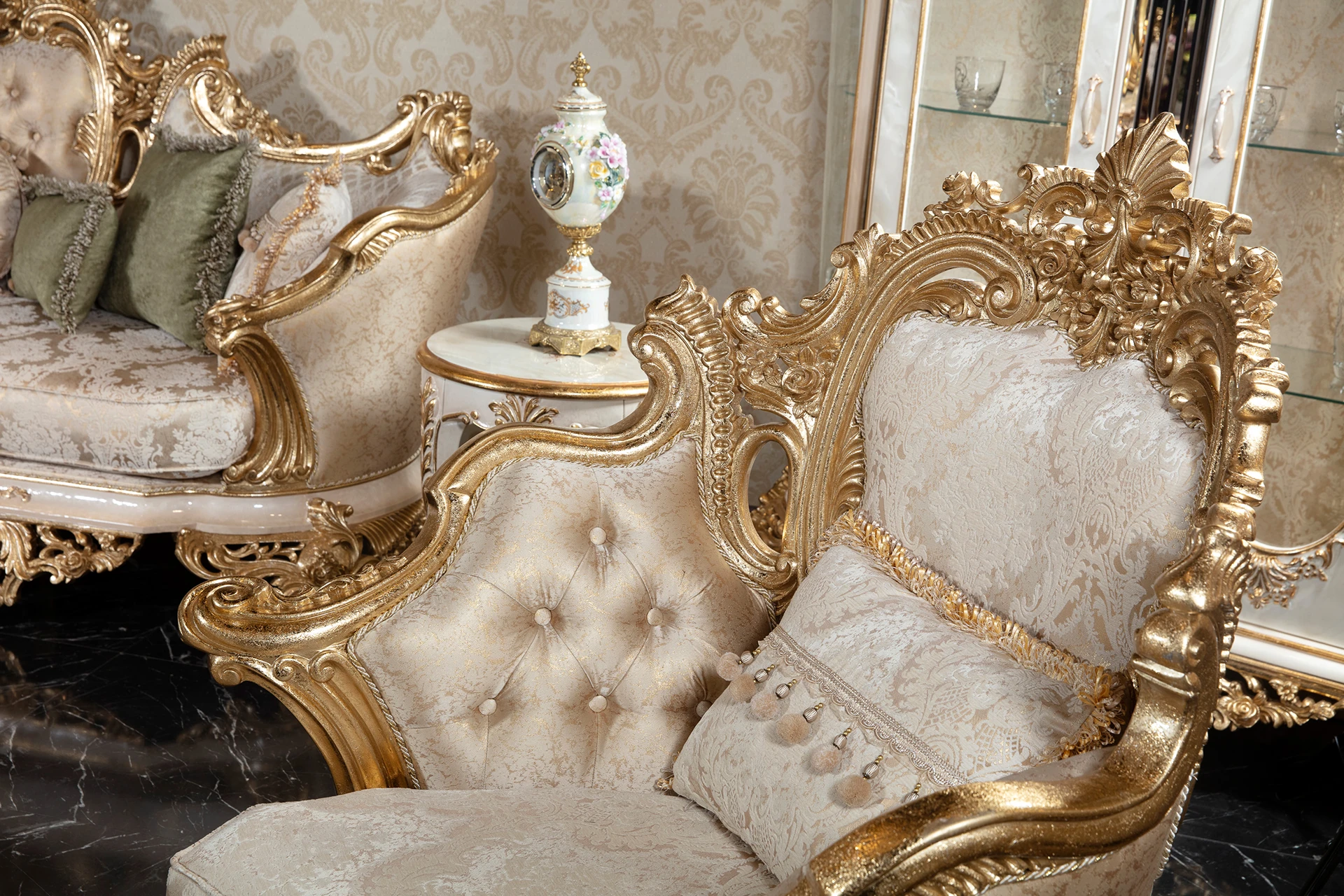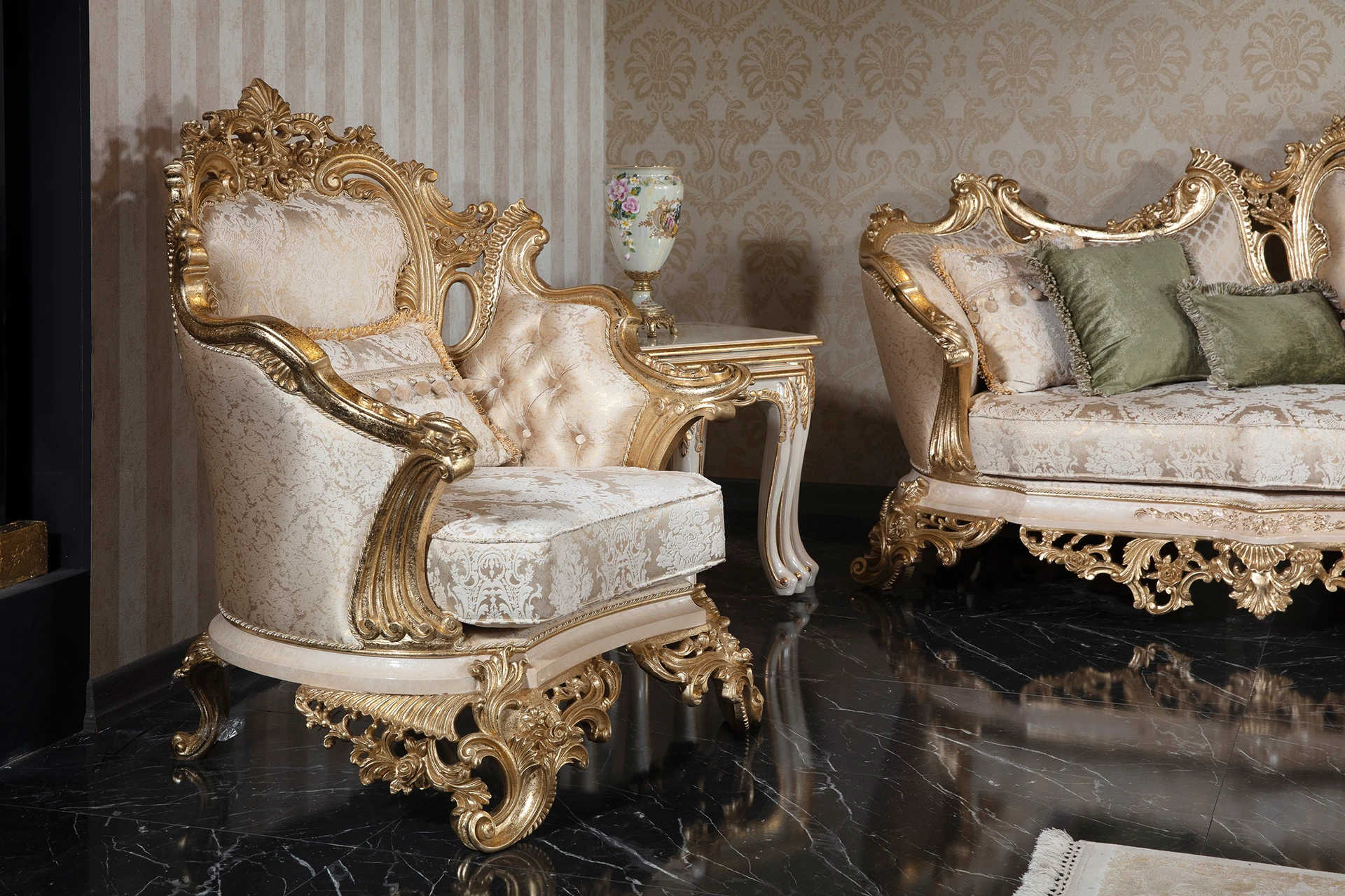 The Imparator sofa set combines timeless elegance with exquisite craftsmanship. This luxurious living room set features intricate detailing and ornate carvings, bringing a sense of grandeur to any space. Upholstered in premium fabrics, the plush cushions offer exceptional comfort while maintaining an opulent appearance. The rich gold accents and meticulously designed armrests elevate the aesthetic, making this set a true statement piece for those who appreciate traditional luxury. Perfect for creating a sophisticated atmosphere, the Imparator sofa set is designed to impress and add a royal touch to your home decor.