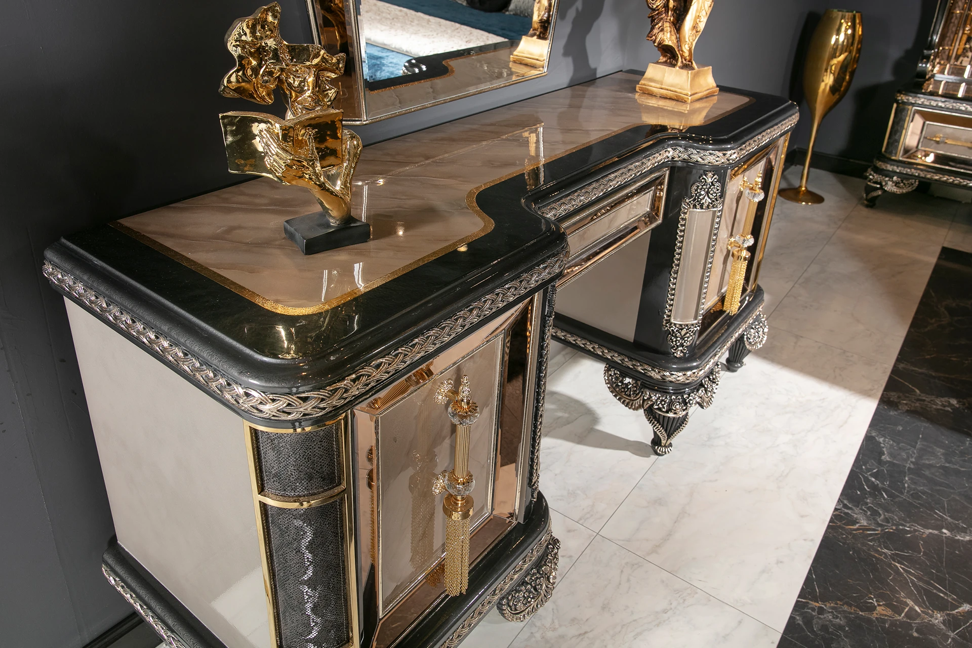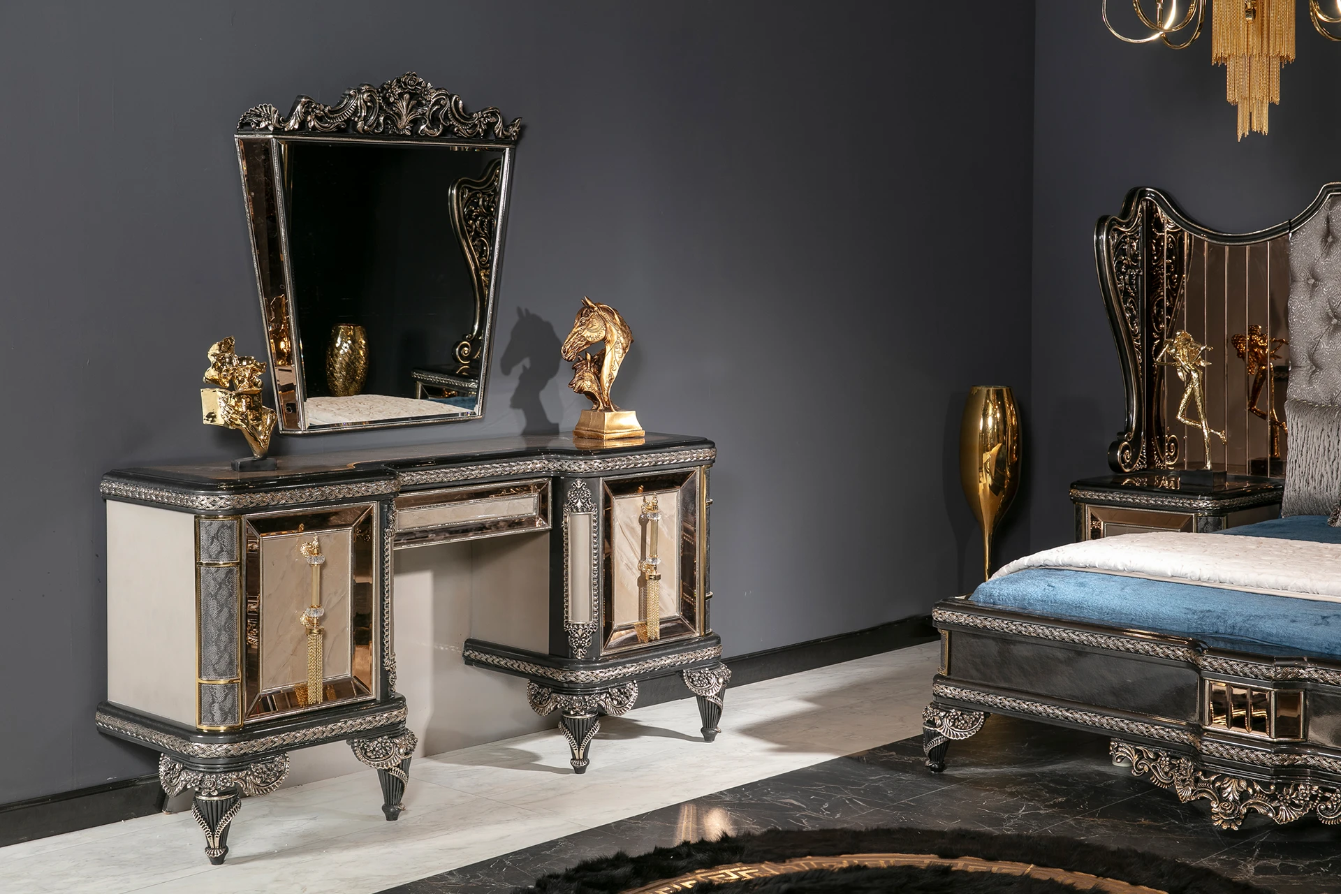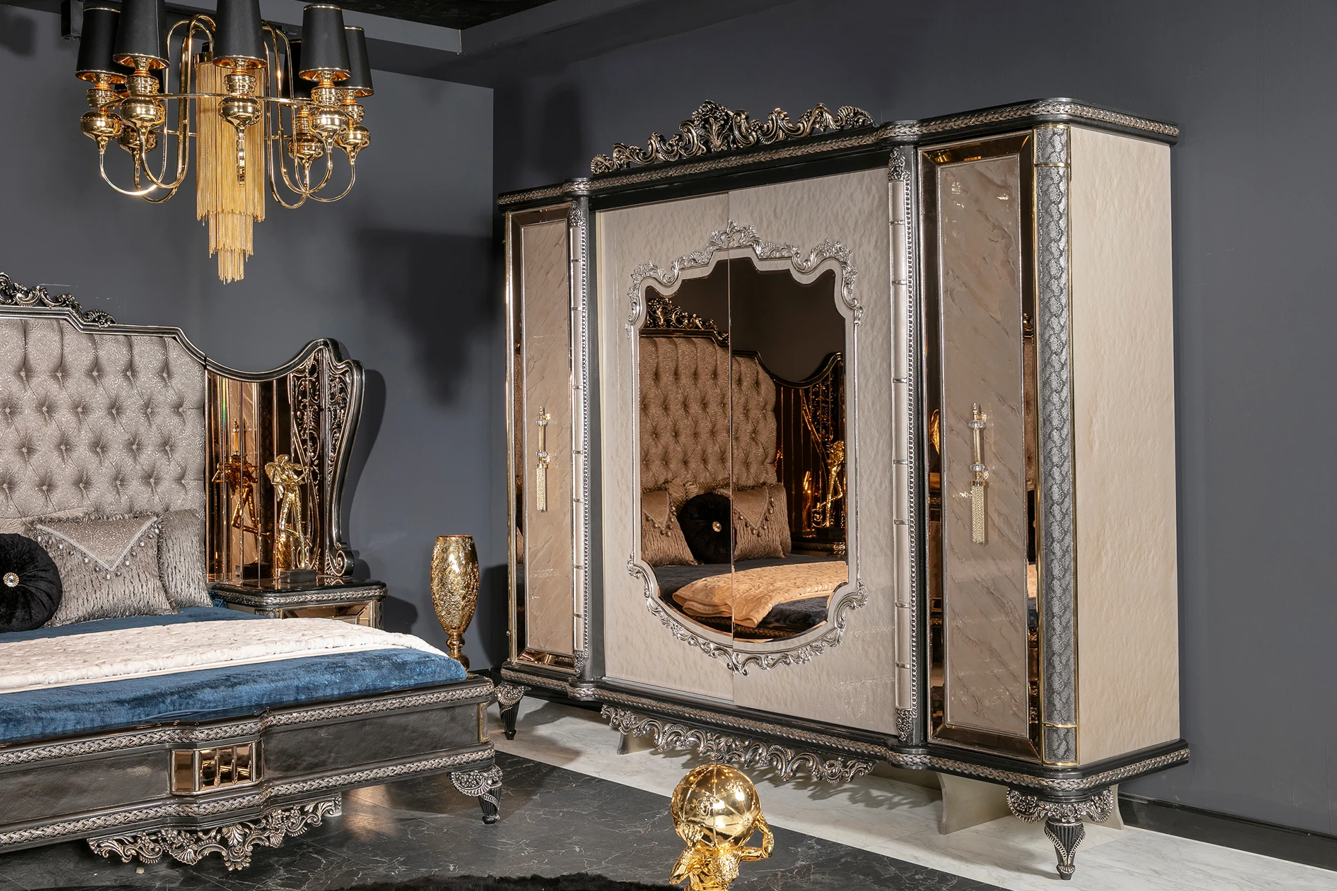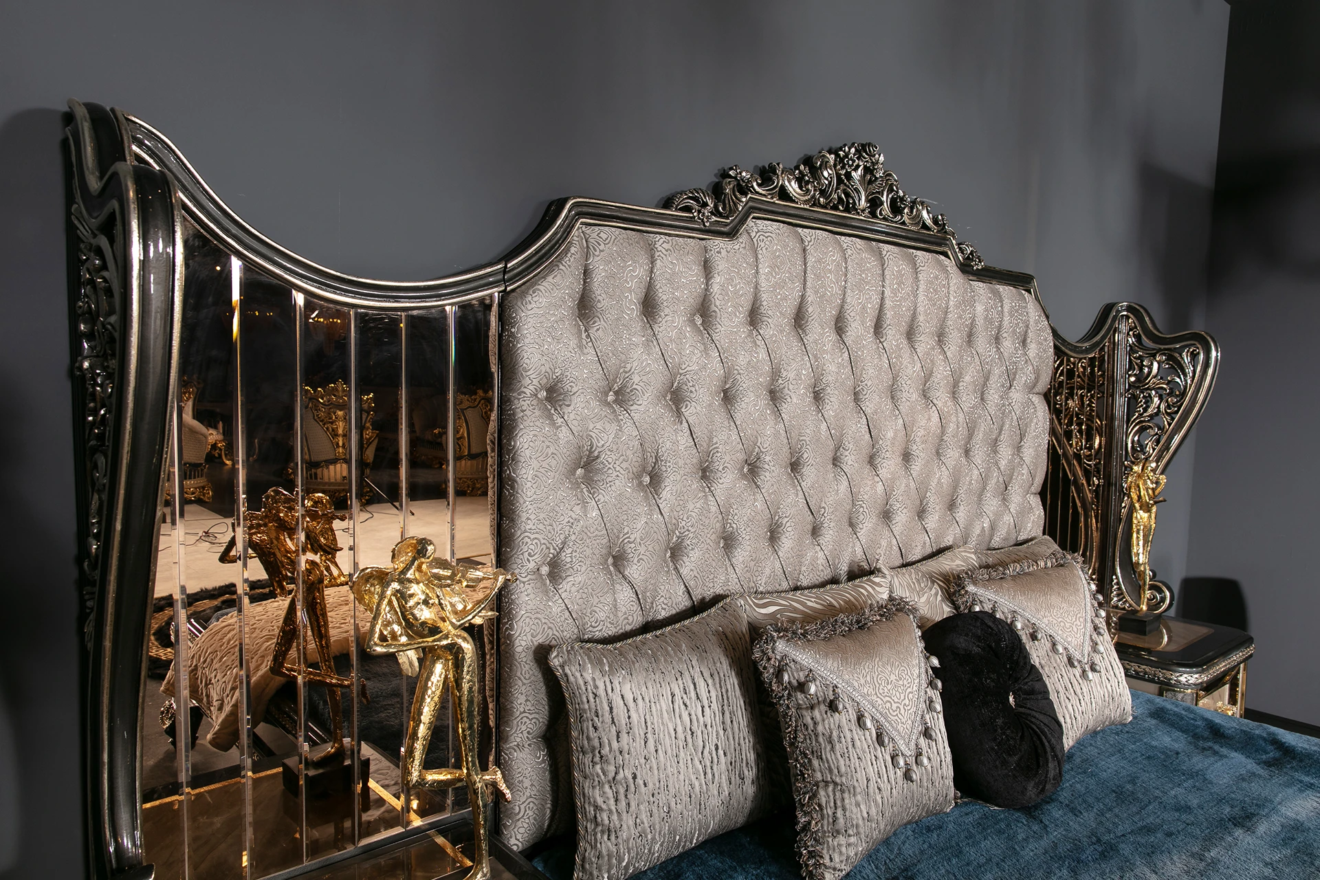 The Inci bedroom set is the epitome of luxury and elegance, designed to create a sophisticated atmosphere in your personal sanctuary. Featuring a grand tufted headboard with intricate detailing, this set brings regal opulence to any bedroom. The mirrored accents and silver embellishments enhance the room’s sense of depth and grandeur, while the plush fabrics provide exceptional comfort. The wardrobe and nightstands, adorned with ornate carvings and metallic finishes, complete the luxurious look. With its exquisite craftsmanship and timeless design, the Inci Bedroom Set transforms your bedroom into a haven of elegance and style.