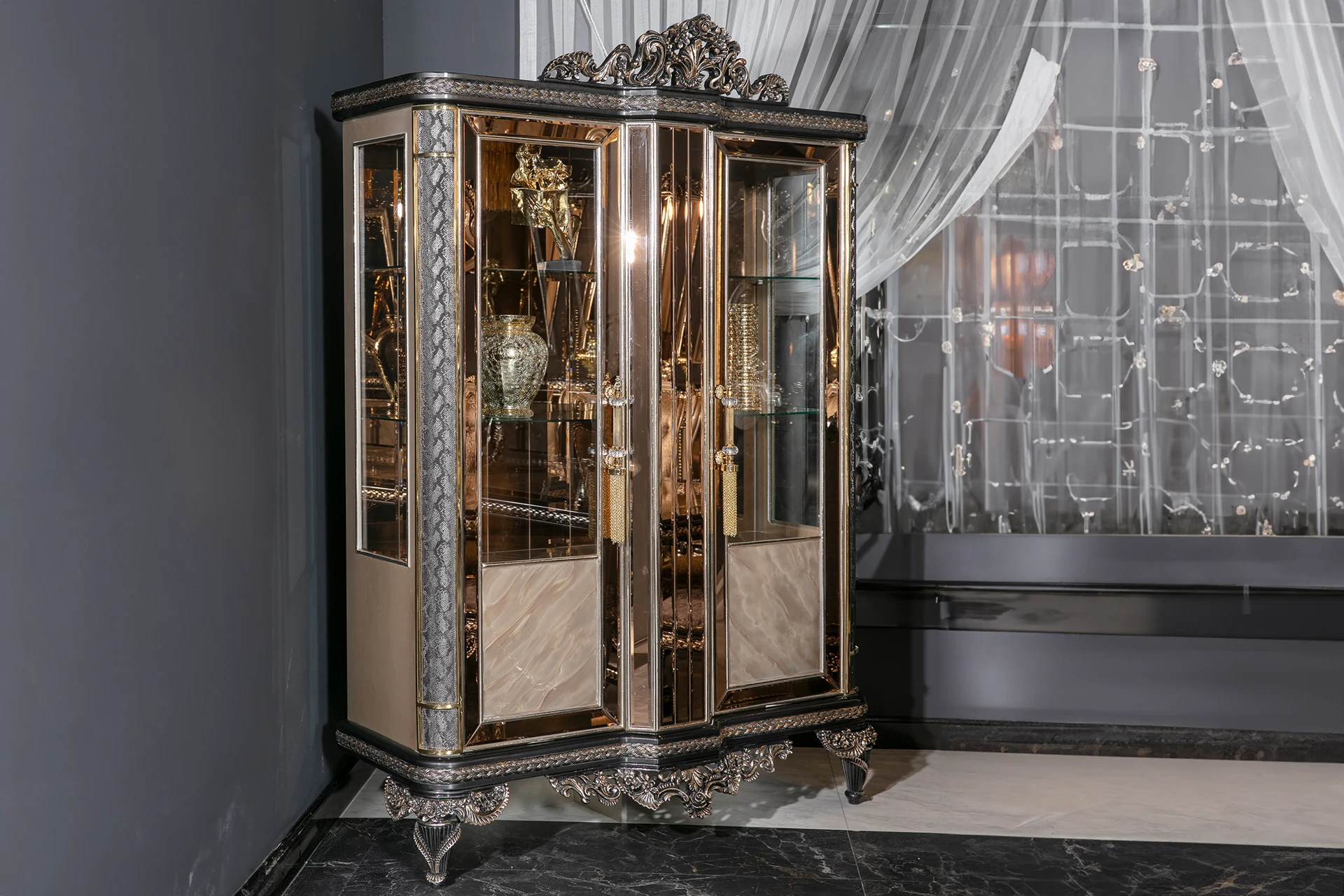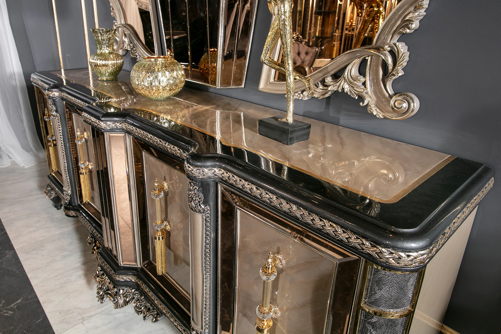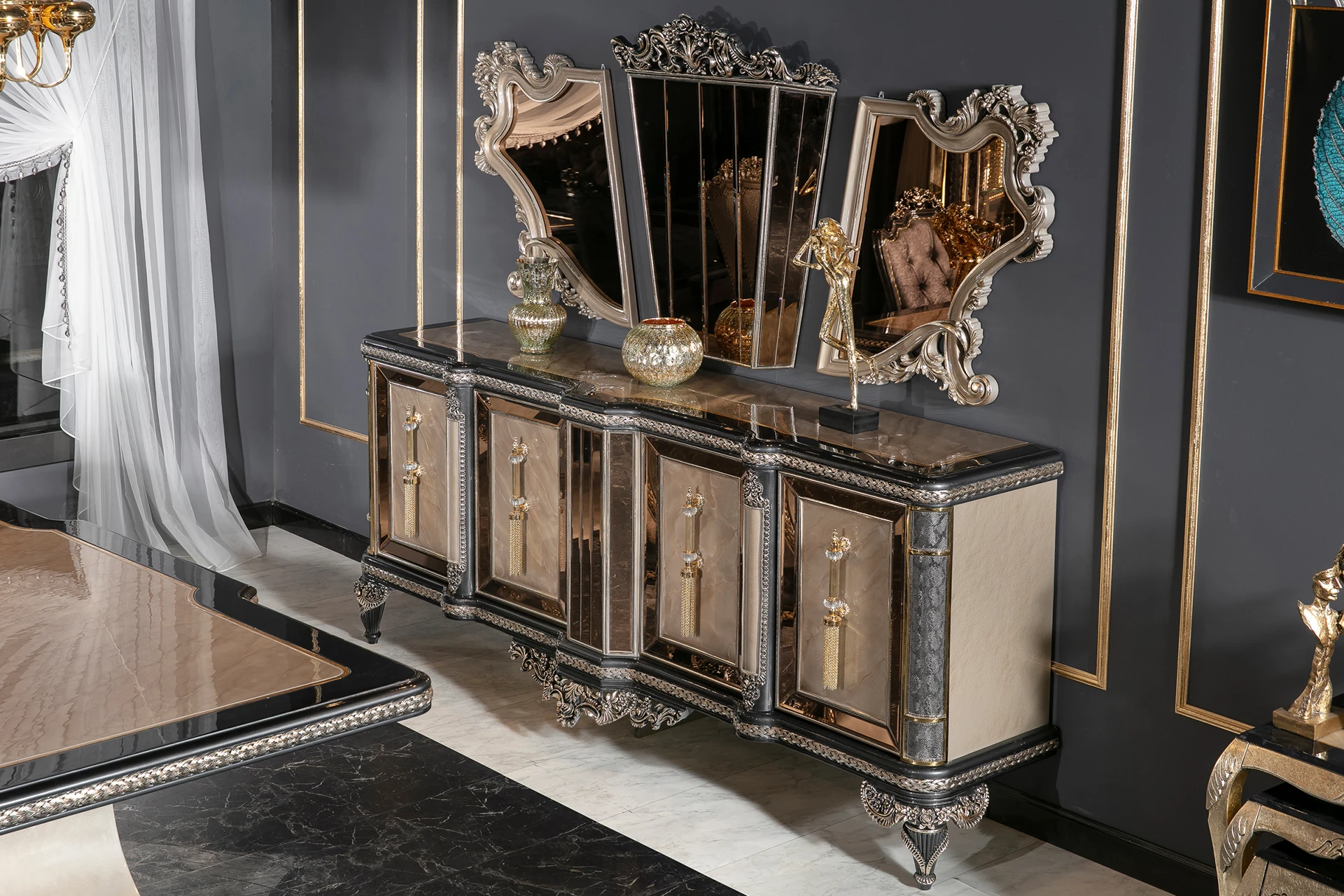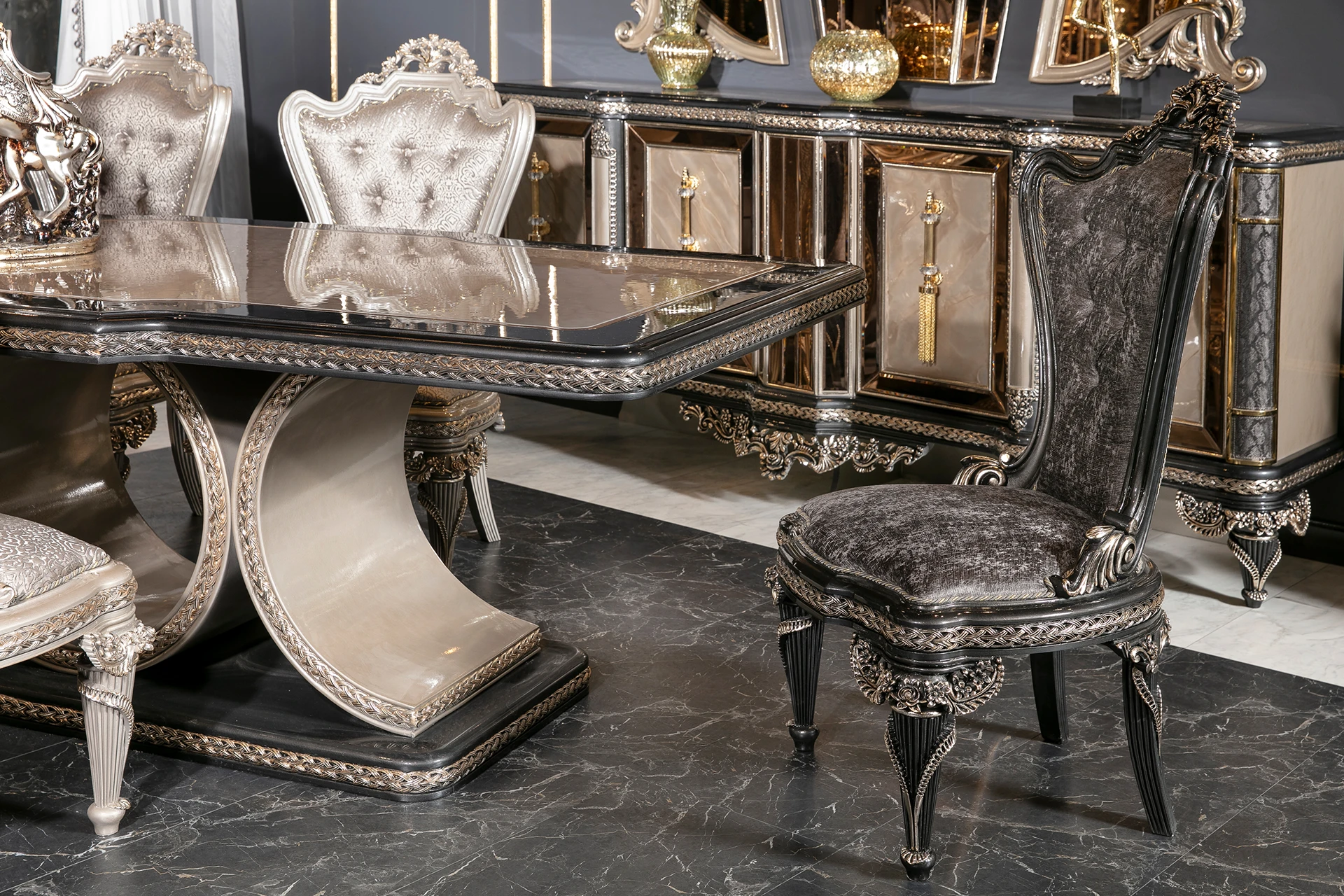 The Inci dining room set exudes opulence and sophistication, perfect for creating a grand dining experience. Featuring intricately carved silver details and luxurious upholstered chairs, this set is designed to be the focal point of any elegant home. The glossy table with its sculpted base adds a modern touch to the classic design, while the mirrored buffet and ornate display cabinet enhance the room with their regal charm. Every element of the Inci Dining Room Set is crafted to perfection, blending traditional craftsmanship with contemporary luxury, ensuring an unforgettable dining ambiance for your home.