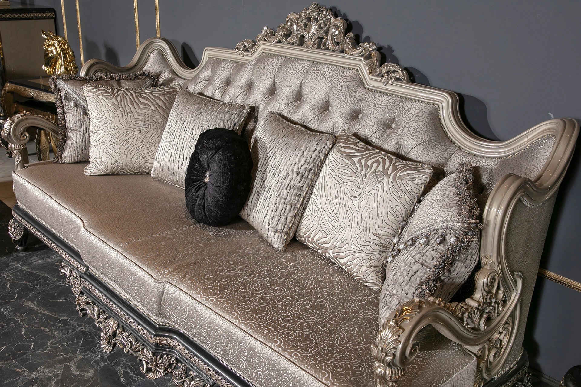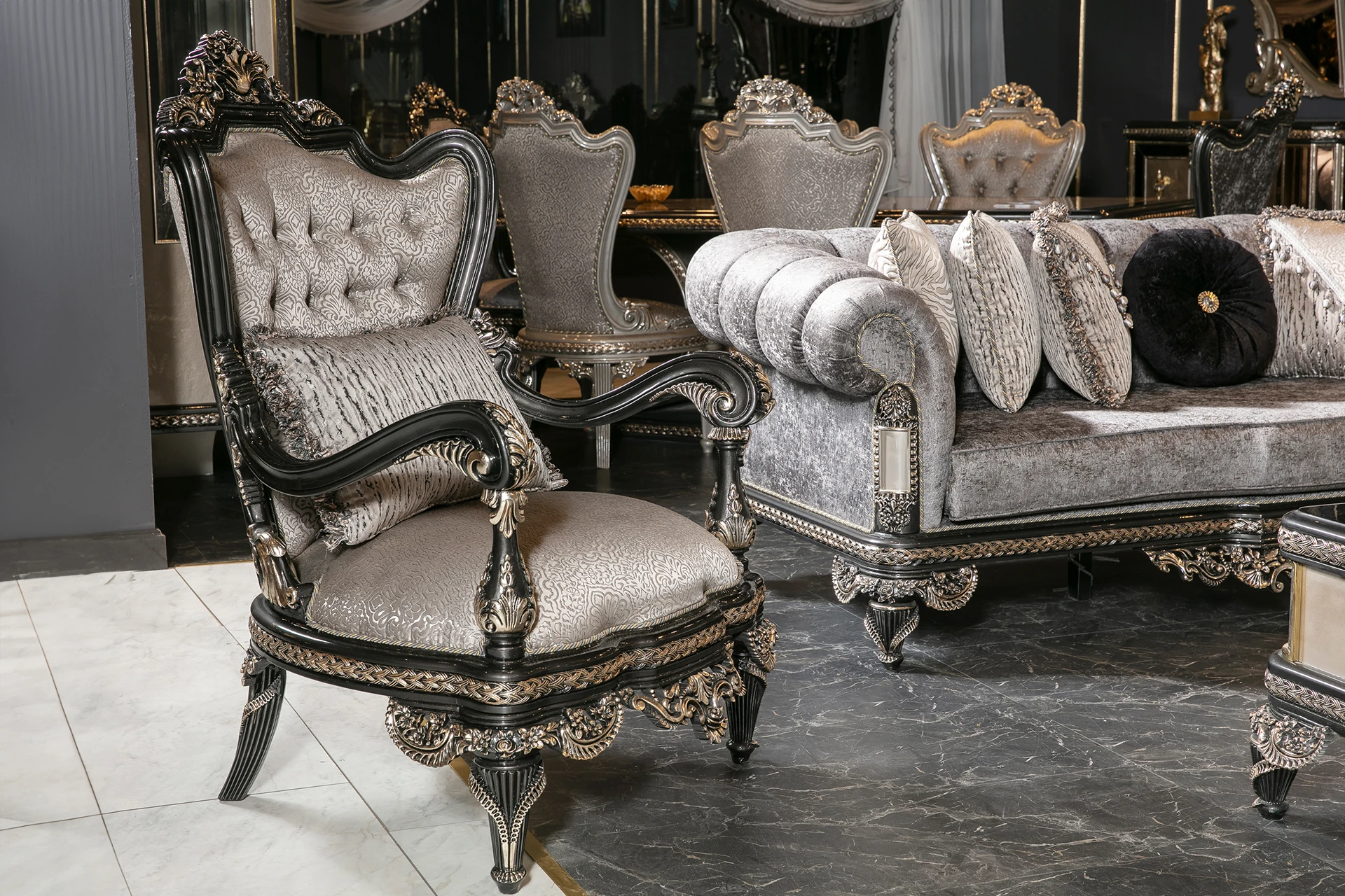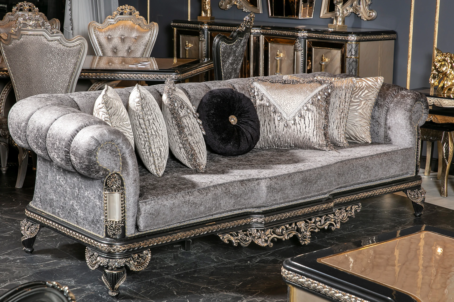 The Inci sofa set embodies timeless elegance with a modern twist, offering a luxurious touch to any living space. Its rich silver upholstery, paired with intricate hand-carved details, brings an air of sophistication and grandeur. The deep cushions provide exceptional comfort, while the subtle metallic accents add a refined charm. Designed with both beauty and functionality in mind, the Inci Sofa Set is perfect for those who appreciate classic craftsmanship combined with modern aesthetics. The ornate frames and elegant design make this set a centerpiece for any luxurious home, transforming your living room into a statement of style and comfort.