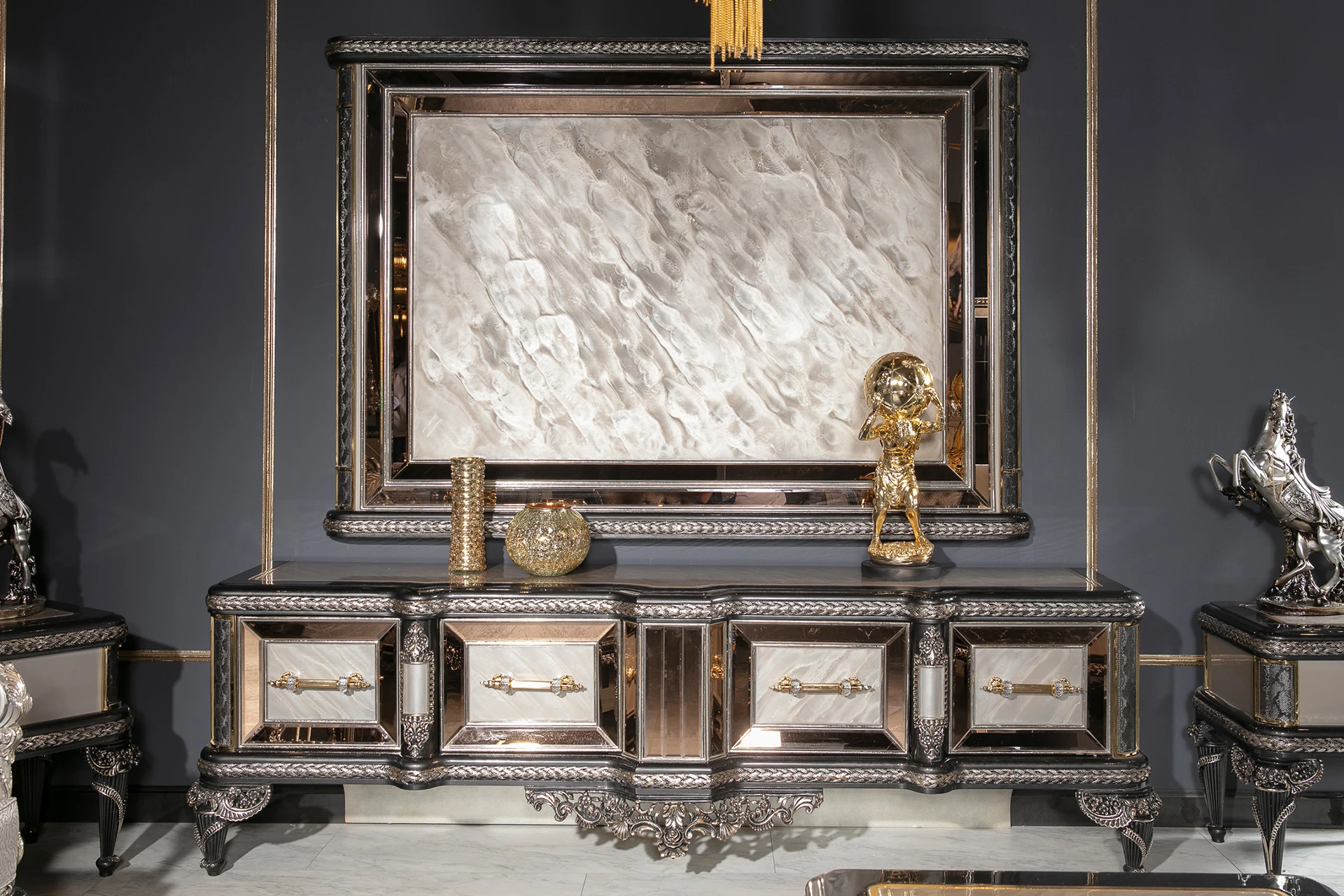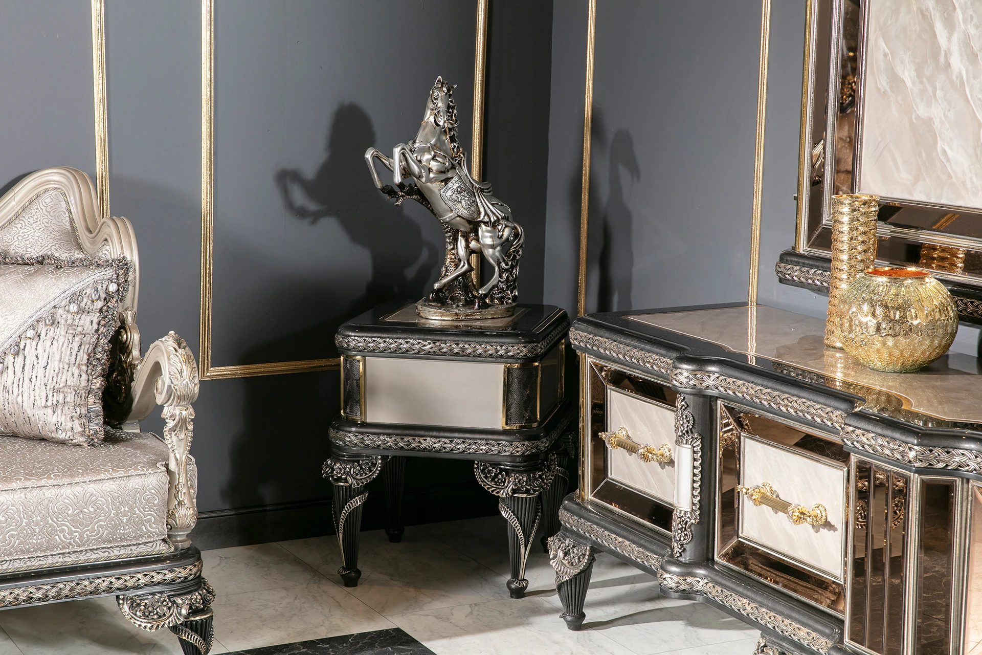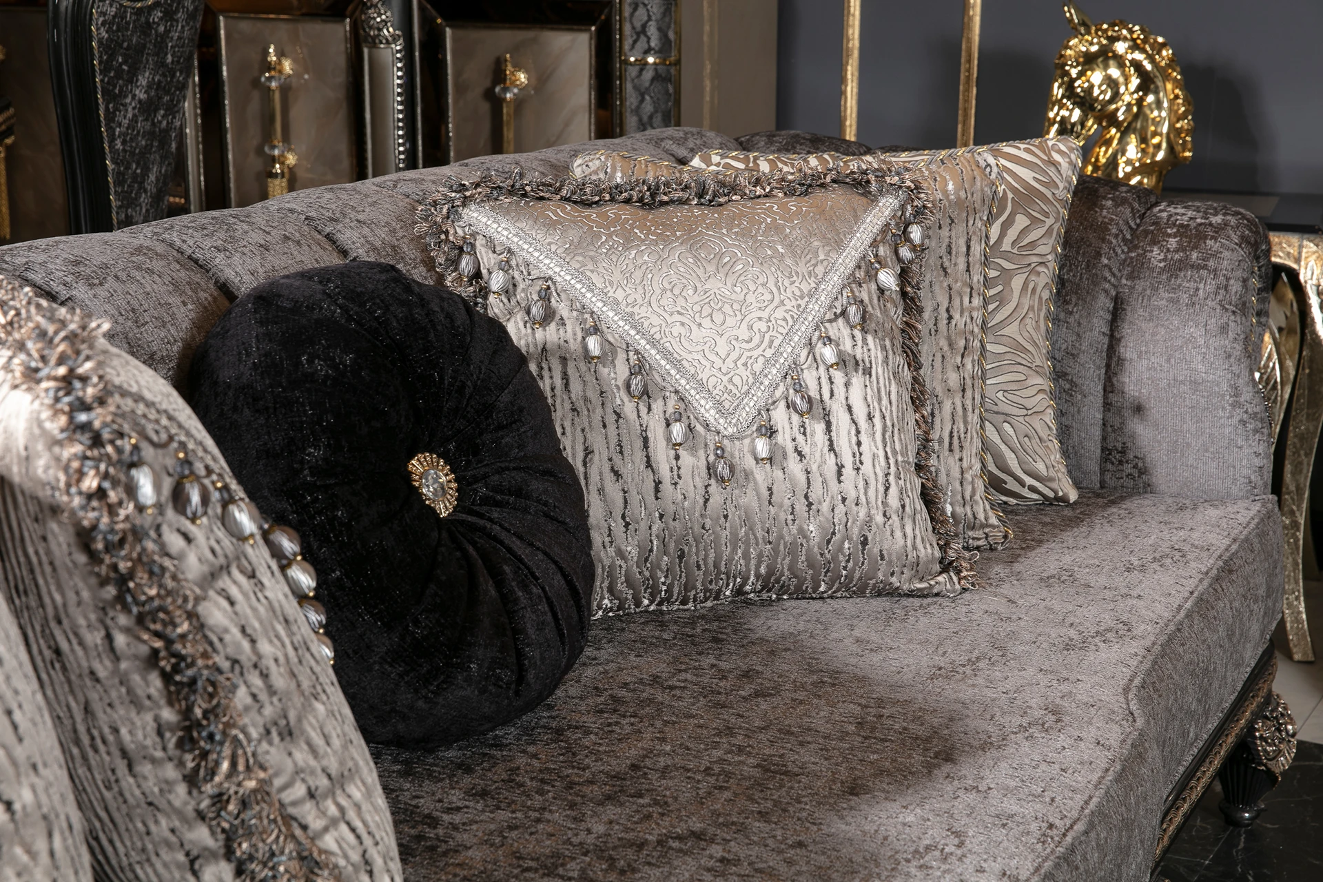 The Inci sofa set embodies timeless elegance with a modern twist, offering a luxurious touch to any living space. Its rich silver upholstery, paired with intricate hand-carved details, brings an air of sophistication and grandeur. The deep cushions provide exceptional comfort, while the subtle metallic accents add a refined charm. Designed with both beauty and functionality in mind, the Inci Sofa Set is perfect for those who appreciate classic craftsmanship combined with modern aesthetics. The ornate frames and elegant design make this set a centerpiece for any luxurious home, transforming your living room into a statement of style and comfort.