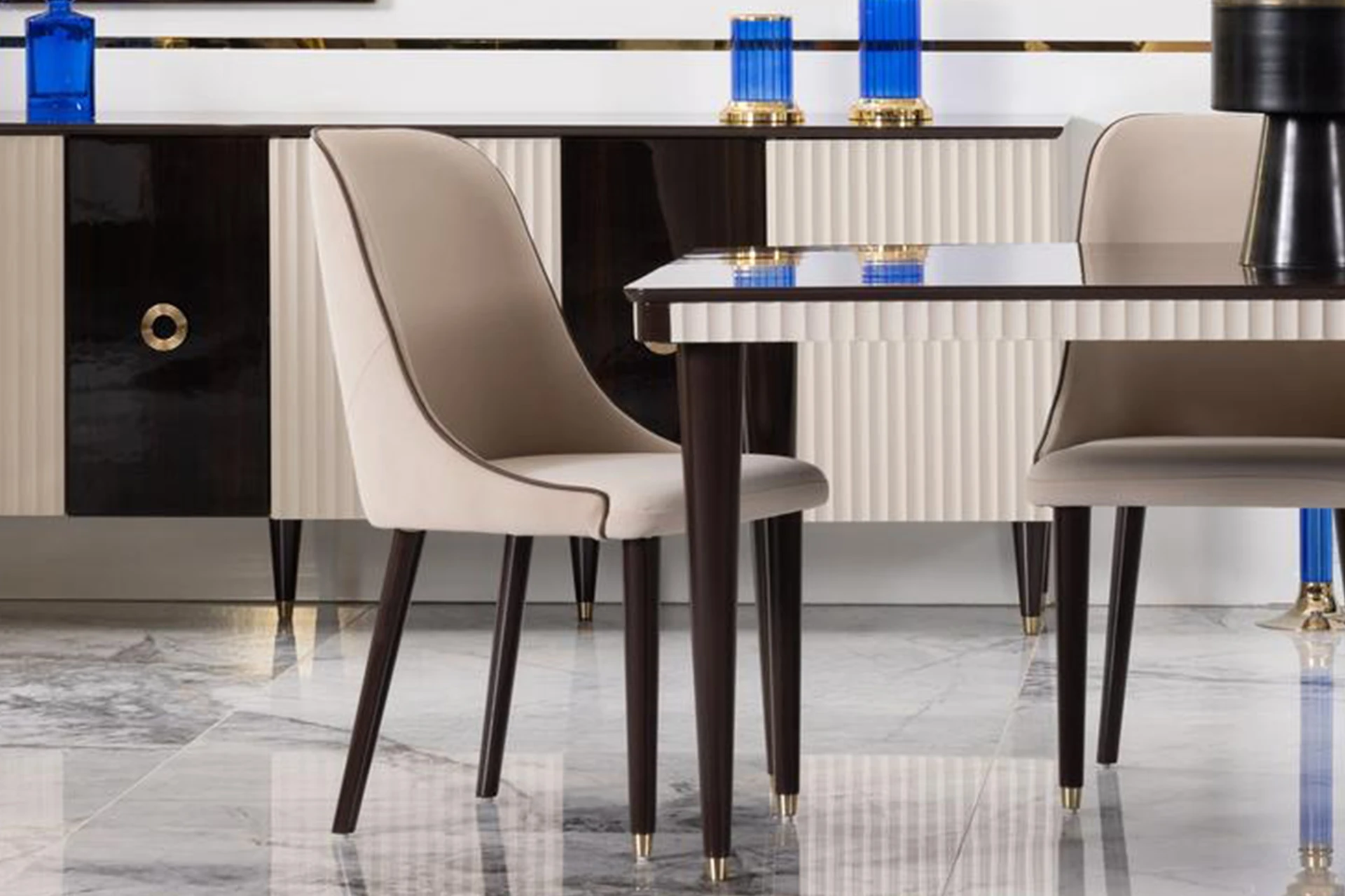 The Istanbul dining room set is a statement of contemporary elegance. It features a sleek dining table with a dark wooden finish and soft beige chairs with curved backrests, offering both comfort and style. The chairs’ minimalist design is complemented by slender, tapering legs, adding a refined touch to the set. The buffet cabinet mirrors this sophistication, featuring a combination of glossy surfaces and subtle gold accents. A hint of blue decor pieces contrasts beautifully against the neutral tones, making this set an exquisite choice for modern dining spaces.