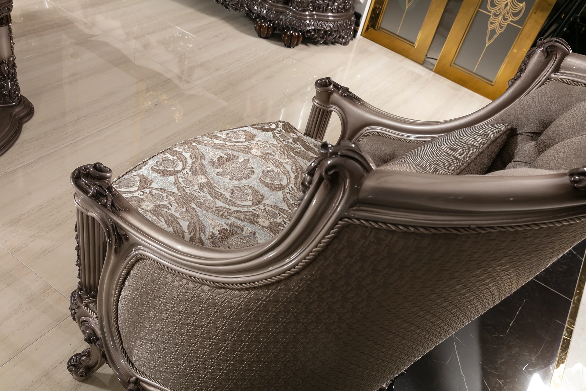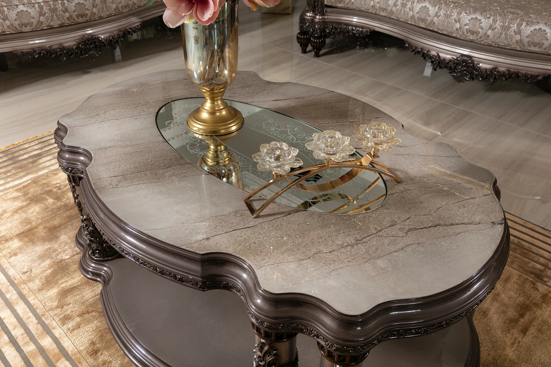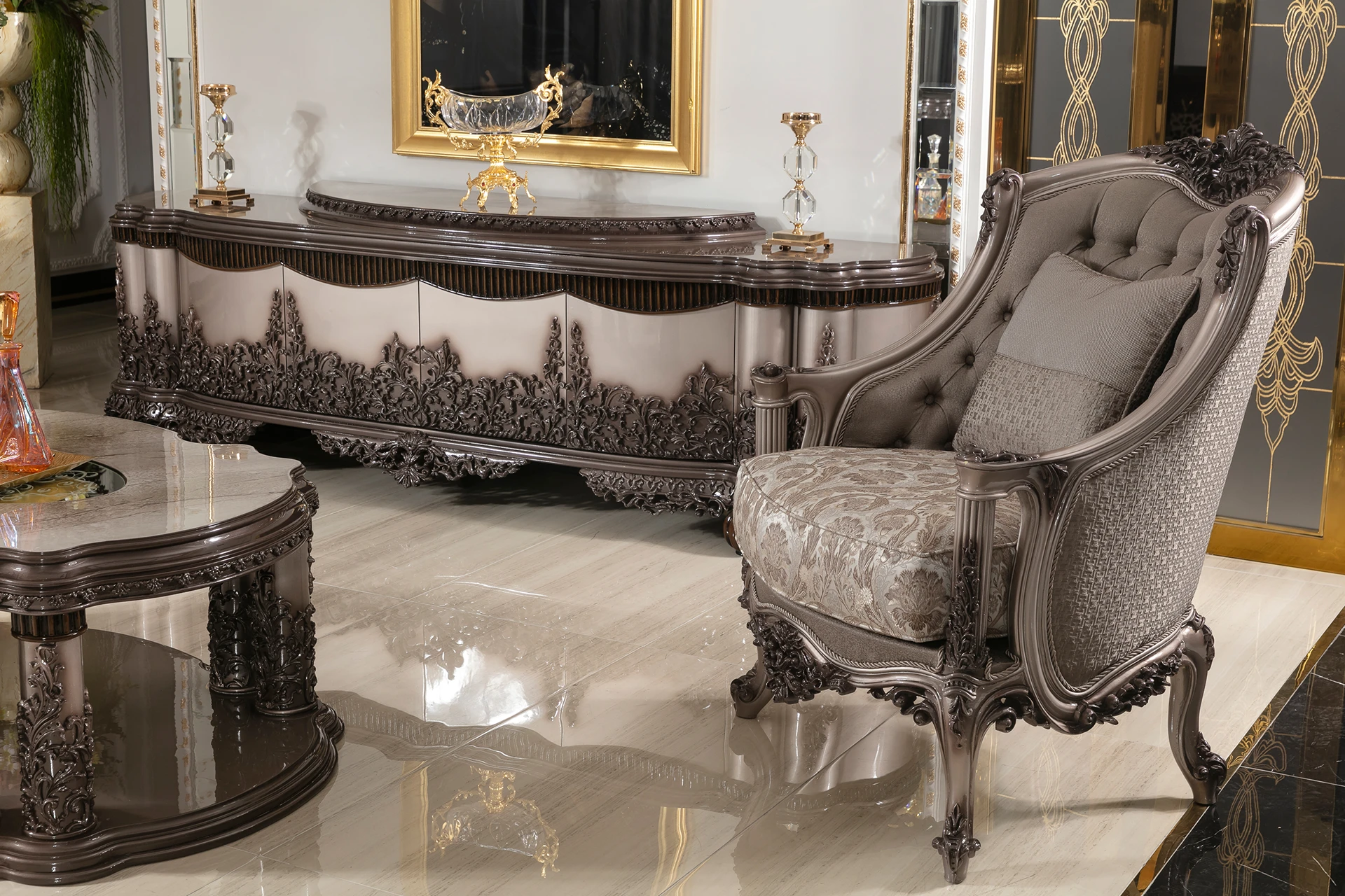 The Kaduna sofa set embodies luxury with its intricate carvings and elegant curves. Upholstered in sumptuous fabric with detailed patterns, this set brings an air of sophistication to any living space. The sofas are adorned with plush cushions for added comfort, while the deep-buttoned backrests highlight classic design elements. The armchairs mirror the grandeur of the sofas, completing the ensemble. A perfectly coordinated coffee table with an elaborate carved base serves as the centerpiece, enhancing the room’s opulence. Ideal for those who seek timeless elegance in their living room.